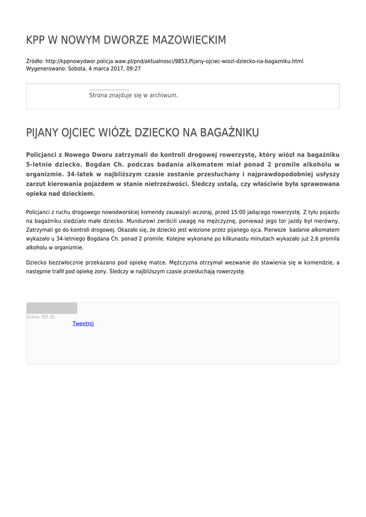 KPP W NOWYM DWORZE MAZOWIECKIM Źródło: http://kppnowydwor.policja.waw.pl/pnd/aktualnosci/9853,Pijany-ojciec-wiozl-dziecko-na-bagazniku.html Wygenerowano: Sobota, 4 marca 2017, 09:27 Strona znajduje się w archiwum. PIJANY OJCIEC WIÓZŁ DZIECKO NA BAGAŻNIKU Policjanci z Nowego Dworu zatrzymali do kontroli drogowej rowerzystę, który wiózł na bagażniku 5-letnie dziecko. Bogdan Ch. podczas badania alkomatem miał ponad 2 promile alkoholu w organizmie. 34-latek w najbliższym czasie zostanie przesłuchany i najprawdopodobniej usłyszy zarzut kierowania pojazdem w stanie nietrzeźwości. Śledczy ustalą, czy właściwie była sprawowana opieka nad dzieckiem. Policjanci z ruchu drogowego nowodworskiej komendy zauważyli wczoraj, przed 15:00 jadącego rowerzystę. Z tyłu pojazdu na bagażniku siedziało małe dziecko. Mundurowi zwrócili uwagę na mężczyznę, ponieważ jego tor jazdy był nierówny. Zatrzymali go do kontroli drogowej. Okazało się, że dziecko jest wiezione przez pijanego ojca. Pierwsze badanie alkomatem wykazało u 34-letniego Bogdana Ch. ponad 2 promile. Kolejne wykonane po kilkunastu minutach wykazało już 2,6 promila alkoholu w organizmie. Dziecko bezzwłocznie przekazano pod opiekę matce. Mężczyzna otrzymał wezwanie do stawienia się w komendzie, a następnie trafił pod opiekę żony. Śledczy w najbliższym czasie przesłuchają rowerzystę. Ocena: 0/5 (0) Tweetnij