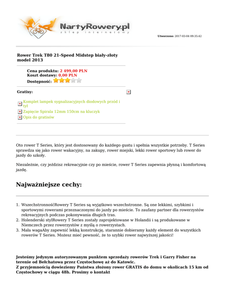 Utworzono: 2017-03-04 09:35:42 Rower Trek T80 21-Speed Midstep biały-złoty model 2013 Cena produktu: 2 499,00 PLN Koszt dostawy: 0,00 PLN Dostępność: Gratisy: Komplet lampek sygnalizacyjnych diodowych przód i tył Zapięcie Spirala 12mm 150cm na kluczyk Opis do gratisów Oto rower T Series, który jest dostosowany do każdego gustu i spełnia wszystkie potrzeby. T Series sprawdza się jako rower wakacyjny, na zakupy, rower miejski, lekki rower sportowy lub rower do jazdy do szkoły. Niezależnie, czy jeździsz rekreacyjnie czy po mieście, rower T Series zapewnia płynną i komfortową jazdę. Najważniejsze cechy: 1. WszechstronnośćRowery T Series są wyjątkowo wszechstronne. Są one lekkimi, szybkimi i sportowymi rowerami przeznaczonymi do jazdy po mieście. To zaufany partner dla rowerzystów rekreacyjnych podczas pokonywania długich tras. 2. Holenderski stylRowery T Series zostały zaprojektowane w Holandii i są produkowane w Niemczech przez rowerzystów z myślą o rowerzystach. 3. Mała wagaAby zapewnić lekką konstrukcję, starannie dobieramy każdy element do wszystkich rowerów T Series. Możesz mieć pewność, że to szybki rower najwyższej jakości! Jesteśmy jedynym autoryzowanym punktem sprzedaży rowerów Trek i Garry Fisher na terenie od Bełchatowa przez Częstochowę aż do Katowic. Z przyjemnością dowieziemy Państwa złożony rower GRATIS do domu w okolicach 15 km od Częstochowy w ciągu 48h. Prosimy o kontakt z obsługą sklepu w celu ustalenia kosztów i terminu dalszego dowozu. Sugerowana wielkość ramy według wzrostu użytkownika dla rowerów trekkingowych : Wzrost Długość nogi Rama stopy & cale cm cale +/- 1 cm +/- 2.5 cale cm 5.0+ 152 28 71 15 38 5.2+ 157 28 71 16 41 5.4+ 162 29 74 17 43 5.6+ 167 29 74 18 46 5.8+ 172 30 76 19 48 5.9+ 175 30 76 20 51 5.10+ 177 31 79 21 53 6.0+ 182 33 84 22 56 6.2+ 187 34 86 23 58 6.4+ 192 35 89 22 56 Dlaczego warto wybrać sklep NartyRowery.pl ? ● ● ● ● ● ● ● ● ● ● ● ● ● Darmowa Przesyłka Kurierska dla zamówień już od 400 PLN Szybka dostawa w 24h Możliwość zwrotu lub wymiany towaru w ciągu 10 dni od zakupu W naszym sklepie internetowym są tylko aktualnie dostępne produkty (zredukowaliśmy do minimum ryzyko braku dostępności zamówionego towaru) Możliwość negocjacji cen Częste promocje i rabaty ( obniżki cen, rabat na akcesoria, gratisy do rowerów) Fachowe doradztwo Pozytywne opinie w niezależnych serwisach m.in. Opineo, Allegro i porównywarkach cen Możliwość zakupu na raty - obsługujemy systemy Żagiel i Cetelem Sprzedajemy rowery wyregulowane i przesmarowane Do każdego zamówienia otrzymasz paragon lub fakturę stanowiący podstawę gwarancji Szczegółowe informacje o statusie zamówienia i wysyłce na adres e-mail podany w zamówieniu Obsługujemy płatności internetowe i Paypal Dołożono wszelkich starań, aby opisy i zdjęcia produktów były dokładne i aktualne. Specyfikacje i ceny mogą ulec zmianie bez uprzedzenia Płeć Damski, Męski Widelec/ amortyzator SR Suntour CR-8V, skok 50 mm Manetki Przeznaczenie Shimano RS43 Revoshift, 21-biegowa Trekkingowy, City/ urban, Miejski Przerzutka przód Shimano M190 Przerzutka tył Shimano Acera Kaseta/ wolnobieg Korbowód Pedały Piasta przód Piasta tył SRAM PG-730 11-32, 7-biegowa Shimano M171, 42/34/24 Platforma o podwójnej gęstości Przednia piasta Shimano Dynamo tylna piasta Shimano RM30 Obręcze obręcze Vuelta Airline III Hamulce Hamulce typu V Tektro z aluminiowymi klamkami Tektro, wkładki Kraton Szprychy b.d. Kolekcja 2013 Opony Schwalbe Road Cruiser Light, 700x35c Stery Gwintowane, częściowo zintegrowane, maszynowe, uszczelnione łożyska Mostek Kierownica Aluminiowy, regulowany wznios Bontrager Satellite, wznios 25 mm Chwyty Bontrager Satellite Siodło Selle Royal Rio Sztyca Amortyzowana, aluminiowa Waga b.d. Rama Alpha Silver Aluminum Hamulce V-Brake Damper - Ilość biegów 21 Pegi b.d. Łańcuch b.d. Gwarancja Adres: http://nartyrowery.pl/ dożywotnia na ramę i 2 lata na osprzęt Telefon: 34 365 66 09, 793 61 04 29 Email: [email protected] Gadu-Gadu: Skype: