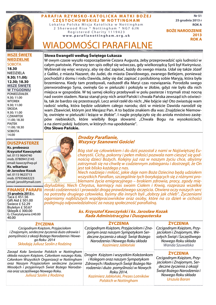 PARAFIA RZYMSKO-KATOLICKA MATKI BOŻEJ CZĘSTOCHOWSKIEJ W NOTTINGHAM Lokalna Polska Misja Katolicka w Nottingham 2 Sherwood Rise * Nottingham * NG7 6JN Registered Charity 1119423 www.parafianottingham.org.uk WIADOMOŚCI PARAFIALNE MSZE ŚWIĘTE NIEDZIELNE SOBOTA 18.30 NIEDZIELA 9.30; 11.00; 12.30; 18.30 MSZE ŚWIĘTE W TYGODNIU Nr 51 25 grudnia 2013 r ROK A BOŻE NARODZENIE 2013 ROK A Słowa Ewangelii według Świętego Łukasza W owym czasie wyszło rozporządzenie Cezara Augusta, żeby przeprowadzić spis ludności w całym państwie. Pierwszy ten spis odbył się wówczas, gdy wielkorządcą Syrii był Kwiryniusz. Wybierali się więc wszyscy, aby się dać zapisać, każdy do swego miasta. Udał się także Józef z Galilei, z miasta Nazaret, do Judei, do miasta Dawidowego, zwanego Betlejem, ponieważ pochodził z domu i rodu Dawida, żeby się dać zapisać z poślubioną sobie Maryją, która była brzemienna. Kiedy tam przebywali, nadszedł dla Maryi czas rozwiązania. Porodziła swego pierworodnego Syna, owinęła Go w pieluszki i położyła w żłobie, gdyż nie było dla nich miejsca w gospodzie. W tej samej okolicy przebywali w polu pasterze i trzymali straż nocną nad swoim stadem. Naraz stanął przy nich anioł Pański i chwała Pańska zewsząd ich oświeciła, tak że bardzo się przestraszyli. Lecz anioł rzekł do nich: „Nie bójcie się! Oto zwiastuję wam radość wielką, która będzie udziałem całego narodu; dziś w mieście Dawida narodził się wam Zbawiciel, którym jest Mesjasz Pan. A to będzie znakiem dla was: Znajdziecie Niemowlę, owinięte w pieluszki i leżące w żłobie”. I nagle przyłączyło się do anioła mnóstwo zastępów niebieskich, które wielbiły Boga słowami: „Chwała Bogu na wysokościach, a na ziemi pokój ludziom, w których ma upodobanie”. Oto Słowo Pańskie. PONIEDZIAŁEK 9.30; 11.00 WTOREK 9.30; 11.00 ŚRODA 9.30; 11.00 CZWARTEK 11.00; 18.30 PIĄTEK 11.00; 18.30 SOBOTA 14.00 DUSZPASTERZE Drodzy Parafianie, Wszyscy Szanowni Goście! Ks. proboszcz Krzysztof Kawczyński Bóg stał się człowiekiem i do dziś pozostał z nami w Najświętszej Eucharystii. Cichy, pokorny i pełen miłości pozwala nam cieszyć się godtel. 0115 9604740 mob. 07809412145 nością dzieci Bożych. Kolejny już raz w naszym życiu chce, abyśmy email: [email protected] zatrzymali się na chwilę w codziennym zabieganiu i dostrzegli, że On Ks. wikariusz jest tak blisko każdego z nas. dr Jarosław Kozak Niech nadzieja i miłość, jakie daje nam Boża Dziecina będą udziałem tel. 0115 9623713 wszystkich Parafian, szczególnie tych borykających się z różnymi promob. 07935663223 blemami życia emigracyjnego – brakiem zdrowia, pracy, zgody mięemail: [email protected] dzyludzkiej. Niech Chrystus, karmiący nas swoim Ciałem i Krwią, rozprasza wszelkie FINANSE PARAFII mroki codzienności i prowadzi drogą prawdziwego szczęścia. Otwiera oczy naszych serc 15 grudnia 2013 r. na potrzeby drugiego człowieka, byśmy dla innych byli „dobrzy jak chleb”. Życzeniami Taca £ 451.56 ogarniamy najbliższych współpracowników oraz osoby, które na co dzień w cichości Gift Aid £ 501.00 podejmują odpowiedzialność za naszą społeczność parafialną. Świece £ 52.29 Biuletyn £ 50.67 Sklepik £ 300.00 G. Charytatywna £40.00 40.00 ŻYCZENIA ks. Krzysztof Kawczyński i ks. Jarosław Kozak Rada Administracyjna i Duszpasterska Czcigodnym Księżom, Przyjaciołom i Znajomym, serdeczne życzenia dużo zdrowia i pomyślności z okazji Bożego Narodzenia i Nowego Roku 2014 Składają Juliusz Szolin z Rodziną ŻYCZENIA ŻYCZENIA Czcigodnym Księżom, Przyjaciołom i Zna- Czcigodnym Księżom, Przyjomym oraz naszym Sympatykom Serjaciołom i Znajomym, Wedeczne życzenia z okazji Świąt Bożego sołych Świąt i Szczęśliwego Narodzenia i Nowego Roku składa Nowego Roku składa Kazimierz Jabłoński Wanda Szuwalska Zarząd Koła Seniorów Polskich w Nottingham ŻYCZENIA składa naszym Księżom, Członkom naszego Koła, Drogim Księżom i wszystkim Koleżankom Czcigodnym Księżom, Przyi Kolegom oraz naszym Sympatykom Członkom Wszystkich Organizacji w Nottingham jaciołom i Znajomym, Seroraz Naszym Przyjaciołom serdeczne życzenia Zdrowych i Radosnych Świąt Bożego Nadeczne życzenia z okazji Wesołych i przyjemnych Świat Bożego Narodze- rodzenia i dużo pomyślności w Nowych Świąt Bożego Narodzenia i nia oraz szczęśliwego Nowego Roku. Roku 2014. Juliusz Szolin z Rodziną Kazimierz Jabłoński, Prezes Lotników Polskich w Nottingham Nowego Roku składa Urszula Baran Z ZAŁOBNEJ KARTY 9 /11/ 2013 r. zmarł w wieku 45 lat, śp. ROBERT PHILIP GORBUTT Msza św. pogrzebowa odbędzie się w naszym kościele 23 grudnia 2013 r. (poniedziałek) o godz. 11.40 OPŁATEK PARAFIALNY W niedzielę 12 stycznia 2014 r. o godz. 13.30 odbędzie się opłatek parafialny. Opłata wynosi £5 od osoby. Zapisy przyjmuje Pani Teresa Gan (tel. 0115 847 56 76). Zapraszamy wszystkich Parafian do udziału i prosimy o przynoszenie fantów na loterię. BAL TRZECH POKOLEŃ Koło Seniorów w Nottingham zaprasza Członków Wszystkich Organizacji, Członków Koła oraz Gości na doroczny Bal Trzech Pokoleń. Bal odbędzie się w sobotę 4-go stycznia 2014 r. od godziny 20.00 do 01.00. w Sali Parafialnej Polskiego Klubu. Obowiązuje strój wieczorowy. Dorośli £ 5; Młodzież £ 3 Zapraszamy KOPERTY GIFT AID Przy wyjściu z kościoła są do odebrania koperty Gift Aid na nowy rok 2014. Zachęcamy również innych Parafian do składania ofiar na tacę w takiej właśnie formie. GARTULACJE Ks. dr Jarosławowi serdecznie gratulujemy obronienia pracy doktorskiej z socjologii religii na Katolickim Uniwersytecie w Lublinie. WIZYTY DUSZPASTERSKA KOLĘDA Rozpoczynamy po przerwie świątecznej wizyty duszpasterskie. Na początku pragniemy odwiedzić wszystkich Parafian mieszkających w najdalej położonych rejonach Nottingham. Każda Rodzina zostanie powiadomiona telefonicznie o
