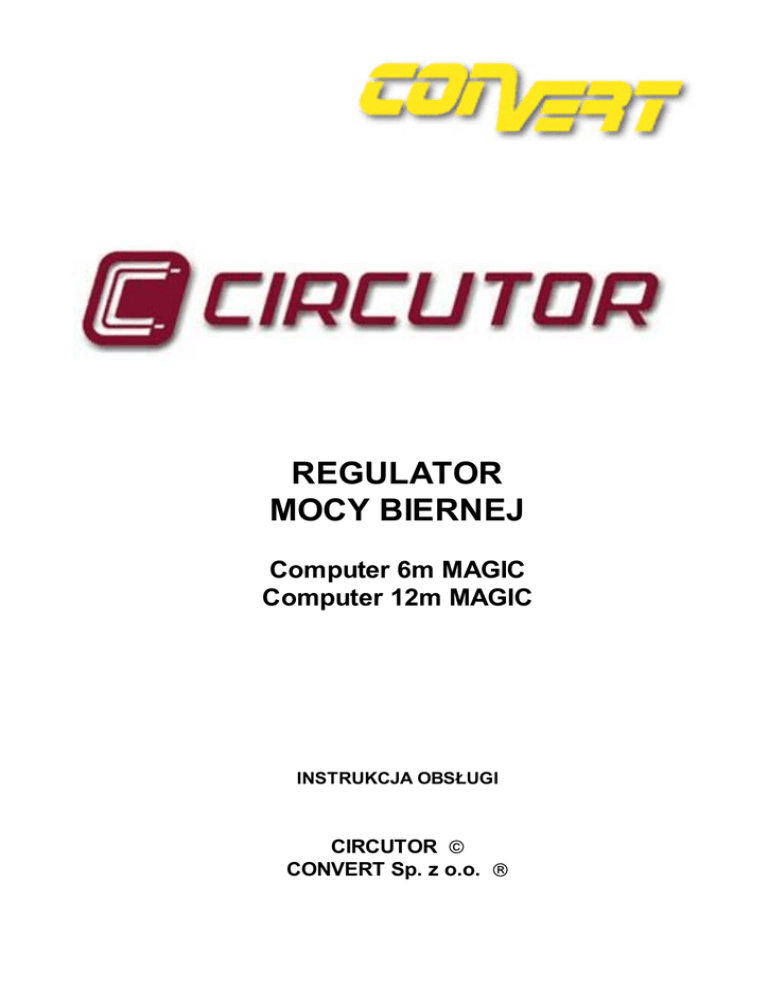 REGULATOR MOCY BIERNEJ Computer 6m MAGIC Computer 12m MAGIC INSTRUKCJA OBSŁUGI CIRCUTOR CONVERT Sp. z o.o. REGULATOR MOCY BIERNEJ computer 6m i 12m MAGIC Strona 1 1. – computer 6m MAGIC & computer 12m MAGIC Regulator mocy biernej computer 6m (12m) pozwala na automatyczne sterowanie załączaniem baterii kondensatorów w celu kompensacji mocy biernej indukcyjnej i utrzymaniem ustawionego, żądanego współczynnika mocy. Na cyfrowym wyświetlaczu udostępnia on informację o stanie baterii (załączonych stopniach), wartości współczynnika mocy (cosφ) w sieci i innych chwilowych parametrach elektrycznych sieci, wystąpieniu alarmu oraz o stanie konfiguracji. Rozwiązanie oparte na mikroprocesorowym systemie pracującym z unikalnym opatentowanym algorytmem FCP (Fast Computerized Program) pozwala na bieżące śledzenie stanu kompensacji oraz optymalizację procesu doboru stopnia korekcji współczynnika mocy). Doświadczenie zdobyte przy projektowaniu poprzednich konstrukcji oraz praktyczne ich sprawdzenie pozwoliło na zaprojektowanie niezawodnego i taniego regulatora, który spełnia wymagania stawiane przez wrażliwe systemy energetyczne jak i przez użytkowników tych systemów. Convert Sp. z o.o., 50-541 Wrocław, ul. Armii Krajowej 54 tel (71) 783 48 30, 78 348 33 fax (71) 783 58 33 E-mail: [email protected] http://www.convert.com.pl REGULATOR MOCY BIERNEJ computer 6m i 12m MAGIC Strona 2 1.1.– Charakterystyka regulatora Pomiary True RMS: regulator wylicza moc bierną i na tej podstawie dokonuje załączeń i wyłączeń baterii kondensatorów. Algorytm: FCP (Fast Computerized Program) – regulator wylicza ilość stopni potrzebną do skompensowania mocy biernej indukcyjnej i załącza je w jednym cyklu. Nie jest stosowana powszechna metoda kolejnych przybliżeń. Wyjścia: do 6 (computer 6m), do 12 (computer 12m) wyjść sterujących. Wyświetlacz 3-pozycyjny, cyfrowy LCD – siedmiosegmentowy. Podłączenie: 3-fazowe. Pomiar 2-kwadrantowy Konfiguracja: zmiana konfiguracji regulatora z panelu głównego (3 klawisze). Alarmowanie: przy błędzie pomiaru prądu (i połączenia) oraz w sytuacji gdy poziom mocy biernej jest zbyt duży i osiągnięcie założonego współczynnika mocy jest niemożliwe (przekompensowanie). Obudowa: montaż tablicowy (DIN 43 700): 144 x 144 mm 2. – OPIS PODSTAWOWY Celem niniejszej instrukcji jest zapoznanie użytkownika z Regulatorem mocy biernej serii computer 6m i 12m. Przestrzeganie jej zaleceń pozwoli na pełne wykorzystanie możliwości regulatora oraz jego bezpieczne i bezawaryjne użytkowanie. 2.1.– Panel czołowy Wielofunkcyjny wyświetlacz typu LCD pozwala na prezentację wszystkich istotnych parametrów regulacji: Convert Sp. z o.o., 50-541 Wrocław, ul. Armii Krajowej 54 tel (71) 783 48 30, 78 348 33 fax (71) 783 58 33 E-mail: [email protected] http://www.convert.com.pl Strona 3 REGULATOR MOCY BIERNEJ computer 6m i 12m MAGIC Znaczenie poszczególnych symboli przedstawia poniższa tabela: Wskaźnik wartości cosϕ Na wyświetlaczu prezentowany jest współczynnik mocy Wskaźnik wartości C/K Na wyświetlaczu prezentowany jest współczynnik C/K Wskaźnik stosunku mocy kolejnych stopni Na wyświetlaczu prezentowany jest wybrany program regulacji Wskaźnik wartości czasu opóźnienia Na wyświetlaczu prezentowany jest ustawiony opóźnienia załączenia poszczególnych stopni czas Wskaźnik ilości stopni w baterii Na wyświetlaczu prezentowana podłączonych stopni baterii jest wybrana ilość Wskaźnik trybu ręcznego Tryb umożliwiający ręczne poszczególnych stopni baterii załączanie i wyłączanie Wskaźnik indukcyjnego charakteru cosϕ Wyświetlany współczynnik mocy ma charakter indukcyjny Wskaźnik pojemnościowego charakteru cosϕ Wyświetlany współczynnik pojemnościowy mocy ma charakter Wskaźniki załączenia poszczególnych stopni 2.2.– Klawiatura Na panelu przednim znajdują się następujące klawisze: Convert Sp. z o.o., 50-541 Wrocław, ul. Armii Krajowej 54 tel (71) 783 48 30, 78 348 33 fax (71) 783 58 33 E-mail: [email protected] http://www.convert.com.pl REGULATOR MOCY BIERNEJ computer 6m i 12m MAGIC Strona 4 Funkcje przypisane każdemu z klawiszy zależą od trybu pracy w jakim znajduje się regulator: W trybie pracy (pomiaru) naciśnięcie klawisza powoduje: Długie (> 1 s) – wejście w tryb konfiguracji (SETUP). W trybie konfiguracji (SETUP) naciśnięcie klawisza powoduje: Krótkie (< 1 s) – wejście w tryb edycji parametru. Długie (> 1 s) – wyjście z trybu konfiguracji (SETUP). UWAGA: W trybie konfiguracji (SETUP) wszystkie stopnie są odłączone – regulator nie steruje kompensacją. W trybie pracy (pomiaru): Naciśnięcie klawisza powoduje ręczne załączenie jednego stopnia. Naciśnięcie klawisza powoduje ręczne odłączenie jednego stopnia. Stałe naciskanie klawisza lub powoduje sekwencyjne załączanie lub wyłączanie kolejnych stopni z uwzględnieniem ustawionych czasów opóźnienia załączenia i powtórnego załączenia. Po 20 sekundach od zwolnienia klawisza następuje powrót do automatycznej regulacji. W trybie konfiguracji (SETUP): Naciśnięcie klawisza powoduje zmianę wartości liczbowej konfigurowanej wielkości (inkrementacja) na wybranej pozycji. Naciśnięcie klawisza powoduje zmianę pozycji wyświetlacza (cyfry) do edycji. 3. – PROGRAMOWANIE REGULATORA computer 6m (12m). Tryb konfiguracji (SETUP) pozwala na zaprogramowanie parametrów procesu kompensacji mocy biernej oraz ustawienie parametrów zastosowanych przekładnika prądowego i kondensatorów (mocy poszczególnych stopni): Parametr konfiguracji (SETUP) Zakres zmienności 4.- Opóźnienie załączenia 0,85 ind. ÷ 0,95 poj. Charakter współczynnika wskazywany jest strzałką na wyświetlaczu 0,02 ÷ 1,00 Współczynnik należy wyliczyć z podanego dalej wzoru lub odczytać z tabeli. 1.1.1.1 – 1.2.2.2. – 1.2.4.4 – 1.1.2.2. – 1.2.4.8. Program regulacji jest definiowany przez stosunek mocy kondensato