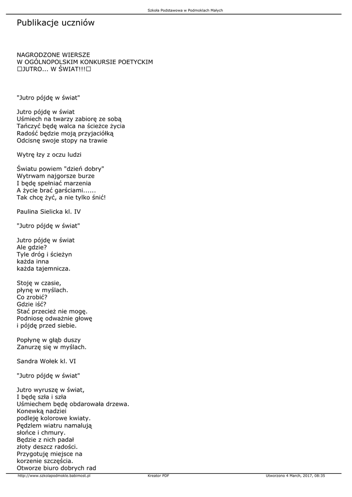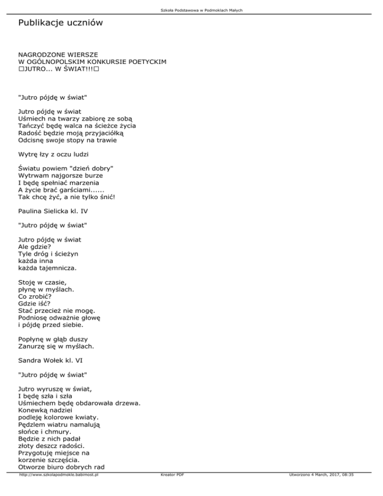 Szkoła Podstawowa w Podmoklach Małych Publikacje uczniów NAGRODZONE WIERSZE W OGÓLNOPOLSKIM KONKURSIE POETYCKIM JUTRO... W ŚWIAT!!! "Jutro pójdę w świat" Jutro pójdę w świat Uśmiech na twarzy zabiorę ze sobą Tańczyć będę walca na ścieżce życia Radość będzie moją przyjaciółką Odcisnę swoje stopy na trawie Wytrę łzy z oczu ludzi Światu powiem "dzień dobry" Wytrwam najgorsze burze I będę spełniać marzenia A życie brać garściami...... Tak chcę żyć, a nie tylko śnić! Paulina Sielicka kl. IV "Jutro pójdę w świat" Jutro pójdę w świat Ale gdzie? Tyle dróg i ścieżyn każda inna każda tajemnicza. Stoję w czasie, płynę w myślach. Co zrobić? Gdzie iść? Stać przecież nie mogę. Podniosę odważnie głowę i pójdę przed siebie. Popłynę w głąb duszy Zanurzę się w myślach. Sandra Wołek kl. VI "Jutro pójdę w świat" Jutro wyruszę w świat, I będę szła i szła Uśmiechem będę obdarowała drzewa. Konewką nadziei podleję kolorowe kwiaty. Pędzlem wiatru namalują słońce i chmury. Będzie z nich padał złoty deszcz radości. Przygotuję miejsce na korzenie szczęścia. Otworze biuro dobrych rad http://www.szkolapodmokle.babimost.pl Kreator PDF Utworzono 4 March, 2017, 08:35 Szkoła Podstawowa w Podmoklach Małych uruchomię xero pozytywnych myśli. A gdy wreszcie dotrę do celu, to uśmiechem szczerym obdaruję ludzi wielu. I wszyscy będziemy szczęśliwi, i dla każdego życzliwi. Kamila Janeczek kl. VI NASZ PAPIEŻ JAN PAWEŁ IIZAWSZE POZOSTANIE W NASZEJ PAMIĘCI8.06.2005Drogi Ojcze ŚwiętyMatka Boża nam Go dałaO Janie Pawle IIPamiętamyW sobotę 2 kwietnia 2005 http://www.szkolapodmokle.babimost.pl Kreator PDF Utworzono 4 March, 2017, 08:35