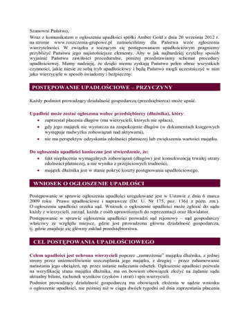 Szanowni Państwo, Wraz z komunikatem o ogłoszeniu upadłości spółki Amber Gold z dnia 20 września 2012 r. na stronie www.roszczenia-grupowe.pl zamieściliśmy dla Państwa wzór zgłoszenia wierzytelności. W związku z toczącym się postępowaniem upadłościowym pragniemy przybliżyć Państwu jego najistotniejsze elementy. Aby w jak najbardziej czytelny sposób wyjaśnić Państwu zawiłości proceduralne, poniżej przedstawiamy schemat procedury upadłościowej. Mamy nadzieję, że dzięki niemu zyskają Państwo pełen obraz wszystkich czynności, jakie niesie ze sobą tryb upadłościowy i będą Państwo mogli uczestniczyć w nim jako wierzyciele w sposób świadomy i bezpieczny. POSTĘPOWANIE UPADŁOŚCIOWE – PRZYCZYNY Każdy podmiot prowadzący działalność gospodarczą (przedsiębiorca) może upaść. Upadłość może zostać ogłoszona wobec przedsiębiorcy (dłużnika), który: zaprzestał płacenia długów (ma wierzycieli, których nie spłaca), gdy jego majątek nie wystarcza na zaspokojenie długów (w dokumentach księgowych występuje nadwyżka zobowiązań nad aktywami), nie ma perspektyw odzyskania zdolności płatniczej lub zwiększenia wartości majątku. Do ogłoszenia upadłości konieczne jest stwierdzenie, że: fakt niepłacenia wymagalnych zobowiązań (długów) jest konsekwencją trwałej utraty zdolności płatniczej, a nie wynika z przejściowych trudności, majątek dłużnika jest w stanie pokryć koszty postępowania upadłościowego. WNIOSEK O OGŁOSZENIE UPADŁOŚCI Postępowanie w sprawie ogłoszenia upadłości uregulowane jest w Ustawie z dnia 6 marca 2009 roku Prawo upadłościowe i naprawcze (Dz. U. Nr 175, poz. 1361 z późn. zm.). O ogłoszeniu upadłości orzeka sąd. Wniosek o ogłoszenie upadłości może zgłosić do sądu każdy z wierzycieli, zarząd, każda z osób uprawnionych do reprezentacji oraz likwidator. Postępowanie w sprawie ogłoszenia upadłości prowadzi sąd rejonowy – sąd gospodarczy właściwy ze względu miejsce, gdzie jest prowadzona główna działalność gospodarcza, tj. gdzie znajduje się główny zakład przedsiębiorstwa. CEL POSTĘPOWANIA UPADŁOŚCIOWEGO Celem upadłości jest ochrona wierzycieli poprzez „zamrożenie” majątku dłużnika, z jednej strony przez uniemożliwienie uszczuplania jego majątku, z drugiej – przez zahamowanie narastania jego obciążeń, np. przez ustanie naliczania odsetek. Ogłoszenie upadłości pozwala na weryfikację stanu majątku dłużnika, ma on bowiem obowiązek złożyć na żądanie sądu aktualny bilans, rachunek wyników (zysków i strat) i spis wierzycieli. Podmiot prowadzący działalność gospodarczą ma obowiązek złożenia w sądzie wniosku o ogłoszenie upadłości, nie później niż w ciągu dwóch tygodni od dnia zaprzestania płacenia długów. W wypadku spółek prawa handlowego odpowiedzialnym za dopełnienie tego obowiązku jest jej zarząd. PRZEBIEG POSTĘPOWANIA UPADŁOŚCIOWEGO Uwzględniając wniosek o ogłoszenie upadłości, właściwy sąd gospodarczy wydaje postanowienie, w którym wymienia nazwę przedsiębiorstwa upadłego, wzywa jego wierzycieli do zgłoszenia swoich wierzytelności w oznaczonym terminie, wyznacza sędziego komisarza oraz syndyka masy upadłości. Data postanowienia sądu jest datą ogłoszenia upadłości. Na skutek ogłoszenia upadłości przedsiębiorca traci prawo zarządzania, korzystania i dysponowania swoim majątkiem. Majątek ten stanowi masę upadłości. Od momentu ogłoszenia upadłości wyznaczony przez sąd syndyk przejmuje cały majątek organizacji, zarządza nim i przeprowadza jego likwidację. Obowiązkiem zarządu upadłego podmiotu jest wskazanie i wydanie syndykowi całego majątku przedsiębiorstwa, ksiąg handlowych (finansowych)oraz wszelkiej korespondencji i innych dokumentów. Z dniem ogłoszenia upadłości majątek spółki Amber Gold stał się tzw. masą upadłości, która będzie służyła zaspokojeniu wierzycieli upadłego, czyli m.in. Państwa. PODZIAŁ FUNDUSZY MASY UPADŁOŚCI W skład masy upadłości wchodzi majątek należący do upadłego w dniu ogłoszenia upadłości oraz nabyty przez upadłego w toku postępowania upadłościowego. Zobowiązania pieniężne upadłej spółki Amber Gold, których termin świadczenia jeszcze nie nastąpił, stają się wymagalne z dniem ogłoszenia upadłości – wskazana powyżej kwestia jest szczególnie ważna dla tych z Państwa, których umowy się jeszcze nie zakończyły. Z dniem ogłoszenia upadłości umowy, których termin zakończenia przypadał na 2013, 2014 czy 2015 rok są już niejako zakończone i wymagalne, dlatego też mogą Państwo również zgłaszać swoje wierzytelności. Zgłaszając wierzytelności należy pamiętać, iż odsetki ustawowe za niewypłacone w terminie należności przysługują tylko i wyłącznie do dnia ogłoszenia upadłości, a zatem do dnia 20 września 2012 r. Tym z Państwa, którzy posiadają znaczną sumę na lokatach, których termin już upłynął, celem sprawniejszego obliczenia odsetek polecamy skorzystanie z dostępnych na wielu stronach internetowych tzw. kalkulatorów odsetek (wystarczy wpisać w dowolna wyszukiwarkę „kalkulator odsetek”). Sąd, wydając postanowienie o ogłoszeniu upadłości obejmującej likwidację majątku upadłego, wyznaczył sędziego-komisarza i syndyka. Dane personalne syndyka i sędziego komisarza są jawne i będą one zamieszczone w ogłoszeniu o upadłości na łamach Monitora Sądowego i Gospodarczego. Również w tym ogłoszeniu zostanie wskazany ostateczny termin na zgłaszanie przez Państwa swoich wierzytelności. Zgłoszenie wierzytelności należy wysłać wraz z wszystkimi załącznikami w dwóch egzemplarzach bezpośrednio na adres sądu upadłościowego. Zadaniem syndyka jest niezwłoczne przystąpienie do spisu inwentarza i ostateczne oszacowanie masy upadłości oraz sporządzenie planu likwidacyjnego, natomiast sędziakomisarz czuwa