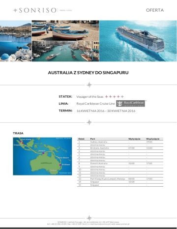 OFERTA AUSTRALIA Z SYDNEY DO SINGAPURU STATEK: Voyager of the Seas LINIA: Royal Caribbean Cruise Line TERMIN: 16 KWIETNIA 2016 – 30 KWIETNIA 2016 TRASA Dzień 1 2 3 4 5 6 7 8 9 10 11 12 13 14 15 Port Sydney, Australia dzień na morzu Brisbane, Australia dzień na morzu dzień na morzu dzień na morzu dzień na morzu Darwin, Australia dzień na morzu dzień na morzu dzień na morzu dzień na morzu Port Klang (Kuala Lumpur), Malezja Singapur Singapur Wpłynięcie 07:00 10:00 08:00 10:00 - SONRISO | Lipiński Passage | Al. Jero zo limskie 61 | 00-697 Warszawa tel. +48 22 206 45 00 | fax. +48 22 100 14 61 | e-mail: biuro @so nriso .pl | web: www.so nriso .pl Wypłynięcie 19:00 15:00 17:00 17:00 - OFERTA CENA Typ kabiny Kabina wewnętrzna Cena z osobę od 929 EUR Kabina z oknem od 1 169 EUR Kabina z balkonem od 1 559 EUR Junior Suite od 2 076 EUR CENA ZAWIERA DOTATKOWE OPŁATY zakwaterowanie w 2 - os. kabinie wybranej kategorii pełne wyżywienie: 3 posiłki, przekąski między posiłakmi, bufet o północy napoje do posiłków: woda stołowa, kawa, herbata oraz sok do śniadania serwis bagażowy podczas wejścia i zejścia ze statku 24 godzinny serwis kabinowy korzystanie z urządzeń sportowo - rekreacyjnych dostępnych na pokładzie (baseny, jacuzzi, boiska sportowe, kluby dla dzieci i młodzieży itp.) udział we wszystkich imprezach organizowanych na pokładzie (przedstawienia, pokazy, aukcje, animacje i inne) obowiązkowe opłaty portowe obowiązkową opłatę serwisową (napiwki) dla obsługi statku dojazd/przelot do portu rozpoczęcia i zakończenia rejsu transfery (lotnisko - port - lotnisko) ewentualne noclegi przed lub po rejsie wycieczki fakultatywne napoje: bezalkoholowe, alkoholowe, woda mineralna dostępne w restauracjach i barach (istnieje możliwość wykupienia pakietów napojów, o szczegóły zapytaj w biurze) korzystanie z mini baru w kabinie korzystanie z usług typu: SPA, salon piękności, pralnia itp. wydatki osobiste tj. zakupy w butikach, internet, kasyno itp. obowiązkowe ubezpieczenie turystyczne koszt wymaganych wiz ewentualna opłata paliwowa (linia w momencie wzrotu cen ropy zastrzega sobie prawo do dodania oplaty paliwowej do każdej rezerwacji) Na życzenie świadczymy dodatkowo usługi: rezerwacje hotelowe na całym świecie, rezerwacje biletów lotniczych, trasferów oraz parkingu w porcie, rezerwacje wycieczek fakultatywnych i innych atrakcji SONRISO | Lipiński Passage | Al. Jero zo limskie 61 | 00-697 Warszawa tel. +48 22 206 45 00 | fax. +48 22 100 14 61 | e-mail: biuro @so nriso .pl | web: www.so nriso .pl