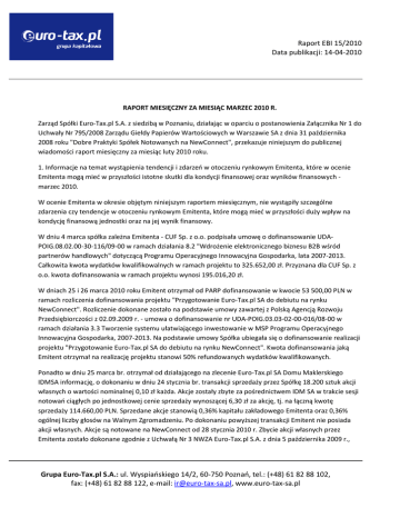 Raport EBI 15/2010 Data publikacji: 14-04-2010 RAPORT MIESIĘCZNY ZA MIESIĄC MARZEC 2010 R. Zarząd Spółki Euro-Tax.pl S.A. z siedzibą w Poznaniu, działając w oparciu o postanowienia Załącznika Nr 1 do Uchwały Nr 795/2008 Zarządu Giełdy Papierów Wartościowych w Warszawie SA z dnia 31 października 2008 roku "Dobre Praktyki Spółek Notowanych na NewConnect", przekazuje niniejszym do publicznej wiadomości raport miesięczny za miesiąc luty 2010 roku. 1. Informacje na temat wystąpienia tendencji i zdarzeo w otoczeniu rynkowym Emitenta, które w ocenie Emitenta mogą mied w przyszłości istotne skutki dla kondycji finansowej oraz wyników finansowych marzec 2010. W ocenie Emitenta w okresie objętym niniejszym raportem miesięcznym, nie wystąpiły szczególne zdarzenia czy tendencje w otoczeniu rynkowym Emitenta, które mogą mied w przyszłości duży wpływ na kondycję finansową jednostki oraz na jej wynik finansowy. W dniu 4 marca spółka zależna Emitenta - CUF Sp. z o.o. podpisała umowę o dofinansowanie UDAPOIG.08.02.00-30-116/09-00 w ramach działania 8.2 "Wdrożenie elektronicznego biznesu B2B wśród partnerów handlowych" dotyczącą Programu Operacyjnego Innowacyjna Gospodarka, lata 2007-2013. Całkowita kwota wydatków kwalifikowalnych w ramach projektu to 325.652,00 zł. Przyznana dla CUF Sp. z o.o. kwota dofinansowania w ramach projektu wynosi 195.016,20 zł. W dniach 25 i 26 marca 2010 roku Emitent otrzymał od PARP dofinansowanie w kwocie 53 500,00 PLN w ramach rozliczenia dofinansowania projektu "Przygotowanie Euro-Tax.pl SA do debiutu na rynku NewConnect". Rozliczenie dokonane zostało na podstawie umowy zawartej z Polską Agencją Rozwoju Przedsiębiorczości z 02.09.2009 r. - umowa o dofinansowanie nr UDA-POIG.03.03-02-00-016/08-00 w ramach działania 3.3 Tworzenie systemu ułatwiającego inwestowanie w MSP Programu Operacyjnego Innowacyjna Gospodarka, 2007-2013. Na podstawie umowy Spółka ubiegała się o dofinansowanie realizacji projektu "Przygotowanie Euro-Tax.pl SA do debiutu na rynku NewConnect". Kwota dofinansowania jaką Emitent otrzymał na realizację projektu stanowi 50% refundowanych wydatków kwalifikowanych. Ponadto w dniu 25 marca br. otrzymał od działającego na zlecenie Euro-Tax.pl SA Domu Maklerskiego IDMSA informację, o dokonaniu w dniu 24 stycznia br. transakcji sprzedaży przez Spółkę 18.200 sztuk akcji własnych o wartości nominalnej 0,10 zł każda. Akcje zostały zbyte za pośrednictwem IDM SA w trakcie sesji notowao ciągłych po jednostkowej cenie sprzedaży wynoszącej 6,30 zł za akcję, tj. na łączną kwotę sprzedaży 114.660,00 PLN. Sprzedane akcje stanowią 0,36% kapitału zakładowego Emitenta oraz 0,36% ogólnej liczby głosów na Walnym Zgromadzeniu. Po dokonaniu powyższej transakcji Emitent nie posiada akcji własnych. Akcje są notowane na NewConnect od 28 stycznia 2010 r. Zbycie akcji własnych przez Emitenta zostało dokonane zgodnie z Uchwałą Nr 3 NWZA Euro-Tax.pl S.A. z dnia 5 października 2009 r., Grupa Euro-Tax.pl S.A.: ul. Wyspiaoskiego 14/2, 60-750 Poznao, tel.: (+48) 61 82 88 102, fax: (+48) 61 82 88 122, e-mail: [email protected], www.euro-tax-sa.pl zgodnie z którą akcje własne zostały zakupione przez Emitenta.W dniu 10.03.2010 r. Emitent zawarł ze spółką zależną CUF Sp. z o.o. umowę zbycia udziałów jakie Emitent posiada w spółce zależnej Euro-Tax.pl Sp. z o.o. Na mocy umowy Emitent sprzedał CUF Sp. zoo. 8 udział o wartości nominalnej 500 zł każdy udział, w związku z czym CUF sp. z o.o. uzyskał 100% udziałów w spółce Euro-Tax.pl Sp. z o.o. Cena nabycia jednego udziału została uzgodniona i wynosi 24.656,82 zł i zostanie zapłacona przez nabywcę CUF sp z o.o. w terminie do dnia 31.12.2010 r. Transakcja ma charakter wewnątrzgrupowy i służy uporządkowaniu struktury Grupy Kapitałowej. Zysk zrealizowany na transakcji przez Euro-Tax. S.A. nie będzie miał przełożenia na wyniki na poziomie skonsolidowanym. 2. Zestawienie informacji opublikowanych przez Emitenta w trybie raportu bieżącego w okresie objętym raportem. W okresie objętym niniejszym raportem spółka Euro-Tax.pl S.A. opublikowała następujące raporty bieżące w systemie EBI: 1. 2010-03-05 bieżący 10/2010 Zawarcie przez Spółkę zależną Emitenta umowy na dofinansowanie 2. 2010-03-11 bieżący 11/2010 Zbycie udziałów w spółce zależnej 3. 2010-03-12 bieżący 12/2010 Raport miesięczny za miesiąc luty 4. 2010-03-23 bieżący 13/2010 Sprzedaż akcji własnych 5. 2010-03-31 bieżący 14/2010 Rozliczenie dofinansowania W okresie objętym niniejszym raportem spółka Euro-Tax.plS.A. opublikowała następujące raporty w systemie ESPI: 1. 2010-03-23 - Transakcja sprzedaży przez Emitenta akcji własnych 3. Informacje na temat realizacji celów emisji, jeżeli taka realizacja chodby w części miała miejsce w okresie objętym raportem. Oferta Euro-Tax.pl S.A. dotyczyła sprzedaży akcji istniejących, należących do pośrednio lub bezpośrednio do osób zarządzających Spółką oraz spółkami zależnymi. Akcje są notowane na NewConnect od 28 stycznia br. W okresie objętym raportem spółka nie realizowała celów emisji. 4. Kalendarz inwestora, obejmujący wydarzenia mające mied miejsce w nadchodzącym miesiącu, które dotyczą emitenta i są istotne z punktu widzenia interesów inwestorów, w szczególności daty publikacji Grupa Euro-Tax.pl S.A.: ul. Wyspiaoskiego 14/2, 60-750 Poznao, tel.: (+48) 61 82 88 102, fax: (+48) 61 82 88 122, e-mail: [email protected], www.euro-tax-sa.pl raportów okresowych, planowanych walnych zgromadzeo, otwarcia subskrypcji, spotkao z inwestorami lub analitykami oraz oczekiwany termin publikacji raportu analitycznego. W nadchodzącym miesiącu spółka Euro-Tax.pl S.A. zgodnie z opublikowanym harmonogramem przekazywania raportów okresowych nie planuje opublikowania raportów okresowych, raport miesięczny zostanie przekazany do 14 dnia miesiąca. 