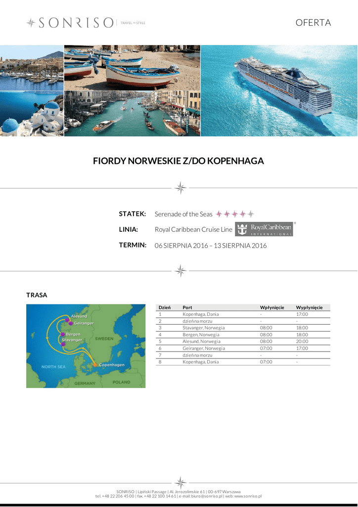 OFERTA FIORDY NORWESKIE Z/DO KOPENHAGA STATEK: Serenade of the Seas LINIA: Royal Caribbean Cruise Line TERMIN: 06 SIERPNIA 2016 – 13 SIERPNIA 2016 TRASA Dzień 1 2 3 4 5 6 7 8 Port Kopenhaga, Dania dzień na morzu Stavanger, Norwegia Bergen, Norwegia Alesund, Norwegia Geiranger, Norwegia dzień na morzu Kopenhaga, Dania Wpłynięcie 08:00 08:00 08:00 07:00 07:00 SONRISO | Lipiński Passage | Al. Jero zo limskie 61 | 00-697 Warszawa tel. +48 22 206 45 00 | fax. +48 22 100 14 61 | e-mail: biuro @so nriso .pl | web: www.so nriso .pl Wypłynięcie 17:00 18:00 18:00 20:00 17:00 - OFERTA CENA Typ kabiny Cena z osobę Kabina wewnętrzna od 1 107 EUR Kabina z oknem od 1 152 EUR Kabina z balkonem od 1 457 EUR Junior Suite od 2 321 EUR CENA ZAWIERA DOTATKOWE OPŁATY zakwaterowanie w 2 - os. kabinie wybranej kategorii pełne wyżywienie: 3 posiłki, przekąski między posiłakmi, bufet o północy napoje do posiłków: woda stołowa, kawa, herbata oraz sok do śniadania serwis bagażowy podczas wejścia i zejścia ze statku 24 godzinny serwis kabinowy korzystanie z urządzeń sportowo - rekreacyjnych dostępnych na pokładzie (baseny, jacuzzi, boiska sportowe, kluby dla dzieci i młodzieży itp.) udział we wszystkich imprezach organizowanych na pokładzie (przedstawienia, pokazy, aukcje, animacje i inne) obowiązkowe opłaty portowe obowiązkową opłatę serwisową (napiwki) dla obsługi statku dojazd/przelot do portu rozpoczęcia i zakończenia rejsu transfery (lotnisko - port - lotnisko) ewentualne noclegi przed lub po rejsie wycieczki fakultatywne napoje: bezalkoholowe, alkoholowe, woda mineralna dostępne w restauracjach i barach (istnieje możliwość wykupienia pakietów napojów, o szczegóły zapytaj w biurze) korzystanie z mini baru w kabinie korzystanie z usług typu: SPA, salon piękności, pralnia itp. wydatki osobiste tj. zakupy w butikach, internet, kasyno itp. obowiązkowe ubezpieczenie turystyczne koszt wymaganych wiz ewentualna opłata paliwowa (linia w momencie wzrotu cen ropy zastrzega sobie prawo do dodania oplaty paliwowej do każdej rezerwacji) Na życzenie świadczymy dodatkowo usługi: rezerwacje hotelowe na całym świecie, rezerwacje biletów lotniczych, trasferów oraz parkingu w porcie, rezerwacje wycieczek fakultatywnych i innych atrakcji SONRISO | Lipiński Passage | Al. Jero zo limskie 61 | 00-697 Warszawa tel. +48 22 206 45 00 | fax. +48 22 100 14 61 | e-mail: biuro @so nriso .pl | web: www.so nriso .pl