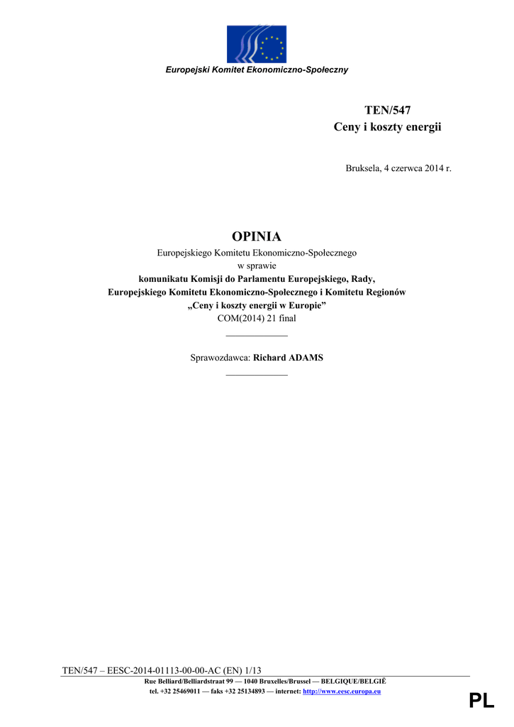 Europejski Komitet Ekonomiczno-Społeczny TEN/547 Ceny i koszty energii Bruksela, 4 czerwca 2014 r. OPINIA Europejskiego Komitetu Ekonomiczno-Społecznego w sprawie komunikatu Komisji do Parlamentu Europejskiego, Rady, Europejskiego Komitetu Ekonomiczno-Społecznego i Komitetu Regionów „Ceny i koszty energii w Europie” COM(2014) 21 final _____________ Sprawozdawca: Richard ADAMS _____________ TEN/547 – EESC-2014-01113-00-00-AC (EN) 1/13 Rue Belliard/Belliardstraat 99 — 1040 Bruxelles/Brussel — BELGIQUE/BELGIË tel. +32 25469011 — faks +32 25134893 — internet: http://www.eesc.europa.eu PL Dnia 15 stycznia 2014 r. Komisja, działając na podstawie art. 304 Traktatu o funkcjonowaniu Unii Europejskiej, postanowiła zasięgnąć opinii Europejskiego Komitetu Ekonomiczno-Społecznego w sprawie komunikatu Komisji do Parlamentu Europejskiego, Rady, Europejskiego Komitetu Ekonomiczno-Społecznego i Komitetu Regionów „Ceny i koszty energii w Europie” COM(2014) 21 final. Sekcja Transportu, Energii, Infrastruktury i Społeczeństwa Informacyjnego, której powierzono przygotowanie prac Komitetu w tej sprawie, przyjęła swoją opinię 21 maja 2014 r. Na 499. sesji plenarnej w dniach 4–5 czerwca 2014 r. (posiedzenie z 4 czerwca) Europejski Komitet Ekonomiczno-Społeczny stosunkiem głosów 140 do 10 – 13 osób wstrzymało się od głosu – przyjął następującą opinię: * * * 1. Wnioski i zalecenia 1.1 Ceny energii osiągnęły ogólnie rzecz biorąc rekordowo wysoki poziom i prawdopodobnie dalej będą rosły. Ma to dotkliwy wpływ na budżety wielu gospodarstw domowych w całej UE, a często także na budżety odbiorców przemysłowych. W komunikacie podkreślono potrzebę większej świadomości w społeczeństwie obywatelskim na temat tego, w jaki sposób struktura cen energii może pogodzić cele dotyczące przeciwdziałania zmianie klimatu z potrzebą zapewnienia bezpieczeństwa energetycznego. Bez tej świadomości nie ma co liczyć ani na wolę polityczną, ani na akceptację ze strony konsumentów. 1.2 Ceny energii mogą stanowić dla przemysłu istotny czynnik konkurencyjności, lecz analiza gospodarcza konkurencyjności przemysłu nie powinna ograniczać się jedynie do tego aspektu. Należy również uwzględnić inne elementy, jak energochłonność, udział kosztów energii w całkowitych kosztach produkcji oraz marże zysku. Zasadnicze znaczenie ma konsekwentne w skali świata ograniczanie zmiany klimatu. Wiodąca rola Europy może powodować ryzyko utraty konkurencyjności, relokacji przemysłu i ucieczki emisji. 1.3 Efektywność energetyczna, energia ze źródeł odnawialnych oraz inne lokalne źródła energii mogą poprawić bezpieczeństwo dostaw, lecz w każdym przypadku wiążą się z nimi czynniki kosztów, ryzyka, wpływu na środowisko i społecznej akceptacji. Ponieważ podejście i postawy różnią się w poszczególnych państwach, niezbędna jest przejrzysta analiza kosztów, zmiana i lepsza koordynacja instrumentów wsparcia (takich jak taryfy gwarantowane i regulacje ich dotyczące) w celu określenia możliwego do zaakceptowania TEN/547 – EESC-2014-01113-00-00-AC (EN) 2/13 koszyka energetycznego w każdym państwie członkowskim. Równie ważna jest współpraca z państwami sąsiadującymi. 1.4 Trzeba zadbać o to, by przemysł także w przyszłości był w stanie, jak kiedyś, dostosować się do zmian, a także wspierać w szczególności zdolność sektora energii do przeprowadzenia niezbędnych inwestycji w systemie energetycznym. Będzie to wymagać zdecydowanego zaangażowania rządów, które musi być zgodne z europejskim wewnętrznym rynkiem energii. 1.5 Należy ukończyć budowanie tego rynku, lecz jego pełen potencjał musi być wspierany odpowiednimi instrumentami rynkowymi, faktyczną koordynacją krajowej polityki energetycznej na poziomie UE oraz działaniami zmierzającymi w wyraźnie określonym wspólnym kierunku. Koniecznym warunkiem wstępnym jest ponowne położenie nacisku na przejrzyste i dokładne dane. Trzeba uwzględnić szczególną sytuację różnych państw członkowskich, np. kwestię istniejących „wysp energetycznych”, zaś przy kontroli cen należy wziąć pod uwagę fakt, że bez rozwiniętej infrastruktury, która wymaga znacznych inwestycji, nie da się urzeczywistnić wspólnego rynku wewnętrznego energii, a państwa nie będą mogły wykorzystywać jego atutów. 1.6 Optymalizacja kosztów dzięki ściślejszej koordynacji i większej solidarności w UE jest kluczowa zwłaszcza z uwagi na fakt, iż kontrola polityki energetycznej pozostaje w bezpośredniej gestii państw członkowskich. Koordynacja była dość słaba w przeszłości, potrzeba więc nowego podejścia. Niezbędna jest też solidarność między państwami członkowskimi w obliczu rosnącej niepewności dostaw; należy ponadto położyć większy nacisk na dalsze wspólne badania i rozwój w celu rozwiązania ewidentnych problemów związanych z wytwarzaniem energii i łańcuchem dostaw. 1.7 Zwiększanie płynności centrów obrotu gazem (tzw. hubów) przez grupy państw członkowskich może zoptymalizować i ograniczyć koszty, przyczyniając się do rozdzielenia cen ropy naftowej i gazu i zwiększenia elastyczności producentów. 1.8 W celu zwiększenia koordynacji EKES wzywa do podjęcia działań i zapewnienia bezpośredniego wsparcia na rzecz szeroko zakrojonego programu obejmującego dialog na temat energii na poziomie europejskim. Należy uwzględnić tu konsumentów energii, zarówno gospodarstwa, jak i przemysł, a także handlowe i instytucjonalne podmioty łańcucha energetycznego, wraz z władzami lokalnymi, regionalnymi i krajowymi. 1.9 Ten europejski dialog na temat energii – integrujący, reprezentatywny, niezależny i przejrzysty – powinien również stanowić podstawę nowego procesu zarządzania zaproponowanego przez Komisję na potrzeby realizacji celów z zakresu energii i klimatu określonych w pakiecie 