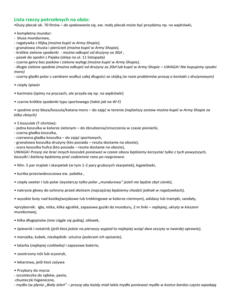 Lista rzeczy potrzebnych na obóz: •Duży plecak ok. 70 litrów – do spakowania się, ew. mały plecak może być przydatny np. na wędrówki, • kompletny mundur: - bluza mundurowa, - rogatywka z lilijką (można kupić w Army Shopie), - granatowa chusta i pierścień (można kupić w Army Shopie), - krótkie zielone spodenki - można odkupić od drużyny za 30zł , - pasek do spodni z Pajaka (sklep na ul. 11 listopada) - czarne getry bez pasków i zielone wyłogi (można kupić w Army Shopie), - długie zielone spodnie (można odkupić od drużyny za 20zł lub kupić w Army Shopie – UWAGA! Nie kupujemy spodni moro) - czarny gładki polar z zamkiem wzdłuż całej długości ze stójką (w razie problemów proszę o kontakt z drużynowym) • ciepły śpiwór • karimata (śpimy na pryczach, ale przyda się np. na wędrówki) • czarne krótkie spodenki typu sportowego (takie jak na W-F) • spodnie oraz bluza/koszula/katana moro – do zajęć w terenie (najtańszy zestaw można kupić w Army Shopie za kilka złotych) • 5 koszulek (T-shirtów): - jedna koszulka w kolorze zielonym – do zbrudzenia/zniszczenia w czasie pionierki, - czarna gładka koszulka, - czerwona gładka koszulka – do zajęć sportowych, - granatowa koszulka drużyny (kto posiada – reszta dostanie na obozie), - szara koszulka hufca (kto posiada – reszta dostanie na obozie), UWAGA! Proszę nie brać innych koszulek ponieważ w czasie obozu będziemy korzystać tylko z tych powyższych, koszulki i bieliznę będziemy prać codziennie rano po rozgrzewce. • Min. 5 par majtek i skarpetek (w tym 1-2 pary grubszych skarpetek), kąpielówki, • kurtka przeciwdeszczowa ew. pałatka , • ciepły sweter i lub polar (wystarczy tylko polar „mundurowy” jeżeli nie będzie zbyt cienki), • nakrycie głowy do ochrony przed słońcem (najczęściej będziemy chodzić jednak w rogatywkach), • wysokie buty nad kostkę(wojskowe lub trekkingowe w kolorze ciemnym), adidasy lub trampki, sandały, •przybornik: igła, nitka, kilka agrafek, zapasowe guziki do munduru, 2 m linki – najlepiej, ukryty w kieszeni mundurowej, • kilka długopisów (one ciągle się gubią), ołówek, • śpiewnik i notatnik (jeśli ktoś jedzie na pierwszy wyjazd to najlepiej wziąć dwa zeszyty w twardej oprawie), • menażka, kubek, niezbędnik- sztućce (polecam ich opisanie), • latarka (najlepiej czołówka) i zapasowe baterie, • zaostrzony nóż lub scyzoryk, • lekarstwa, jeśli ktoś zażywa • Przybory do mycia: - szczoteczka do zębów, pasta, -chusteczki higieniczne, - mydło (w płynie „Biały Jeleń” – proszę aby każdy miał takie mydło ponieważ mydła w kostce bardzo często wpadają do jeziora, poza tym jest bardzo wygodne do prania), - szampon – w zasadzie samo szare mydło powinno wystarczyć, -ręczniki – 1 mały i 1 duży, • legitymacja szkolna, z wpisanym na niej numerem PESEL(!), kartaa NFZ, • rękawiczki – do prac pionierskich, • środek przeciwko komarom i kleszczom, • pieniądze na drobne wydatki, • jeśli ktoś posiada - karta próby na stopień, czyste karty próby na sprawności, • jeśli ktoś posiada - elementy wyposażenia: - busola, - książeczka sprawności, - harcerskie ABC - apteczka, - zegarek, - aparat fotograficzny, - zapałki. - Można zabrać słodycze, jednak będą one zebrane na początku obozu do wspólnej puli, którą wykorzystamy w czasie ostatniego ogniska. - NIE bierzemy telefonów komórkowych, tabletów, odtwarzaczy mp3 itp., ponieważ psuje to atmosferę wyjazdu harcerskiego poza tym telefon może ulec zniszczeniu, zagubieniu lub zamoczeniu, za co drużynowy nie bierze odpowiedzialności. W celach kontaktu rodziców z druhami najłatwiej jest posłużyć się numerem telefonu drużynowego (791-444-719 (Play)) lub przybocznego (609 249 572 (PlusGSM)) – telefony będą dostępne w czasie ciszy poobiedniej 14:10-15:10 oraz ew. wieczorem 19:00-19:30.