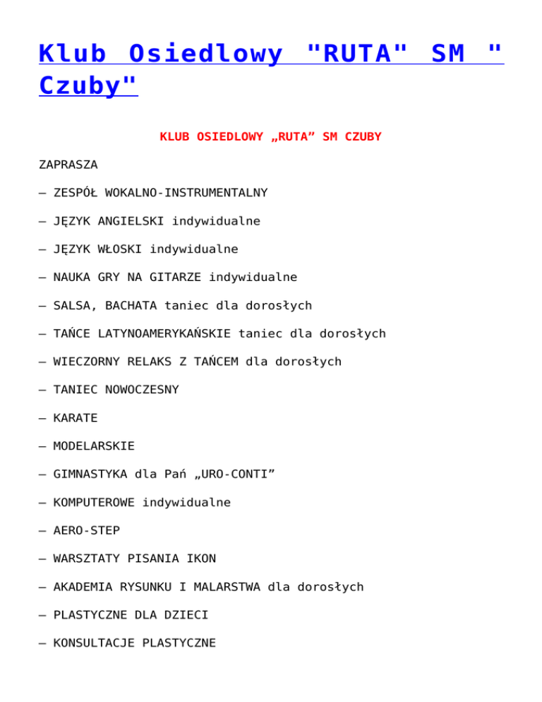 Klub Osiedlowy "RUTA" SM " Czuby" KLUB OSIEDLOWY „RUTA” SM CZUBY ZAPRASZA – ZESPÓŁ WOKALNO-INSTRUMENTALNY – JĘZYK ANGIELSKI indywidualne – JĘZYK WŁOSKI indywidualne – NAUKA GRY NA GITARZE indywidualne – SALSA, BACHATA taniec dla dorosłych – TAŃCE LATYNOAMERYKAŃSKIE taniec dla dorosłych – WIECZORNY RELAKS Z TAŃCEM dla dorosłych – TANIEC NOWOCZESNY – KARATE – MODELARSKIE – GIMNASTYKA dla Pań „URO-CONTI” – KOMPUTEROWE indywidualne – AERO-STEP – WARSZTATY PISANIA IKON – AKADEMIA RYSUNKU I MALARSTWA dla dorosłych – PLASTYCZNE DLA DZIECI – KONSULTACJE PLASTYCZNE GALERIA RUTA Zaprasza na wystawy sztuk pięknych Zapisy przyjmujemy w DOMU KULTURY RUTA S.M. CZUBY przy ul. Różanej 8, (81 ) 463 70 30