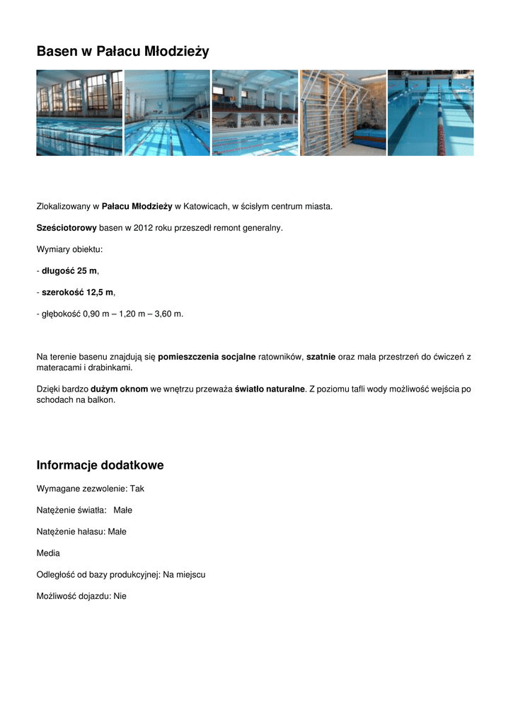 Basen w Pałacu Młodzieży Zlokalizowany w Pałacu Młodzieży w Katowicach, w ścisłym centrum miasta. Sześciotorowy basen w 2012 roku przeszedł remont generalny. Wymiary obiektu: - długość 25 m, - szerokość 12,5 m, - głębokość 0,90 m – 1,20 m – 3,60 m. Na terenie basenu znajdują się pomieszczenia socjalne ratowników, szatnie oraz mała przestrzeń do ćwiczeń z materacami i drabinkami. Dzięki bardzo dużym oknom we wnętrzu przeważa światło naturalne. Z poziomu tafli wody możliwość wejścia po schodach na balkon. Informacje dodatkowe Wymagane zezwolenie: Tak Natężenie światła: Małe Natężenie hałasu: Małe Media Odległość od bazy produkcyjnej: Na miejscu Możliwość dojazdu: Nie Powered by TCPDF (www.tcpdf.org)