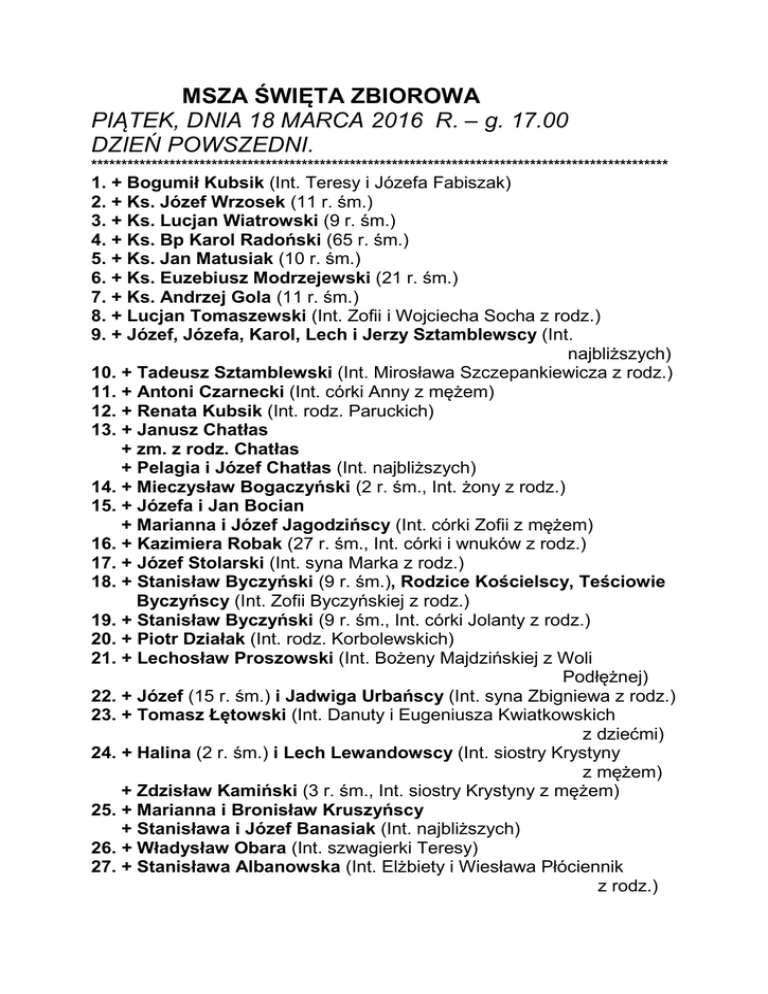 MSZA ŚWIĘTA ZBIOROWA PIĄTEK, DNIA 18 MARCA 2016 R. – g. 17.00 DZIEŃ POWSZEDNI. ************************************************************************************************ 1. + Bogumił Kubsik (Int. Teresy i Józefa Fabiszak) 2. + Ks. Józef Wrzosek (11 r. śm.) 3. + Ks. Lucjan Wiatrowski (9 r. śm.) 4. + Ks. Bp Karol Radoński (65 r. śm.) 5. + Ks. Jan Matusiak (10 r. śm.) 6. + Ks. Euzebiusz Modrzejewski (21 r. śm.) 7. + Ks. Andrzej Gola (11 r. śm.) 8. + Lucjan Tomaszewski (Int. Zofii i Wojciecha Socha z rodz.) 9. + Józef, Józefa, Karol, Lech i Jerzy Sztamblewscy (Int. najbliższych) 10. + Tadeusz Sztamblewski (Int. Mirosława Szczepankiewicza z rodz.) 11. + Antoni Czarnecki (Int. córki Anny z mężem) 12. + Renata Kubsik (Int. rodz. Paruckich) 13. + Janusz Chatłas + zm. z rodz. Chatłas + Pelagia i Józef Chatłas (Int. najbliższych) 14. + Mieczysław Bogaczyński (2 r. śm., Int. żony z rodz.) 15. + Józefa i Jan Bocian + Marianna i Józef Jagodzińscy (Int. córki Zofii z mężem) 16. + Kazimiera Robak (27 r. śm., Int. córki i wnuków z rodz.) 17. + Józef Stolarski (Int. syna Marka z rodz.) 18. + Stanisław Byczyński (9 r. śm.), Rodzice Kościelscy, Teściowie Byczyńscy (Int. Zofii Byczyńskiej z rodz.) 19. + Stanisław Byczyński (9 r. śm., Int. córki Jolanty z rodz.) 20. + Piotr Działak (Int. rodz. Korbolewskich) 21. + Lechosław Proszowski (Int. Bożeny Majdzińskiej z Woli Podłężnej) 22. + Józef (15 r. śm.) i Jadwiga Urbańscy (Int. syna Zbigniewa z rodz.) 23. + Tomasz Łętowski (Int. Danuty i Eugeniusza Kwiatkowskich z dziećmi) 24. + Halina (2 r. śm.) i Lech Lewandowscy (Int. siostry Krystyny z mężem) + Zdzisław Kamiński (3 r. śm., Int. siostry Krystyny z mężem) 25. + Marianna i Bronisław Kruszyńscy + Stanisława i Józef Banasiak (Int. najbliższych) 26. + Władysław Obara (Int. szwagierki Teresy) 27. + Stanisława Albanowska (Int. Elżbiety i Wiesława Płóciennik z rodz.)