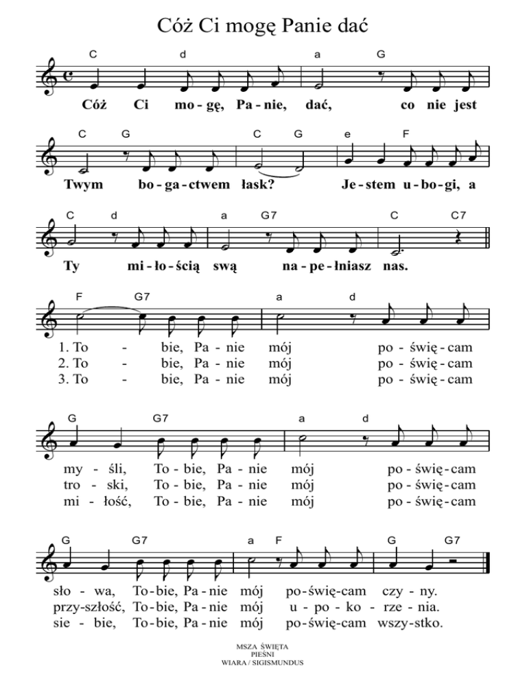 CóŜ Ci mogę Panie dać j j j œj œ œ œ C d &c œ œ CóŜ Ci C & ‰ j j œ œ Twym d & ˙ G ˙ ˙ & ˙ F œ œ œ J J J 1. To 2. To 3. To - G & œ œ J œ my - śli, tro - ski, mi - łość, œ ˙ a œ J œ œ J J œ œ œ œ J J J J œ Je - stem u - bo - gi, a C C7 Œ ˙. j œ d ‰ mój mój mój ˙ œ J sło - wa, To - bie, Pa - nie mój przy-szłość, To - bie, Pa - nie mój sie - bie, To - bie, Pa - nie mój j œ ‰ œj œj œj d mój mój mój ˙ ‰ œj œj œj a j œ po - świę - cam po - świę - cam po - świę - cam a To - bie, Pa - nie To - bie, Pa - nie To - bie, Pa - nie G7 F na - pe - łniasz nas. bie, Pa - nie bie, Pa - nie bie, Pa - nie G7 j j j j œ œ œ œ œ e ‰ j j j œ œ œ ˙ G7 co nie jest G7 mi - ło - ścią swą Ty &œ C a j j j œ œ œ ‰ dać, bo - ga - ctwem łask? ‰ œj œj œj C G j œ G ˙ mo - gę, Pa - nie, G ˙ a F po - świę - cam po - świę - cam po - świę - cam G œ œ Ó po - świę-cam czy - ny. u - po - ko - rze - nia. po - świę-cam wszy - stko. MSZA ŚWIĘTA PIEŚNI WIARA / SIGISMUNDUS G7