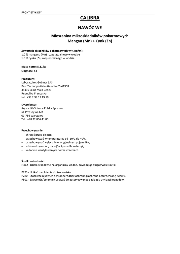 FRONT ETYKIETY___________________________________________________________________________ CALIBRA NAWÓZ WE Mieszanina mikroskładników pokarmowych Mangan (Mn) + Cynk (Zn) Zawartość składników pokarmowych w % (m/m): 1,0 % manganu (Mn) rozpuszczalnego w wodzie 1,0 % cynku (Zn) rozpuszczalnego w wodzie Masa netto: 5,31 kg Objętość: 5 l Producent: Laboratoires Goëmar SAS Parc Technopolitain Atalante CS 41908 35435 Saint-Malo Cedex Republika Francuska tel.: +33 2 99 19 19 19 Dystrybutor: Arysta LifeScience Polska Sp. z o.o. ul. Przasnyska 6 B 01-756 Warszawa Tel.: +48 22 866 41 80 Przechowywanie: chronić przed dziećmi przechowywać w temperaturze od -10oC do 40oC, przechowywać wyłącznie w oryginalnym pojemniku, z dala od żywności, napojów i pasz dla zwierząt, w dobrze wentylowanych pomieszczeniach. Środki ostrożności: H412 - Działa szkodliwie na organizmy wodne, powodując długotrwałe skutki. P273 - Unikać uwolnienia do środowiska. P280 - Stosować rękawice ochronne/odzież ochronną/ochronę oczu/ochronę twarzy. P501 - Zawartość/pojemnik usuwać do autoryzowanego zakładu utylizacji odpadów. TYŁ ETYKIETY___________________________________________________________________________ CALIBRA została wyprodukowana w oparciu o unikalną i opatentowaną technologię PhysioActivator™. CALIBRA zwiększa intensywność podziałów komórkowych i poprawia odżywienie młodych, intensywnie rosnących zawiązków, co gwarantuje uzyskanie większych owoców. INSTRUKCJA STOSOWANIA CALIBRA stosować jako roztwór wodny za pomocą opryskiwaczy używanych w ochronie roślin, najlepiej techniką oprysku drobnokroplistego tak, aby zapewnić całkowite zwilżenie liści i owoców. Zakres stosowania Drzewa owocowe Truskawka, malina, borówka, porzeczka i inne rośliny jagodowe (uprawa polowa) Truskawka, malina i inne rośliny jagodowe (uprawa pod osłonami) Termin stosowania Od opadania płatków, powtarzać co 10 dni Liczba zabiegów Dawka 3 2 l/ha Od zawiązania pierwszych owoców, powtarzać co 10-14 dni 3 2 l/ha Od zawiązania pierwszych owoców, powtarzać co 10-14 dni 3-5 0,1 % Sporządzanie cieczy użytkowej: Przed przystąpieniem do sporządzania cieczy użytkowej dokładnie ustalić potrzebną jej ilość. Zalecaną ilość nawozu wlać bezpośrednio do zbiornika opryskiwacza napełnionego wodą do 2/3 potrzebnej objętości (przy włączonym mieszadle). Opróżnione opakowania przepłukać wodą, a popłuczyny wlać do zbiornika opryskiwacza z cieczą użytkową. Następnie zbiornik opryskiwacza uzupełnić wodą do potrzebnej ilości. Opryskiwać z włączonym mieszadłem. Po pracy aparaturę dokładnie wymyć. W przypadku stosowania w mieszaninie z innymi nawozami i/lub środkami ochrony roślin, CALIBRA dodawać do zbiornika jako ostatni (przy włączonym mieszadle). Zalecana ilość wody: 350 - 800 l/ha. Dawkę wody dostosować do fazy rozwojowej rośliny uprawnej oraz typu używanego opryskiwacza. Stosować wyłącznie w uzasadnionej potrzebie. Nie przekraczać zalecanych dawek. Numer partii: na opakowaniu. Data produkcji: na opakowaniu. Okres przydatności nawozu do stosowania – 3 lata