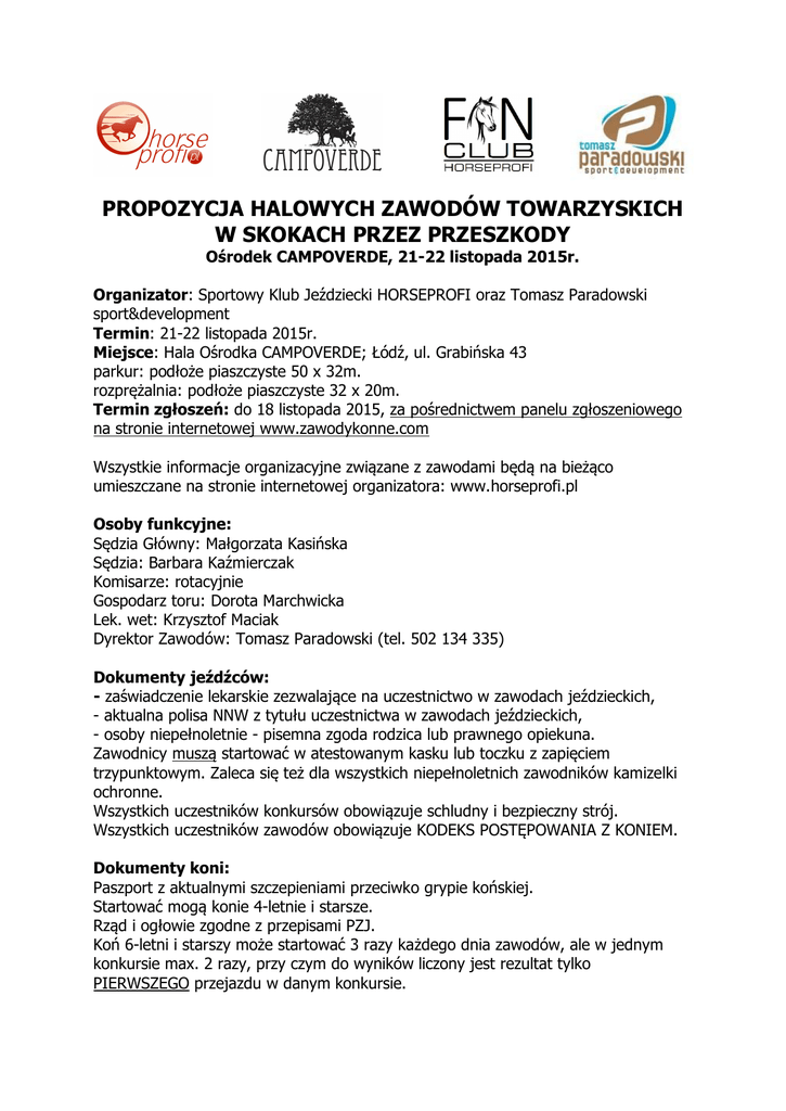 PROPOZYCJA HALOWYCH ZAWODÓW TOWARZYSKICH W SKOKACH PRZEZ PRZESZKODY Ośrodek CAMPOVERDE, 21-22 listopada 2015r. Organizator: Sportowy Klub Jeździecki HORSEPROFI oraz Tomasz Paradowski sport&development Termin: 21-22 listopada 2015r. Miejsce: Hala Ośrodka CAMPOVERDE; Łódź, ul. Grabińska 43 parkur: podłoże piaszczyste 50 x 32m. rozprężalnia: podłoże piaszczyste 32 x 20m. Termin zgłoszeń: do 18 listopada 2015, za pośrednictwem panelu zgłoszeniowego na stronie internetowej www.zawodykonne.com Wszystkie informacje organizacyjne związane z zawodami będą na bieżąco umieszczane na stronie internetowej organizatora: www.horseprofi.pl Osoby funkcyjne: Sędzia Główny: Małgorzata Kasińska Sędzia: Barbara Kaźmierczak Komisarze: rotacyjnie Gospodarz toru: Dorota Marchwicka Lek. wet: Krzysztof Maciak Dyrektor Zawodów: Tomasz Paradowski (tel. 502 134 335) Dokumenty jeźdźców: - zaświadczenie lekarskie zezwalające na uczestnictwo w zawodach jeździeckich, - aktualna polisa NNW z tytułu uczestnictwa w zawodach jeździeckich, - osoby niepełnoletnie - pisemna zgoda rodzica lub prawnego opiekuna. Zawodnicy muszą startować w atestowanym kasku lub toczku z zapięciem trzypunktowym. Zaleca się też dla wszystkich niepełnoletnich zawodników kamizelki ochronne. Wszystkich uczestników konkursów obowiązuje schludny i bezpieczny strój. Wszystkich uczestników zawodów obowiązuje KODEKS POSTĘPOWANIA Z KONIEM. Dokumenty koni: Paszport z aktualnymi szczepieniami przeciwko grypie końskiej. Startować mogą konie 4-letnie i starsze. Rząd i ogłowie zgodne z przepisami PZJ. Koń 6-letni i starszy może startować 3 razy każdego dnia zawodów, ale w jednym konkursie max. 2 razy, przy czym do wyników liczony jest rezultat tylko PIERWSZEGO przejazdu w danym konkursie. Nagrody: Rzeczowe, (w zależności: od pozyskanych sponsorów). Puchary za pierwsze miejsca w konkursach. Flots dla pierwszych 3-5 koni w konkursie (w zależności: od ilości uczestników, rodzaju konkursu, wyników). Opłaty: Opłata organizacyjna za konia (jednorazowa): 50 zł za jeden dzień zawodów 90 zł za dwa dni zawodów zgłoszenie do zawodów poza wyznaczonym terminem: 60 zł za każdy dzień zawodów. Opłata za boks: 50zł/za każdy dzień zawodów (liczba dostępnych boksów ograniczona; decyduje kolejność wpłat dokonanych na konto organizatora; organizator zapewnia siano, słomę i owies dla koni) Opłaty organizacyjne oraz za boks należy kierować na konto bankowe organizatora: mBank; 28 1140 2004 0000 3902 3232 9841 Tomasz Paradowski sport&development w terminie do dnia 19 listopada 2015 roku. Komitet Organizacyjny nie ponosi żadnej odpowiedzialności w razie wypadków i zachorowań trenera, zawodników, luzaków i koni, jak również w przypadku kradzieży, zniszczeń, pożarów i innych wydarzeń. Zawodnicy i właściciele odpowiadają osobiście za zniszczenia w stosunku do osób trzecich, spowodowane przez nich samych, ich pracowników lub ich konie. Dlatego zalecane jest zawarcie stosownego pełnego ubezpieczenia OC na czas udziału w zawodach. Organizator zastrzega sobie prawo do zmian w programie zawodów. Sprawdzanie dokumentów: 21 listopada (sobota) w godz. 09:00 – 10:00 (na krytej ujeżdżalni). Program zawodów: Sobota 21 listopada 2015 Konkurs nr. 1 (godz. 10.00) - Konkurs 50 cm. z trafieniem w normę czasu dodatek S. Klasyfikacja w dwóch kategoriach wiekowych – osobno dla zawodników do 30 roku życia oraz powyżej 30 roku życia. Konkurs nr. 2 - Konkurs 80 cm. Dokładności. Konkurs nr. 3 – Konkurs specjalny. Wyścigi wokół beczek (zasady konkursu zostaną podane na stronie internetowej organizatora, najpóźniej na dwa tygodnie przed rozpoczęciem zawodów). Konkurs nr. 4 - Konkurs klasy L, zwykły. Konkurs nr. 5 - Konkurs specjalny, barier, klasy L1. Niedziela 22 listopada 2015 Konkurs nr. 6 (godz. 10.00) - Konkurs 50 cm. Dokładności. Konkurs nr. 7 - Konkurs specjalny 80 cm. eliminacji „SIWE vs GNIADE”. Konkurs nr. 8 – Konkurs specjalny sztafet (zasady konkursu zostaną podane na stronie internetowej organizatora, najpóźniej na dwa tygodnie przed rozpoczęciem zawodów). Konkurs nr. 9 - Konkurs klasy L, dwufazowy. Konkurs nr. 10 - Konkurs klasy L1, zwykły, o puchar Prezesa Sportowego Klubu Jeździeckiego HORSEPROFI. UWAGA!!! Godziny rozpoczęcia konkursów są uzależnione od ilości zgłoszonych par Na terenie zawodów będzie otwarty punkt gastronomiczny. KODEKS POSTĘPOWANIA Z KONIEM 1. Na wszystkich etapach treningu i przygotowania konia do startu w zawodach, dobro konia musi stać ponad wszelkimi innymi wymaganiami. Dotyczy to stałej opieki, metod treningu, starannego obrządku, kucia i transportu. 2. Konie i jeźdźcy muszą być wytrenowani, kompetentni i zdrowi zanim wezmą udział w zawodach. Odnosi się to także do podawania leków i środków medycznych, zabiegów chirurgicznych zagrażających dobru konia lub ciąży klaczy oraz do przypadków nadużywania pomocy. 3. Zawody nie mogą zagrażać dobru konia. Wymaga to zwrócenia szczególnej uwagi na teren zawodów, powierzchnię podłoża, pogodę, warunki stajenne, kondycję koni i ich bezpieczeństwo, także podczas podróży powrotnej z zawodów. 4. Należy dołożyć wszelkich starań, aby zapewnić koniom staranna opiekę po zakończeniu zawodów a także humanitarne traktowanie po zakończeniu kariery sportowej. Dotyczy to właściwej opieki weterynaryjnej obrażeń odniesionych na zawodach , spokojnej starości, ewentualnie eutanazji. 5. PZJ zachęca wszystkie osoby działające w sporcie jeździeckim do stałego podnoszenia swojej wiedzy oraz umiejętności dotyczących wszelkich aspektów współpracy z koniem. Propozycje zatwierdzone przez Okręgowy Związek Jeździecki w Łodzi dnia 23.10.2015 roku