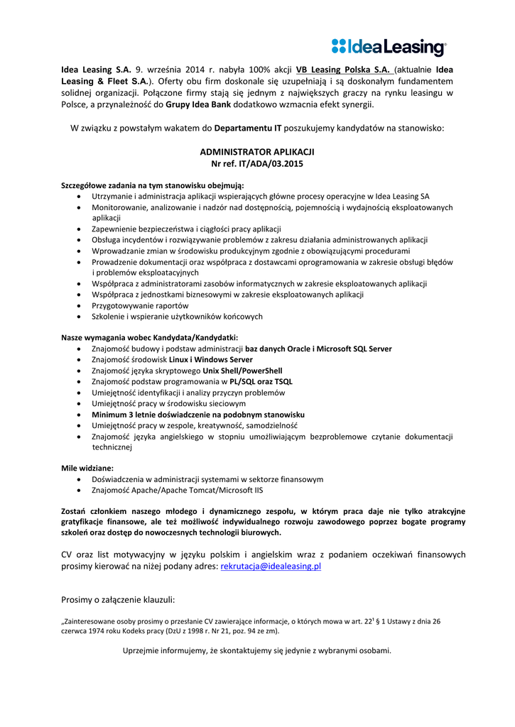 Idea Leasing S.A. 9. września 2014 r. nabyła 100% akcji VB Leasing Polska S.A. (aktualnie Idea Leasing & Fleet S.A.). Oferty obu firm doskonale się uzupełniają i są doskonałym fundamentem solidnej organizacji. Połączone firmy stają się jednym z największych graczy na rynku leasingu w Polsce, a przynależność do Grupy Idea Bank dodatkowo wzmacnia efekt synergii. W związku z powstałym wakatem do Departamentu IT poszukujemy kandydatów na stanowisko: ADMINISTRATOR APLIKACJI Nr ref. IT/ADA/03.2015 Szczegółowe zadania na tym stanowisku obejmują: Utrzymanie i administracja aplikacji wspierających główne procesy operacyjne w Idea Leasing SA Monitorowanie, analizowanie i nadzór nad dostępnością, pojemnością i wydajnością eksploatowanych aplikacji Zapewnienie bezpieczeństwa i ciągłości pracy aplikacji Obsługa incydentów i rozwiązywanie problemów z zakresu działania administrowanych aplikacji Wprowadzanie zmian w środowisku produkcyjnym zgodnie z obowiązującymi procedurami Prowadzenie dokumentacji oraz współpraca z dostawcami oprogramowania w zakresie obsługi błędów i problemów eksploatacyjnych Współpraca z administratorami zasobów informatycznych w zakresie eksploatowanych aplikacji Współpraca z jednostkami biznesowymi w zakresie eksploatowanych aplikacji Przygotowywanie raportów Szkolenie i wspieranie użytkowników końcowych Nasze wymagania wobec Kandydata/Kandydatki: Znajomość budowy i podstaw administracji baz danych Oracle i Microsoft SQL Server Znajomość środowisk Linux i Windows Server Znajomość języka skryptowego Unix Shell/PowerShell Znajomość podstaw programowania w PL/SQL oraz TSQL Umiejętność identyfikacji i analizy przyczyn problemów Umiejętność pracy w środowisku sieciowym Minimum 3 letnie doświadczenie na podobnym stanowisku Umiejętność pracy w zespole, kreatywność, samodzielność Znajomość języka angielskiego w stopniu umożliwiającym bezproblemowe czytanie dokumentacji technicznej Mile widziane: Doświadczenia w administracji systemami w sektorze finansowym Znajomość Apache/Apache Tomcat/Microsoft IIS Zostań członkiem naszego młodego i dynamicznego zespołu, w którym praca daje nie tylko atrakcyjne gratyfikacje finansowe, ale też możliwość indywidualnego rozwoju zawodowego poprzez bogate programy szkoleń oraz dostęp do nowoczesnych technologii biurowych. CV oraz list motywacyjny w języku polskim i angielskim wraz z podaniem oczekiwań finansowych prosimy kierować na niżej podany adres: [email protected] Prosimy o załączenie klauzuli: „Zainteresowane osoby prosimy o przesłanie CV zawierające informacje, o których mowa w art. 22¹ § 1 Ustawy z dnia 26 czerwca 1974 roku Kodeks pracy (DzU z 1998 r. Nr 21, poz. 94 ze zm). Uprzejmie informujemy, że skontaktujemy się jedynie z wybranymi osobami. Zgodnie z art. 24 ust. 1 Ustawy z dnia 29 sierpnia 1997 roku o ochronie danych osobowych (DzU z 2014 r., poz. 1182) informujemy, że administratorem danych jest Idea Leasing & Fleet S.A. z siedzibą przy ul. Strzegomska 42b, 53611 Wrocław. Przedmiotowe dane przetwarzane są w celu niezbędnym do realizowanego procesu rekrutacyjnego oraz podjęcia działań przed zawarciem umowy i nie będą udostępniane innym odbiorcom danych. Obowiązek ich podania wynika z przepisów Ustawy z dnia 26 czerwca 1974 roku Kodeks pracy (DzU z 1998 r. Nr 21, poz. 94 ze zm.) oraz wydanych na jej podstawie aktów wykonawczych. Każda osoba ma prawo dostępu do treści swoich danych oraz do ich poprawiania. Wyrażam zgodę także na przetwarzanie w przyszłości podanych w CV danych w celu związanym z przyszłymi procesami rekrutacyjnymi realizowanymi przez Idea Leasing & Fleet S.A..”