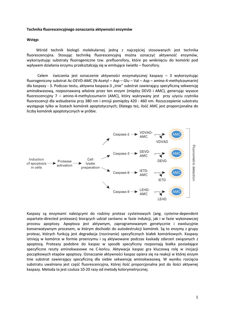 Technika fluorescencyjnego oznaczania aktywności enzymów Wstęp: Wśród technik biologii molekularnej jedną z najczęściej stosowanych jest technika fluorescencyjna. Stosując technikę fluorescencyjną można oznaczyć aktywność enzymów, wykorzystując substraty fluorogeniczne tzw. prefluorofory, które po wniknięciu do komórki pod wpływem działania enzymu przekształcają się w emitujące światło – fluorofory. Celem ćwiczenia jest oznaczenie aktywności enzymatycznej kaspazy – 3 wykorzystując fluorogeniczny substrat Ac-DEVD-AMC (N-Acetyl – Asp – Glu – Val – Asp – amino-4-methylcoumarin) dla kaspazy - 3. Podczas testu, aktywna kaspaza-3 „tnie” substrat zawierający specyficzną sekwencję aminokwasową, rozpoznawaną właśnie przez ten enzym (między DEVD i AMC), generując wysoce fluorescencyjny 7 – amino-4-methylcoumarin (AMC), który wykrywany jest przy użyciu czytnika fluorescencji dla wzbudzenia przy 380 nm i emisji pomiędzy 420 - 460 nm. Rozszczepienie substratu występuje tylko w lizatach komórek apoptotycznych; Dlatego też, ilość AMC jest proporcjonalna do liczby komórek apoptotycznych w próbie. Kaspazy są enzymami należącymi do rodziny proteaz cysteinowych (ang. cysteine-dependent aspartate-directed proteases) biorących udział zarówno w fazie indukcji, jak i w fazie wykonawczej procesu apoptozy. Apoptoza jest aktywnym, zaprogramowanym genetycznie i ewolucyjnie konserwatywnym procesem, w którym dochodzi do autodestrukcji komórek. Są to enzymy z grupy proteaz, których funkcją jest degradacja (rozcinanie) specyficznych białek komórkowych. Kaspazy istnieją w komórce w formie proenzymu i są aktywowane podczas kaskady zdarzeń związanych z apoptozą. Proteazy podobne do kaspaz w sposób specyficzny rozpoznają białka posiadające specyficzne reszty aminokwasowe na C-końcu. Aktywacja kaspaz gra kluczową rolę w inicjacji początkowych etapów apoptozy. Oznaczanie aktywności kaspaz opiera się na reakcji w której enzym tnie substrat zawierający specyficzną dla siebie sekwencję aminokwasową. W wyniku rozcięcia substratu uwalniana jest część fluorescencyjna, której ilość proporcjonalna jest do ilości aktywnej kaspazy. Metoda ta jest czulsza 10-20 razy od metody kolorymetrycznej. 1 Tabela 1: Rodzina kaspaz i specyficzne substraty. 2 Opis procedury ćwiczeń: Na zajęciach studenci wykonają analizę oznaczania aktywności enzymatycznej kaspazy – 3 używając fluorescencyjnego substratu (AC-DEVD-AMC). AC-DEVD-AMC Synonimy: Ac-Devd;AC-DMQD-AMC;AC-DEVD-MCA;AC-DEVD-AMC;ACETYL-DEVD-AMC;AC-ASPMET-GLN-ASP-AMC;AC-ASP-GLU-VAL-ASP-MCA;AC-ASP-GLU-VAL-ASP-AMC;AC-DEVD-AMC AMMONIUM SALT;CASPASE-3 FLUOROGENIC SUBSTRATE W trakcie wykonywania doświadczenia odczynniki oraz płytkę trzymamy na lodzie. 1. Płytkę z komórkami wyciągamy 10 min przed rozpoczęciem analizy z zamrażarki -70OC. 2. Do dołków płytki 96 dołkowej z posianymi komórkami dajemy po 100 µl buforu lizującego CAB na 5 min. 3. Przygotowujemy substrat do kaspazy – 3: Roztwór roboczy w CAB -----> przeliczenia na płytkę 96 dołkową 10 mM x 1000 – 10 µM 10 µl substratu + 10 ml CAB 4. Następnie dodajemy po 100 µl roztworu roboczego zawierającego 10 µM substratu kaspazy – 3. Pamietamy o kontroli negatywnej – BLANK 5. Inkubacja w ciemności 37OC przez 30 min. 6. Odczyt powtarzamy co 10 min, aż do uzyskania maksymalnej aktywności enzymu przy długości fali 360/460 nm. 7. Po zakończeniu pomiaru oznaczamy zawartość białka dodając 10 µl roztworu fluorescaminy do prób, blanku i krzywej białkowej. Fluorescaminę rozpuszczamy w acetonitrylu przed samym odczytem (5 mg fluorescaminy na 1 ml acetonitrylu). 3 Krzywa białkowa: Stężenie białka 0 µg 50 µg 100 µg 250 µg 500 µg 1000 µg BSA (1mg/ml) 0 µl 10 µl 20 µl 50 µl 100 µl 200 µl H2O destylowana 200 µl 190 µl 180 µl 150 µl 100 µl 0 µl 8. Analiza wyników: porównanie analizowanych prób do krzywej kalibracyjnej. Literatura Nicholson D, Ali A, Thornberry N, Vaillancourt J, Ding C, Gallant M, Gareau Y, Griffin P, Labelle M, Lazebnik Y: Identification and inhibition of the ICE/CED-3 protease necessary for mammalian apoptosis. Nature. 1995; 376: 37–43. Korzeniewska-Dyl I. Kaspazy – struktura i funkcja. Pol. Merk. Lek., 2007, XXIII, 138, 403. 4 Protokół oznaczenia: Data……….................................................... Próby……………………………………….…..……………….. Zakres krzywej białkowej……….……………………… 5