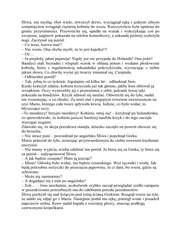 Śliwa, nie myśląc zbyt wiele, otworzył drzwi, wyciągnął rękę i jednym silnym szarpnięciem wciągnął ciężarną kobietę do wozu. Rzeczywiście była upalona do granic przytomności. Przewróciła się, upadła na wznak i wykrzykując coś po swojemu, najpierw pokazała na telefon komórkowy, a sekundę później rozłożyła nogi. Zaczynał się poród. – Co teraz, kurwa mać? – Nie wiem. Ona chyba myśli, że to jest kajetka!!! – Oż… – Ja piejdolę, jakaś pajanoja! Nigdy już nie przyjadę do Holandii! Ona jodzi! Bandyci stali bezradni i wlepiali wzrok w oblaną potem i wodami płodowymi kobietę, która z regularnością sekundnika pokrzykiwała, wyrzucając z siebie jakieś słowa. Co chwilę wyraz jej twarzy zmieniał się. Cierpiała. – Odbierałeś poród? – Tak, jobię to co tydzień. Jegulajnie od kilku lat – odburknął Jisio. Kiedy kończył zdanie, kobieta krzyczała już tak głośno, jakby ktoś oblewał ją wrzątkiem. Oczy wystrzeliły jej z przerażenia z orbit, palcami lewej ręki pokazała na bandytów. Krzyk zdawał się nasilać. Odwrócili się do tyłu, nadal nie rozumiejąc, o co chodzi. Za nimi stał z pogiętym rowerem zawieszonym na szyi Mario, którego cała twarz spływała krwią. Jedyne, co było widać, to błyszczące oczy. –To mordercy! Seryjni mordercy! Kobieto, ratuj się! – krzyknął po holendersku, co spowodowało, że kobieta jeszcze bardziej nasiliła krzyk i do tego zaczęła wierzgać nogami. Zdawało się, że akcja porodowa stanęła, dziecko zaczęło na powrót chować się do brzucha. – Nie strasz pani – powiedział po angielsku Śliwa i popchnął Greka. Mario poleciał do tyłu, zrzucając przytwierdzonym do siebie rowerem kuchenne naczynia. – Nie mamy wyjścia, trzeba odebrać ten poród. Ja biorę się za Greka, ty bierz się za poród – zadysponował Śliwa. – A jak będzie cesajski? Mam ją jozciąć? – Idioto! Główkę było widać, nie będzie cesarskiego. Weź ręczniki i wodę. Jak będą potrzebne nożyczki do przecięcia pępowiny, to ci dam, bo wiem, gdzie są schowane. – Może się zamienimy? – A dogadasz się z nim po angielsku? – Ech… – Jisio niechętnie, aczkolwiek szybko zaczął przeglądać szafki campera w poszukiwaniu potrzebnych mu do odebrania porodu przedmiotów. Śliwa pochylił się nad leżącym pod tylną ścianą Grekiem. Rozgiął rower na tyle, że udało się zdjąć go z Maria. Następnie podał mu rękę, pomógł wstać i posadził naprzeciw siebie. Krew nadal kapała z rozciętej głowy, znacząc podłogę czerwonymi kropelkami. – Słuchaj, Mario, zrobiłeś wczoraj bardzo głupią rzecz – zaczął rozmowę w miłym, pouczającym tonie. – Zabrałeś z naszego pokoju coś, co nie należy do ciebie. Największy problem jest jednak w tym, że plecak z pieniędzmi, który nam ukradłeś, nie należy też do nas. Musisz nam natychmiast go oddać, a my musimy przekazać go dalej – mówił spokojnym głosem Śliwa, cedząc wyraźnie słowa po angielsku. – Rozumiesz? – Tak. – To dobrze. Śliwa wstał i z otwartej szuflady wyjął nożyce do kurczaka. Następnie kolanem docisnął Greka do ściany campera i złapał jego rękę. Szybko włożył palec wskazujący Maria pomiędzy ostrza nożyczek i obciął go sprawnym ruchem. Grek krzyknął głośno, zanim Śliwa zakrył mu usta lewą ręką. Rodząca kobieta wydawała się być zajęta parciem, jednak kiedy zobaczyła, co się przydarzyło Grekowi, zaczęła pluć i parskać jak koń. Chciała za wszelką cenę przerwać poród i wyjść na zewnątrz. Jisio nie miał wyjścia, zwinął róg białego ręcznika i wepchnął jej go do ust. Teraz kobieta z wielkim brzuchem wyglądała, jakby najadła się ręczników, a jeden, jeszcze nie połknięty, wystawał jej z buzi.