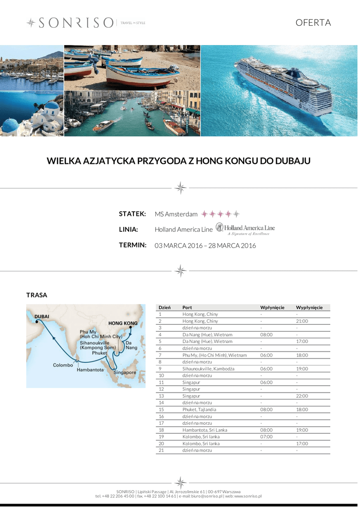OFERTA WIELKA AZJATYCKA PRZYGODA Z HONG KONGU DO DUBAJU STATEK: MS Amsterdam LINIA: Holland America Line TERMIN: 03 MARCA 2016 – 28 MARCA 2016 TRASA Dzień 1 2 3 4 5 6 7 8 9 10 11 12 13 14 15 16 17 18 19 20 21 Port Hong Kong, Chiny Hong Kong, Chiny dzień na morzu Da Nang (Hue), Wietnam Da Nang (Hue), Wietnam dzień na morzu Phu My, (Ho Chi Minh), Wietnam dzień na morzu Sihaunoukville, Kambodża dzień na morzu Singapur Singapur Singapur dzień na morzu Phuket, Tajlandia dzień na morzu dzień na morzu Hambantota, Sri Lanka Kolombo, Sri lanka Kolombo, Sri lanka dzień na morzu Wpłynięcie 08:00 06:00 06:00 06:00 08:00 08:00 07:00 - SONRISO | Lipiński Passage | Al. Jero zo limskie 61 | 00-697 Warszawa tel. +48 22 206 45 00 | fax. +48 22 100 14 61 | e-mail: biuro @so nriso .pl | web: www.so nriso .pl Wypłynięcie 21:00 17:00 18:00 19:00 22:00 18:00 19:00 17:00 - OFERTA Dzień Port Wpłynięcie Wypłynięcie 22 23 dzień na morzu dzień na morzu - - 24 dzień na morzu - - 25 Dubaj, Zjednoczone Emiraty Arabskie 08:00 - 26 Dubaj, Zjednoczone Emiraty Arabskie - - CENA Typ kabiny Cena z osobę Kabina wewnętrzna od 3 498 EUR Kabina z oknem od 3 898 EUR Verandah Suite od 6 998 EUR CENA ZAWIERA DOTATKOWE OPŁATY zakwaterowanie w 2 - os. kabinie wybranej kategorii pełne wyżywienie: 3 posiłki, przekąski między posiłakmi, bufet o północy napoje do posiłków: woda stołowa, kawa, herbata oraz sok do śniadania serwis bagażowy podczas wejścia i zejścia ze statku 24 godzinny serwis kabinowy korzystanie z urządzeń sportowo - rekreacyjnych dostępnych na pokładzie (baseny, jacuzzi, boiska sportowe, kluby dla dzieci i młodzieży itp.) udział we wszystkich imprezach organizowanych na pokładzie (przedstawienia, pokazy, aukcje, animacje i inne) obowiązkowe opłaty portowe dojazd/przelot do portu rozpoczęcia i zakończenia rejsu transfery (lotnisko - port - lotnisko) ewentulne noclegi przed lub po rejsie wycieczki fakultatywne napoje: bezalkoholowe, alkoholowe, woda mineralna dostępne w restauracjach i barach (istnieje możliwość wykupienia pakietów napojów, o szczegóły zapytaj w biurze) korzystanie z mini baru w kabinie korzystanie z usług typu: SPA, salon piękności, pralnia itp. wydatki osobiste tj. zakupy w butikach, internet, kasyno itp. obowiązkowa opłata serwisowa (napiwki dla obsługi statku ok. 12,50 USD/os. dorosła/dzień, dzieci poniżej 3 lat nie płacą) obowiązkowe ubezpieczenie turystyczne koszt wymaganych wiz Na życzenie świadczymy dodatkowo usługi: rezerwacje hotelowe na całym świecie rezerwacje biletów lotniczych, trasferów oraz parkingu w porcie rezerwacje wycieczek fakultatywnych i innych atrakcji SONRISO | Lipiński Passage | Al. Jero zo limskie 61 | 00-697 Warszawa tel. +48 22 206 45 00 | fax. +48 22 100 14 61 | e-mail: biuro @so nriso .pl | web: www.so nriso .pl