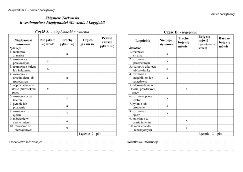 Załącznik nr 1 – pomiar początkowy Pomiar początkowy Zbigniew Tarkowski Kwestionariusz Niepłynności Mówienia i Logofobii Część A - niepłynność mówienia Niepłynność mówienia Sytuacje 1. rozmowa z matką 2. rozmowa z przełożonym 3. rozmowa z kolegą lub koleżanką 4. rozmowa z urzędnikiem lub sprzedawcą 5. odpowiadanie w klasie, przedszkolu, pracy 6. rozmowa przez telefon 7. pytanie lub proszenie 8. rozmowa z ojcem 9. mówienie w czasie imienin 10. mówienie do nieznajomych Nie jakam się wcale Trochę jąkam się Często jąkam się Część B - logofobia Prawie zawsze jąkam się x x x x x x x x x x Łącznie 7 pkt. Logofobia Sytuacje 1. rozmowa z matką 2. rozmowa z przełożonym 3. rozmowa z kolegą lub koleżanką 4. rozmowa z urzędnikiem lub sprzedawcą 5. odpowiadanie w klasie, przedszkolu, pracy 6. rozmowa przez telefon 7. pytanie lub proszenie 8. rozmowa z ojcem 9. mówienie w czasie imienin 10. mówienie do nieznajomych Nie boję się mówić Trochę boję się mówić Boję się mówić ( przeżywam strach) Bardzo boję się mówić x x x x x x x x x x Łącznie 3 pkt. Dodatkowe informacje: ……………………………………………………… Dodatkowe informacje: ……………………………………………………… ………………………………………………………………………………… ………………………………………………………………………………… Pomiar początkowy Część C – objawy neuromięśniowe, wegetatywne i psychologiczne Głowa: odwracanie …… wysuwanie głowy …… Twarz: marszczenie czoła ……. podnoszenie brwi ……. marszczenie brwi ……. przymykanie oczu ....... drganie policzków X drganie nozdrzy ……. zaciskanie warg ……. szerokie otwieranie i napinanie warg ……. wysuwanie języka ……. drganie języka ……. drganie podbródka X drganie żuchwy X Szyja: napinanie mięśni szyi ……. drżenie bądź załamanie się głosu ……. Tors: zbędne ruchy torsu ……. Ramiona: zasłanianie rękoma twarzy ……. potrząsanie ramionami ……. zaciskanie rąk ……. przebieranie palcami X Nogi: tupanie X kołysanie się X przestawianie z nogi na nogę X Objawy wegetatywne: czerwienienie X blednięcie ……. pocenie się X oziębienie dłoni ……. przyśpieszone bicie serca X Objawy psychologiczne: unikanie wzroku X utrata kontaktu wzrokowego…… Dodatkowe informacje: ………………………………………………………………………………………… ………………………………………………………………………………………… ……………………………………………………………………………………….. Łączna liczba objawów: 11 Załącznik nr 2 - pomiar końcowy Pomiar końcowy Zbigniew Tarkowski Kwestionariusz Niepłynności Mówienia i Logofobii Część B - logofobia Część A - niepłynność mówienia Niepłynność mówienia Sytuacje 1. rozmowa z matką 2. rozmowa z przełożonym 3. rozmowa z kolegą lub koleżanką 4. rozmowa z urzędnikiem lub sprzedawcą 5. odpowiadanie w klasie ,przedszkolu, pracy 6. rozmowa przez telefon 7. pytanie lub proszenie 8. rozmowa z ojcem 9. mówienie w czasie imienin 10. mówienie do nieznajomych Nie jąkam się wcale Trochę jąkam się Często jąkam się Prawie zawsze jąkam się x x x x x x x x x x Łącznie 8 pkt. Logofobia Sytuacje 1. rozmowa z matką 2. rozmowa z przełożonym 3. rozmowa z kolegą lub koleżanką 4. rozmowa z urzędnikiem lub sprzedawcą 5. odpowiadanie w klasie, przedszkolu, pracy 6. rozmowa przez telefon 7. pytanie lub proszenie 8. rozmowa z ojcem 9. mówienie w czasie imienin 10. mówienie do nieznajomych Nie boję się mówić Trochę boję się mówić Boję się mówić ( przeżywam strach) Bardzo boję się mówić x x x x x x x x x x Łącznie 0 pkt. Dodatkowe informacje: Gdy jestem zmęczony lub podekscytowany ............... Dodatkowe informacje: ……………………………………………………… ………………………………………………………………………………… ………………………………………………………………………………… Pomiar końcowy Część C – objawy neuromięśniowe, wegetatywne i psychologiczne Głowa: odwracanie …… wysuwanie głowy …… Twarz: marszczenie czoła ……. podnoszenie brwi ……. marszczenie brwi ……. przymykanie oczu ....... drganie policzków X drganie nozdrzy ……. zaciskanie warg X szerokie otwieranie i napinanie warg ……. wysuwanie języka ……. drganie języka ……. drganie podbródka X drganie żuchwy ……. Szyja: napinanie mięśni szyi X drżenie bądź załamanie się głosu ……. Tors: zbędne ruchy torsu ……. Ramiona: zasłanianie rękoma twarzy ……. potrząsanie ramionami ……. zaciskanie rąk ……. przebieranie palcami ……. Nogi: tupanie ……. kołysanie się ……. przestawianie z nogi na nogę X Objawy wegetatywne: czerwienienie ……. blednięcie ……. pocenie się ……. oziębienie dłoni ……. przyśpieszone bicie serca ……. Objawy psychologiczne: unikanie wzroku X utrata kontaktu wzrokowego ……. Dodatkowe informacje: ………………………………………………………………………………………… ………………………………………………………………………………………… ……………………………………………………………………………………….. Łączna liczba objawów 6