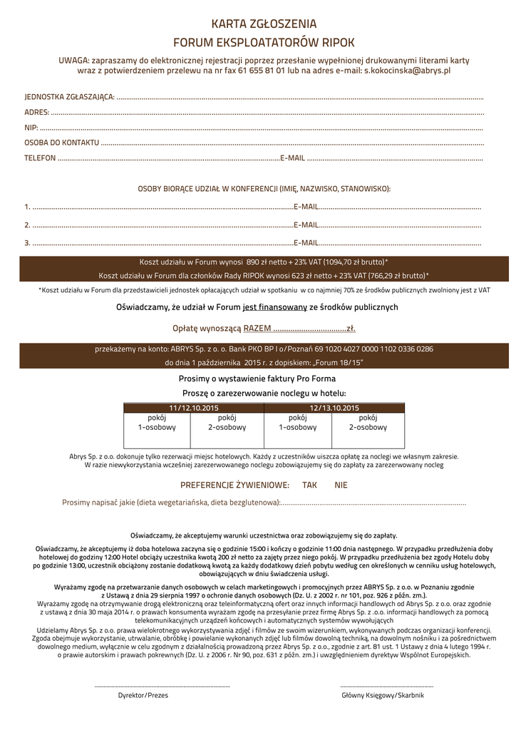 KARTA ZGŁOSZENIA FORUM EKSPLOATATORÓW RIPOK UWAGA: zapraszamy do elektronicznej rejestracji poprzez przesłanie wypełnionej drukowanymi literami karty wraz z potwierdzeniem przelewu na nr fax 61 655 81 01 lub na adres e-mail: [email protected] JEDNOSTKA ZGŁASZAJĄCA: ………………………………………………………………………………………………………………………………………………………………………. ADRES: .................................................................................................................................................................................…………………………..…………… NIP: .......................................................................................................................................................................................................………………………… OSOBA DO KONTAKTU ................................................................................................................................................................................................…… TELEFON ...................................................................................................................E-MAIL ..................................................................................……… OSOBY BIORĄCE UDZIAŁ W KONFERENCJI (IMIĘ, NAZWISKO, STANOWISKO): 1. ………………………………………………………………………………………………………………………E-MAIL………………………………………………………………………… 2. ………………………………………………………………………………………………………………………E-MAIL………………………………………………………………………… 3. ………………………………………………………………………………………………………………………E-MAIL………………………………………………………………………… Koszt udziału w Forum wynosi 890 zł netto + 23% VAT (1094,70 zł brutto)* Koszt udziału w Forum dla członków Rady RIPOK wynosi 623 zł netto + 23% VAT (766,29 zł brutto)* *Koszt udziału w Forum dla przedstawicieli jednostek opłacających udział w spotkaniu w co najmniej 70% ze środków publicznych zwolniony jest z VAT Oświadczamy, że udział w Forum jest finansowany ze środków publicznych Opłatę wynoszącą RAZEM ..................................zł. przekażemy na konto: ABRYS Sp. z o. o. Bank PKO BP I o/Poznań 69 1020 4027 0000 1102 0336 0286 do dnia 1 października 2015 r. z dopiskiem: „Forum 18/15” Prosimy o wystawienie faktury Pro Forma Proszę o zarezerwowanie noclegu w hotelu: 11/12.10.2015 pokój pokój 1-osobowy 2-osobowy 12/13.10.2015 pokój pokój 1-osobowy 2-osobowy Abrys Sp. z o.o. dokonuje tylko rezerwacji miejsc hotelowych. Każdy z uczestników uiszcza opłatę za noclegi we własnym zakresie. W razie niewykorzystania wcześniej zarezerwowanego noclegu zobowiązujemy się do zapłaty za zarezerwowany nocleg PREFERENCJE ŻYWIENIOWE: TAK NIE Prosimy napisać jakie (dieta wegetariańska, dieta bezglutenowa):…………………………………………………………………………………… Oświadczamy, że akceptujemy warunki uczestnictwa oraz zobowiązujemy się do zapłaty. Oświadczamy, że akceptujemy iż doba hotelowa zaczyna się o godzinie 15:00 i kończy o godzinie 11:00 dnia następnego. W przypadku przedłużenia doby hotelowej do godziny 12:00 Hotel obciąży uczestnika kwotą 200 zł netto za zajęty przez niego pokój. W przypadku przedłużenia bez zgody Hotelu doby po godzinie 13:00, uczestnik obciążony zostanie dodatkową kwotą za każdy dodatkowy dzień pobytu według cen określonych w cenniku usług hotelowych, obowiązujących w dniu świadczenia usługi. Wyrażamy zgodę na przetwarzanie danych osobowych w celach marketingowych i promocyjnych przez ABRYS Sp. z o.o. w Poznaniu zgodnie z Ustawą z dnia 29 sierpnia 1997 o ochronie danych osobowych (Dz. U. z 2002 r. nr 101, poz. 926 z późn. zm.). Wyrażamy zgodę na otrzymywanie drogą elektroniczną oraz teleinformatyczną ofert oraz innych informacji handlowych od Abrys Sp. z o.o. oraz zgodnie z ustawą z dnia 30 maja 2014 r. o prawach konsumenta wyrażam zgodę na przesyłanie przez firmę Abrys Sp. z .o.o. informacji handlowych za pomocą telekomunikacyjnych urządzeń końcowych i automatycznych systemów wywołujących Udzielamy Abrys Sp. z o.o. prawa wielokrotnego wykorzystywania zdjęć i filmów ze swoim wizerunkiem, wykonywanych podczas organizacji konferencji. Zgoda obejmuje wykorzystanie, utrwalanie, obróbkę i powielanie wykonanych zdjęć lub filmów dowolną techniką, na dowolnym nośniku i za pośrednictwem dowolnego medium, wyłącznie w celu zgodnym z działalnością prowadzoną przez Abrys Sp. z o.o., zgodnie z art. 81 ust. 1 Ustawy z dnia 4 lutego 1994 r. o prawie autorskim i prawach pokrewnych (Dz. U. z 2006 r. Nr 90, poz. 631 z późn. zm.) i uwzględnieniem dyrektyw Wspólnot Europejskich. ……………………………………………………………………………… Dyrektor/Prezes …………………………………………………….. Główny Księgowy/Skarbnik