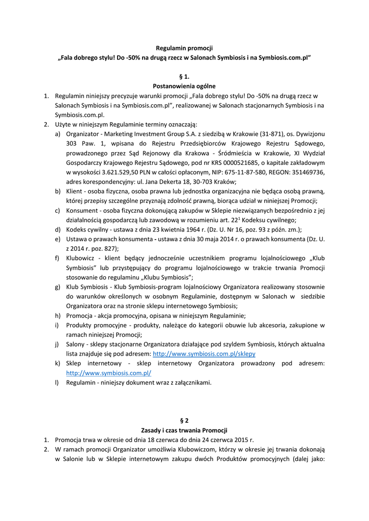 Regulamin promocji „Fala dobrego stylu! Do -50% na drugą rzecz w Salonach Symbiosis i na Symbiosis.com.pl” § 1. Postanowienia ogólne 1. Regulamin niniejszy precyzuje warunki promocji „Fala dobrego stylu! Do -50% na drugą rzecz w Salonach Symbiosis i na Symbiosis.com.pl”, realizowanej w Salonach stacjonarnych Symbiosis i na Symbiosis.com.pl. 2. Użyte w niniejszym Regulaminie terminy oznaczają: a) Organizator - Marketing Investment Group S.A. z siedzibą w Krakowie (31-871), os. Dywizjonu 303 Paw. 1, wpisana do Rejestru Przedsiębiorców Krajowego Rejestru Sądowego, prowadzonego przez Sąd Rejonowy dla Krakowa - Śródmieścia w Krakowie, XI Wydział Gospodarczy Krajowego Rejestru Sądowego, pod nr KRS 0000521685, o kapitale zakładowym w wysokości 3.621.529,50 PLN w całości opłaconym, NIP: 675-11-87-580, REGON: 351469736, adres korespondencyjny: ul. Jana Dekerta 18, 30-703 Kraków; b) Klient - osoba fizyczna, osoba prawna lub jednostka organizacyjna nie będąca osobą prawną, której przepisy szczególne przyznają zdolność prawną, biorąca udział w niniejszej Promocji; c) Konsument - osoba fizyczna dokonującą zakupów w Sklepie niezwiązanych bezpośrednio z jej działalnością gospodarczą lub zawodową w rozumieniu art. 221 Kodeksu cywilnego; d) Kodeks cywilny - ustawa z dnia 23 kwietnia 1964 r. (Dz. U. Nr 16, poz. 93 z późn. zm.); e) Ustawa o prawach konsumenta - ustawa z dnia 30 maja 2014 r. o prawach konsumenta (Dz. U. z 2014 r. poz. 827); f) Klubowicz - klient będący jednocześnie uczestnikiem programu lojalnościowego „Klub Symbiosis” lub przystępujący do programu lojalnościowego w trakcie trwania Promocji stosowanie do regulaminu „Klubu Symbiosis”; g) Klub Symbiosis - Klub Symbiosis-program lojalnościowy Organizatora realizowany stosownie do warunków określonych w osobnym Regulaminie, dostępnym w Salonach w siedzibie Organizatora oraz na stronie sklepu internetowego Symbiosis; h) Promocja - akcja promocyjna, opisana w niniejszym Regulaminie; i) Produkty promocyjne - produkty, należące do kategorii obuwie lub akcesoria, zakupione w ramach niniejszej Promocji; j) Salony - sklepy stacjonarne Organizatora działające pod szyldem Symbiosis, których aktualna lista znajduje się pod adresem: http://www.symbiosis.com.pl/sklepy k) Sklep internetowy - sklep internetowy Organizatora prowadzony pod adresem: http://www.symbiosis.com.pl/ l) Regulamin - niniejszy dokument wraz z załącznikami. §2 Zasady i czas trwania Promocji 1. Promocja trwa w okresie od dnia 18 czerwca do dnia 24 czerwca 2015 r. 2. W ramach promocji Organizator umożliwia Klubowiczom, którzy w okresie jej trwania dokonają w Salonie lub w Sklepie internetowym zakupu dwóch Produktów promocyjnych (dalej jako: „Komplet”), uzyskanie rabatu w wysokości 45% (słownie: czterdzieści pięć procent) na drugi tańszy Produkt promocyjny od jego aktualnej ceny. 3. Wskazany rabat nie łączy się z innymi akcjami promocyjnymi Organizatora za wyjątkiem rabatu wynikającego z Regulaminu „Klub Symbiosis”. Maksymalna wysokość rabatu, jaki może uzyskać Klubowicz w niniejszej Promocji wynosi 50 % (słownie: pięćdziesiąt procent). 4. Chęć przystąpienia do Promocji w Salonie należy zgłosić przed wystawieniem dokumentu fiskalnego. 1. 2. 3. 4. § 3. Zasady zwrotu i wymiany Produktów promocyjnych zakupionych w Sklepie internetowym Zgodnie z art. 27 Ustawy o prawach konsumenta Konsumentowi przysługuje prawo do odstąpienia od Umowy Sprzedaży Produktów promocyjnych bez podania jakiejkolwiek przyczyny w terminie 14 (słownie: czternastu) dni od dnia w którym Konsument wszedł w posiadanie Produktów promocyjnych lub w którym wskazana przez Konsumenta osoba trzecia inna niż Kurier weszła w posiadanie Produktów promocyjnych. Odstąpienie od umowy jest możliwe tylko w stosunku do Kompletu. Konsument ponosi odpowiedzialność za zmniejszenie wartości Produktu promocyjnego będące wynikiem korzystania z niego w sposób wykraczający poza konieczny do stwierdzenia charakteru, cech i funkcjonowania Produktu. Ponad uprawnienia Konsumenta, o których mowa w § 3. ust 1 niniejszego Regulaminu Sprzedawca przyznaje wszystkim Klientom dodatkową umowną możliwość odstąpienia od Umowy Sprzedaży bez podawania przyczyn poprzez złożenie właściwego oświadczenia Sprzedawcy na piśmie w terminie do 30 dni od daty wejścia w posiadanie Produktów promocyjnych przez Klienta, pod warunkiem że zwracane Produkty są w stanie niezmienionym, chyba że zmiana była konieczna w granicach zwykłego zarządu. Odstąpienie od umowy jest możliwe tylko w stosunku do Kompletu. W terminie 30 dni (słownie: trzydziestu) od dnia otrzymania Produktów promocyjnych mogą one zostać wymienione na inne Produkty promocyjne w tej samej cenie, pod warunkiem że zwracane produkty są w stanie niezmienionym (brak śladów użytkowania i/lub zniszczenia), chyba że zmiana była konieczna w granicach zwykłego zarządu. §4. Zasady zwrotu oraz wymiany Produktów promocyjnych zakupionych w Salonach 1. Klientowi przysługuje prawo do odstąpienia od umowy sprzedaży Produktów promocyjnych bez podania przyczyn poprzez złożenie oświadczenia na piśmie w terminie 30 dni (słownie: trzydziestu) od dnia otrzymania Produktów promocyjnych, pod warunkiem, ze zwracane produkty znajdują się w stanie niezmienionym (brak śladów użytkowania i/lub zniszczenia), chyba że zmiana była konieczna w granicach zwykłego zarządu. Odstąpienie od umowy jest możliwe tylko w stosunku do Kompletu. 2. W przypadku odstąpienia od umowy sprzedaży w ramach niniejszej Promocji Klientowi zwracana jest tylko i wyłącznie cena rzeczywiście przez niego uiszczona za Produkty promocyjne. 3. W terminie 30 dni (słownie: trzydziestu) od dnia otrzymania Produktów promocyjnych mogą one zostać wymienione na inne Produkty promocyjne w tej samej cenie, pod warunkiem że zwracane produkty są w stanie niezmienionym (brak 