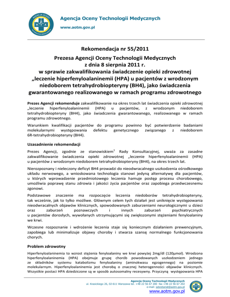 Agencja Oceny Technologii Medycznych www.aotm.gov.pl Rekomendacja nr 55/2011 Prezesa Agencji Oceny Technologii Medycznych z dnia 8 sierpnia 2011 r. w sprawie zakwalifikowania świadczenie opieki zdrowotnej „leczenie hiperfenyloalaninemii (HPA) u pacjentów z wrodzonym niedoborem tetrahydrobiopteryny (BH4), jako świadczenia gwarantowanego realizowanego w ramach programu zdrowotnego Prezes Agencji rekomenduje zakwalifikowanie na okres trzech lat świadczenia opieki zdrowotnej „leczenie hiperfenyloalaninemii (HPA) u pacjentów, z wrodzonym niedoborem tetrahydrobiopteryny (BH4), jako świadczenia gwarantowanego, realizowanego w ramach programu zdrowotnego. Warunkiem kwalifikacji pacjentów do programu powinno być potwierdzenie badaniami molekularnymi występowania defektu genetycznego związanego z niedoborem 6R‐tetrahydrobiopteryny (BH4). Uzasadnienie rekomendacji Prezes Agencji, zgodnie ze stanowiskiem1 Rady Konsultacyjnej, uważa za zasadne zakwalifikowanie świadczenia opieki zdrowotnej „leczenie hiperfenyloalaninemii (HPA) u pacjentów z wrodzonym niedoborem tetrahydrobiopteryny (BH4), na okres trzech lat. Nierozpoznany i nieleczony deficyt BH4 prowadzi do nieodwracalnego uszkodzenia ośrodkowego układu nerwowego, a wnioskowana technologia stanowi jedyną alternatywę dla pacjentów, u których wprowadzenie przedmiotowego leczenia hamuje postęp procesu chorobowego, umożliwia poprawę stanu zdrowia i jakości życia pacjentów oraz zapobiega przedwczesnemu zgonowi. Podstawowe znaczenie ma rozpoczęcie leczenia niedoborów tetrahydrobiopteryny, tak wcześnie, jak to tylko możliwe. Głównym celem tych działań jest uniknięcie występowania nieodwracalnych objawów klinicznych, spowodowanych zaburzeniami neurologicznymi u dzieci oraz zaburzeń poznawczych i innych zaburzeń psychiatrycznych u pacjentów dorosłych, wywołanych utrzymującymi się zwiększonymi stężeniami fenyloalaniny we krwi. Wczesne rozpoznanie i wdrożenie leczenia staje się koniecznym działaniem prewencyjnym, zapobiega lub minimalizuje objawy choroby i stwarza szansę normalnego funkcjonowania chorych. Problem zdrowotny Hiperfenyloalaninemia to wzrost stężenia fenyloalaniny we krwi powyżej 2mg/dl (120μmol). Wrodzona hiperfenyloalaninemia (HPA) obejmuje grupę chorób powodowanych uszkodzeniem jednego ze składników systemu katabolizmu fenyloalaniny (aminokwasu egzogennego) na poziomie molekularnym. Hiperfenyloalaninemia jest chorobą o znacznej heterogenności objawów klinicznych. Wszystkie postaci HPA dziedziczone są w sposób autosomalny recesywny. Przyczyną występowania HPA Agencja Oceny Technologii Medycznych ul. Krasickiego 26, 02-611 Warszawa tel. +48 22 56 67 200 fax +48 22 56 67 202 e-mail: [email protected] www.aotm.gov.pl Rekomendacja nr 55/2011 Prezesa AOTM z dnia 8 sierpnia 2011r. są mutacje w genie kodującym hydroksylazę fenyloalaninową (PAH), prowadzące do trwałego podwyższenia stężenia fenyloalaniny we krwi i płynach ustrojowych. Defekt ten dotyczy prawie 98% przypadków. W pozostałych przypadkach defekt dotyczy deficytu enzymów związanych z biosyntezą lub metabolizmem tetrahydrobiopteryny (BH4).2 Hiperfenyloalaninemia (HPA) spowodowana deficytem tetrahydrobiopteryny BH4 określana też, jako fenyloketonuria nietypowa lub złośliwa HPA, prowadzi do ciężkiego uszkodzenia ośrodkowego układu nerwowego (OUN). Objawy kliniczne są takie same, jak w przypadku fenyloketonurii (PKU), ale nie ustępują pod wpływem leczenia dietetycznego. Objawy uszkodzenia OUN, hipotonia, drgawki i opóźnienie rozwoju umysłowego utrzymują się i nasilają mimo eliminowania fenyloalaniny z diety. Deficyt BH4 wynika z braku lub z obniżonej aktywności jednego z 5 enzymów uczestniczących w odnawianiu aktywnej formy kofaktora lub jego syntezy de novo. W istocie deficyt BH4 stanowi kilka zróżnicowanych na poziomie molekularnym i biochemicznym wad metabolizmu. Wspólną cechą deficytu BH4 jest podwyższone stężenie fenyloalaniny we krwi oraz podobny przebieg kliniczny. BH4 jest kofaktorem hydroksylacji fenyloalaniny, ale również dwóch innych aminokwasów: tyrozyny i tryptofanu. Brak BH4 zaburza tym samym syntezę neurotransmiterów: katecholamin i serotoniny. Decyduje to o znacznie cięższym przebiegu hiperfenyloalaninemii zależnej od deficytu BH4. Pacjenci z deficytem BH4 wymagają ponadto leczenia prekursorami neurotransmiterów: lewodopą i 5‐hydroksytryptofanem. U chorych z deficytem BH4 występują ciężkie i szybko postępujące zaburzenia neurologiczne.2 Patomechanizm uszkodzenia ośrodkowego układu nerwowego wynikający z wysokiego stężenia fenyloalaniny polega na zaburzeniu transportu innych aminokwasów przez błony komórkowe i barierę krew ‐ mózg, czego konsekwencją jest zmniejszenie dostępności tyrozyny i tryptofanu dla neuronów, a także zmniejszenie syntezy neurotransmiterów – serotoniny i dopaminy. Podwyższone stężenie fenyloalaniny powoduje również zmniejszenie syntezy cerebrosulfatydów i szybszy rozpad białka podstawowego‐ mieliny; szybszy rozpad mieliny i brak zwiększonej syntezy prowadzi do demielinizacji, utraty pewnej liczby neuronów i zaburzeń przewodzenia.2 U chorych z deficytem BH4 występują ciężkie i szybko postępujące zaburzenia neurologiczne pod postacią zaburzeń napięcia mięśniowego, zwyżek temperatury ciała nie mających podłoża zakaźnego, małogłowia, opornych na leczenie napadów drgawek, postępującej ataksji, zaburzeń połykania, upośledzenia umysłowego. W większości przypadków nieleczona choroba kończy się zgonem.2 Na przestrzeni ostatnich 30 lat w międzynarodowej bazie danych zarejestrowano 495 chorych. Od wprowadzenia w 1989 r. obowiązkowej diagnostyki różnicowej HPA rozpoznaje się deficyt BH4 u 15 pacjentów rocznie na całym świecie. Aktualnie w Polsce 18 pacjentów ma zdiagnozowany deficyt BH4.2 W Polsce wykonywane są badania przesiewowe w kierunku PKU u wszystkich nowor