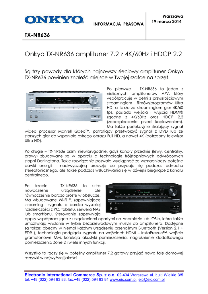 INFORMACJA PRASOWA Warszawa 19 marca 2014 TX-NR636 Onkyo TX-NR636 amplituner 7.2 z 4K/60Hz i HDCP 2.2 Są trzy powody dla których najnowszy sieciowy amplituner Onkyo TX-NR636 powinien znaleźć miejsce w Twojej szafce na sprzęt. Po pierwsze – TX-NR636 to jeden z nielicznych amplitunerów A/V, który współpracuje w pełni z przyszłościowym streamingiem filmów/programów Ultra HD, a także ze streamingiem gier 4K/60 fps, posiada wejścia i wyjścia HDMI® zgodne z 4K/60Hz oraz HDCP 2,2 (zabezpieczenie przed kopiowaniem). Ma także perfekcyjnie skalujący sygnał wideo procesor Marvell Qdeo™, potrafiący przetworzyć sygnał z DVD lub ze starszych gier do wspaniale ostrego obrazu Full HD, a nawet 4K (potrzebny telewizor Ultra HD). Po drugie – TX-NR636 brzmi niewiarygodnie, gdyż kanały przednie (lewy, centralny, prawy) zbudowane są w oparciu o technologię trójstopniowych odwróconych stopni Darlingtona. Takie rozwiązanie pozwala wyciągnąć ze wzmacniaczy potężne dawki energii i nadzwyczajną precyzję co przydaje się podczas odsłuchu stereofonicznego, ale także podczas wsłuchiwania się w dźwięki biegnące z kanału centralnego. Po trzecie – TX-NR636 to ultra nowoczesne urządzenie ale równocześnie bardzo proste w obsłudze. Ma wbudowane Wi-Fi ®, zapewniające streaming sygnału o bardzo wysokiej rozdzielczości z PC, tabletu, serwera NAS lub smartfonu. Sterowanie zapewniają appsy współpracujące z urządzeniami opartymi na Androidzie lub iOSie, które także umożliwiają wysłanie w trybie bezprzewodowym muzyki do amplitunera. Dostępne są także: obecny w niemal każdym urządzeniu przenośnym Bluetooth (Version 2.1 + EDR ), technologia podglądu sygnału na wejściach HDMI – InstaPrevue™, wejście gramofonowe MM, korekcja akustyki pomieszczenia, nagłośnienie dodatkowego pomieszczenia Zone 2 i wiele innych funkcji. Wszystko to łączy się w potężny amplituner 7.2 gotowy przyjąć nową falę domowej rozrywki w najwyższej jakości. Electronic International Commerce Sp. z o.o. 02-434 Warszawa ul. Łuki Wielkie 3/5 tel. +48 (022) 594 83 83, fax.+48 (022) 594 83 84 www.eic.com.pl, [email protected] INFORMACJA PRASOWA Warszawa 19 marca 2014 TX-NR636 Technologie w TX-NR636: Z najnowszymi łączami HDMI – gotowy na przyszłość Wyobraź sobie, że grasz w najnowszy hit RPG, który wyświetlany jest na Twoim Ultra TV z zapierająca dech w piersiach częstotliwością 60Hz. Teraj dodaj do tego grzmiący z całej siły dźwięk przestrzenny 7.2 generowany przez Onkyo TX-NR636. Z najnowszym amplitunerem ten sen może się ziścić. Nawet jeżeli nie planujesz modernizacji swojego ekranu, dobrze mieć świadomość, że TX-NR636 jest gotowy na przyszłość. Obsługuje HDCP 2.2 – zezwala na streaming 4K Studia filmowe z Hollywood, nadawcy telewizyjni i serwisy oferujące streaming wideo, zapowiadają ochronę swoich produkcji 4K i przyszłych Full HD przed kopiowaniem przez wykorzystanie kodu HDCP 2.2. Ważne jest, że Twój nowy amplituner TX-NR636 jest jednym z pierwszych na świecie, który go obsługuje. Dzięki temu jest gotowy do współpracy z następną generacją programów zrealizowanych w Ultra HD. Stream Direct ze smartfona i tabletu By korzystać z bezstratnego streamingu dźwięku, dotknij ikony Onkyo Remote App, uruchamiającej wgrany do Twojego smartfona lub tabletu program sterujący. Przy jego pomocy znajdziesz swoją ukochaną muzykę która będziesz mógł przesłać do TX-NR636 i pozwolić wszystkim by słuchali dokładnie tego co lubisz. Dla użytkowników urządzeń procujących na iOSie dostępny jest darmowy korektor graficzny ustawiający brzmienie tak jak lubisz - Onkyo HF Player. Stream Network – audio wysokiej rozdzielczości Amplitunery Onkyo zaprojektowane są tak by móc odtwarzać streaming audio o wysokiej rozdzielczości i być maksymalnie łatwymi w obsłudze. Użyj aplikacji Onkyo Remote App do znalezienia albumów z plikami 192/24 i 96/24 (łącznie z DSD 5.6 MHz) na komputerze czy serwerze NAS i rozkoszuj się jasnością, głębią i detalicznością muzyki w wysokiej rozdzielczości. Electronic International Commerce Sp. z o.o. 02-434 Warszawa ul. Łuki Wielkie 3/5 tel. +48 (022) 594 83 83, fax.+48 (022) 594 83 84 www.eic.com.pl, [email protected] INFORMACJA PRASOWA Warszawa 19 marca 2014 TX-NR636 AccuEQ Room Calibration AccuEQ optymalizuje reprodukcję dźwięku przestrzennego i dwukanałowego pod względem miejsca odsłuchu. W szczególności AccuEQ wydobywa umiejętności i osiągi głośników przednich, aby słuchana muzyka stereo było bardziej ekscytująca i dynamiczna. System analizuje ustawienia głośników i akustykę pomieszczenia z jednego miejsca odsłuchowego (co upraszcza proces kalibracji) i optymalizuje pasmo przenoszenia i poziomy wyjściowe dla poszczególnych kanałów dla uzyskania maksymalnej jakości reprodukowanego dźwięku. Właściwości Onkyo TX-NR636 Funkcje zaawansowane Porty HDMI 4K/60Hz *1 Obsługuje HDCP 2.2 – zgodność ze streamingiem programów i filmów 4K/Full HD*2 Wbudowane Wi-Fi® certyfikat zgodności Wireless LAN Bluetooth Version 2.1 + EDR (Profile: A2DP v1.2, AVRCP v1.3) z Advanced Music Optimizer DSP Technology Trójstopniowe odwrócone stopnie Darlingtona – (kanały: lewy, centralny, prawy) Skalowanie do 4K dzięki Marvell Qdeo (sygnał z wejścia HDMI) Obsługiwanie radia internetowego (TuneIn) Obsługiwanie serwisów muzycznych (Pandora®, Sptify, AUPEO!, Deezer)*3 Odtwarzanie plików audio: skompresowanych, bezstratnych i o wysokiej rozdzielczości z sieci lokalnej (MP3, WMA, WMA Lossles, FLAC, WAV, Ogg Vorbis, AAC, Apple Lossless, DSD 5,6 MHz, LPCM*4, Dolby® TrueHD) AccuEQ – kalibracja dźwięku w pokoju odsłuchowym (mikrofon w komplecie) Dolby® Pro Logic® IIz - siedmiokanałowy dźwięk przestrzenny Advanced Music Optimizer – polepszone odtwarzanie dźwięku skompresowanego (również dostarczanego przez Bluetooth) Kontrola i streaming audio 