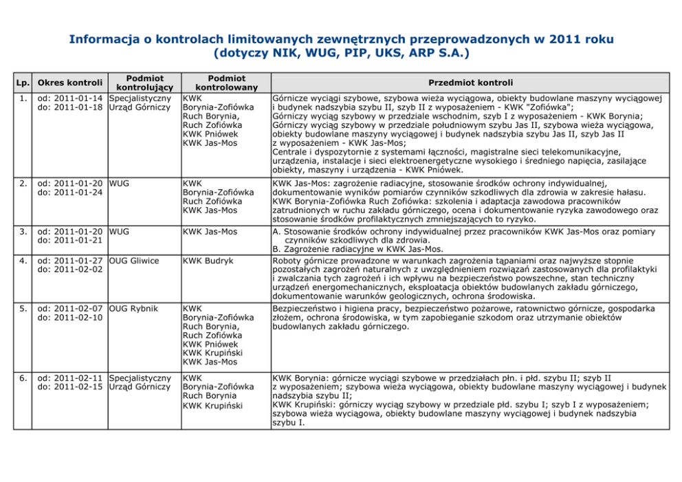 Informacja o kontrolach limitowanych zewnętrznych przeprowadzonych w 2011 roku (dotyczy NIK, WUG, PIP, UKS, ARP S.A.) Podmiot kontrolujący od: 2011-01-14 Specjalistyczny do: 2011-01-18 Urząd Górniczy Podmiot kontrolowany KWK Borynia-Zofiówka Ruch Borynia, Ruch Zofiówka KWK Pniówek KWK Jas-Mos 2. od: 2011-01-20 WUG do: 2011-01-24 KWK Borynia-Zofiówka Ruch Zofiówka KWK Jas-Mos KWK Jas-Mos: zagroŜenie radiacyjne, stosowanie środków ochrony indywidualnej, dokumentowanie wyników pomiarów czynników szkodliwych dla zdrowia w zakresie hałasu. KWK Borynia-Zofiówka Ruch Zofiówka: szkolenia i adaptacja zawodowa pracowników zatrudnionych w ruchu zakładu górniczego, ocena i dokumentowanie ryzyka zawodowego oraz stosowanie środków profilaktycznych zmniejszających to ryzyko. 3. od: 2011-01-20 WUG do: 2011-01-21 KWK Jas-Mos 4. od: 2011-01-27 OUG Gliwice do: 2011-02-02 KWK Budryk A. Stosowanie środków ochrony indywidualnej przez pracowników KWK Jas-Mos oraz pomiary czynników szkodliwych dla zdrowia. B. ZagroŜenie radiacyjne w KWK Jas-Mos. Roboty górnicze prowadzone w warunkach zagroŜenia tąpaniami oraz najwyŜsze stopnie pozostałych zagroŜeń naturalnych z uwzględnieniem rozwiązań zastosowanych dla profilaktyki i zwalczania tych zagroŜeń i ich wpływu na bezpieczeństwo powszechne, stan techniczny urządzeń energomechanicznych, eksploatacja obiektów budowlanych zakładu górniczego, dokumentowanie warunków geologicznych, ochrona środowiska. 5. od: 2011-02-07 OUG Rybnik do: 2011-02-10 KWK Borynia-Zofiówka Ruch Borynia, Ruch Zofiówka KWK Pniówek KWK Krupiński KWK Jas-Mos Bezpieczeństwo i higiena pracy, bezpieczeństwo poŜarowe, ratownictwo górnicze, gospodarka złoŜem, ochrona środowiska, w tym zapobieganie szkodom oraz utrzymanie obiektów budowlanych zakładu górniczego. 6. od: 2011-02-11 Specjalistyczny do: 2011-02-15 Urząd Górniczy KWK Borynia-Zofiówka Ruch Borynia KWK Krupiński KWK Borynia: górnicze wyciągi szybowe w przedziałach płn. i płd. szybu II; szyb II z wyposaŜeniem; szybowa wieŜa wyciągowa, obiekty budowlane maszyny wyciągowej i budynek nadszybia szybu II; KWK Krupiński: górniczy wyciąg szybowy w przedziale płd. szybu I; szyb I z wyposaŜeniem; szybowa wieŜa wyciągowa, obiekty budowlane maszyny wyciągowej i budynek nadszybia szybu I. Lp. Okres kontroli 1. Przedmiot kontroli Górnicze wyciągi szybowe, szybowa wieŜa wyciągowa, obiekty budowlane maszyny wyciągowej i budynek nadszybia szybu II, szyb II z wyposaŜeniem - KWK "Zofiówka"; Górniczy wyciąg szybowy w przedziale wschodnim, szyb I z wyposaŜeniem - KWK Borynia; Górniczy wyciąg szybowy w przedziale południowym szybu Jas II, szybowa wieŜa wyciągowa, obiekty budowlane maszyny wyciągowej i budynek nadszybia szybu Jas II, szyb Jas II z wyposaŜeniem - KWK Jas-Mos; Centrale i dyspozytornie z systemami łączności, magistralne sieci telekomunikacyjne, urządzenia, instalacje i sieci elektroenergetyczne wysokiego i średniego napięcia, zasilające obiekty, maszyny i urządzenia - KWK Pniówek. 7. od: 2011-02-16 OUG Gliwice do: 2011-02-21 KWK Budryk Roboty górnicze i gospodarka złoŜem pokładów eksploatowanych w warunkach zagroŜeń naturalnych z uwzględnieniem rozwiązań zastosowanych dla profilaktyki i zwalczania tych zagroŜeń, stan techniczny urządzeń energomechanicznych, eksploatacja obiektów budowlanych zakładu górniczego, dokumentowanie warunków geologicznych, ochrona środowiska. 8. od: do: od: do: KWK Krupiński Dokumentacja zagroŜenia radiacyjnego, dokumentacja zagroŜenia czynnikami szkodliwymi dla zdrowia w zakresie hałasu itp. A. Stosowanie środków ochrony indywidualnej przez pracowników KWK Krupiński oraz pomiary czynników szkodliwych dla zdrowia. B. ZagroŜenia radiacyjne w KWK Krupiński. Zabezpieczenia przed poŜarem, zanieczyszczeniem środowiska, wyciekami ropopochodnymi i innych substancji, Prawidłowość stosowanych rozwiązań technicznych i technologicznych w zakresie robót geologicznych, Stan zabezpieczenia części ruchomych maszyn i urządzeń energomechanicznych, przed wpływem czynnika ludzkiego na wypadkowość. 9. 2011-02-17 WUG 2011-02-18 2011-02-17 WUG 2011-02-18 KWK Krupiński 10. od: 2011-02-28 WUG do: 2011-02-28 KWK Borynia-Zofiówka Ruch Zofiówka 11. od: 2011-03-07 OUG Rybnik do: 2011-03-10 KWK Borynia-Zofiówka Ruch Borynia, Ruch Zofiówka KWK Pniówek KWK Krupiński KWK Jas-Mos Bezpieczeństwo i higiena pracy, bezpieczeństwo poŜarowe, ratownictwo górnicze, gospodarka złoŜem, ochrona środowiska, w tym zapobieganie szkodom oraz utrzymanie obiektów budowlanych zakładu górniczego. 12. od: 2011-03-11 Specjalistyczny do: 2011-03-15 Urząd Górniczy KWK Pniówek KWK Budryk KWK Borynia-Zofiówka Ruch Borynia, Ruch Zofiówka Górnicze wyciągi szybowe, szyby wraz z wyposaŜeniem, centrale telefoniczne wraz z systemami łączności, bezpieczeństwa i alarmowania, magistrale telekomunikacyjne, obiekty budowlane zakładu górniczego. 13. od: do: 14. od: do: 15. od: do: KWK Budryk Górnicze wyciągi szybowe. KWK Budryk 1. Górnicze wyciągi szybowe w szybach. 2. Obiekty budowlane zakładu górniczego. Działalność słuŜb bhp w zakładach górniczych wykonujących roboty geologiczne; aktualny stan prac geologicznych, ich zgodności z warunkami koncesji, ustaleniami projektu prac geologicznych i planem ruchu, wykonywanych przez Śląskie Towarzystwo Wiertnicze "SDalbis" Sp. z o.o. w siedzibą w Radzionkowie. 2011-03-11 2011-03-13 2011-03-11 2011-03-15 2011-03-14 2011-03-18 Specjalistyczny Urząd Górniczy Specjalistyczny Urząd Górniczy OUG Rybnik Biuro Zarządu 16. od: 2011-03-17 WUG do: 2011-03-18 KWK Borynia-Zofiówka Ruch Zofiówka Dokumentacja zagroŜenia czynnikami szkodliwymi dla zdrowia w zakresie hałasu; prawidłowość dokonywania oceny zagroŜenia czynnikami szkodliwymi dla zdrowia w zakresie hałasu; dobór środków ochrony indywidualnej w zaleŜności od poziomu występującego zagroŜen