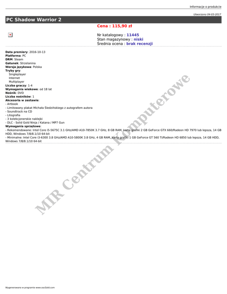 Informacje o produkcie Utworzono 04-03-2017 PC Shadow Warrior 2 Cena : 115,90 zł Nr katalogowy : 11445 Stan magazynowy : niski Średnia ocena : brak recenzji M IR C en tr um K om pu te r ow e Data premiery: 2016-10-13 Platforma: PC DRM: Steam Gatunek: Strzelanina Wersja językowa: Polska Tryby gry: Singleplayer Internet Multiplayer Liczba graczy: 1-4 Wymagania wiekowe: od 18 lat Nośnik: DVD Liczba nośników: 1 Akcesoria w zestawie: - Artbook - Limitowany plakat Michała Śledzińskiego z autografem autora - Soundtrack na CD - Litografia - 3 kolekcjonerskie naklejki - DLC - Solid Gold Ninja / Katana / MP7 Gun Wymagania sprzętowe: - Rekomendowane: Intel Core i5-5675C 3.1 GHz/AMD A10-7850K 3.7 GHz, 8 GB RAM, karta grafiki 2 GB GeForce GTX 660/Radeon HD 7970 lub lepsza, 14 GB HDD, Windows 7/8/8.1/10 64-bit - Minimalne: Intel Core i3-6300 3.8 GHz/AMD A10-5800K 3.8 GHz, 4 GB RAM, karta grafiki 1 GB GeForce GT 560 Ti/Radeon HD 6850 lub lepsza, 14 GB HDD, Windows 7/8/8.1/10 64-bit Wygenerowano w programie www.oscGold.com