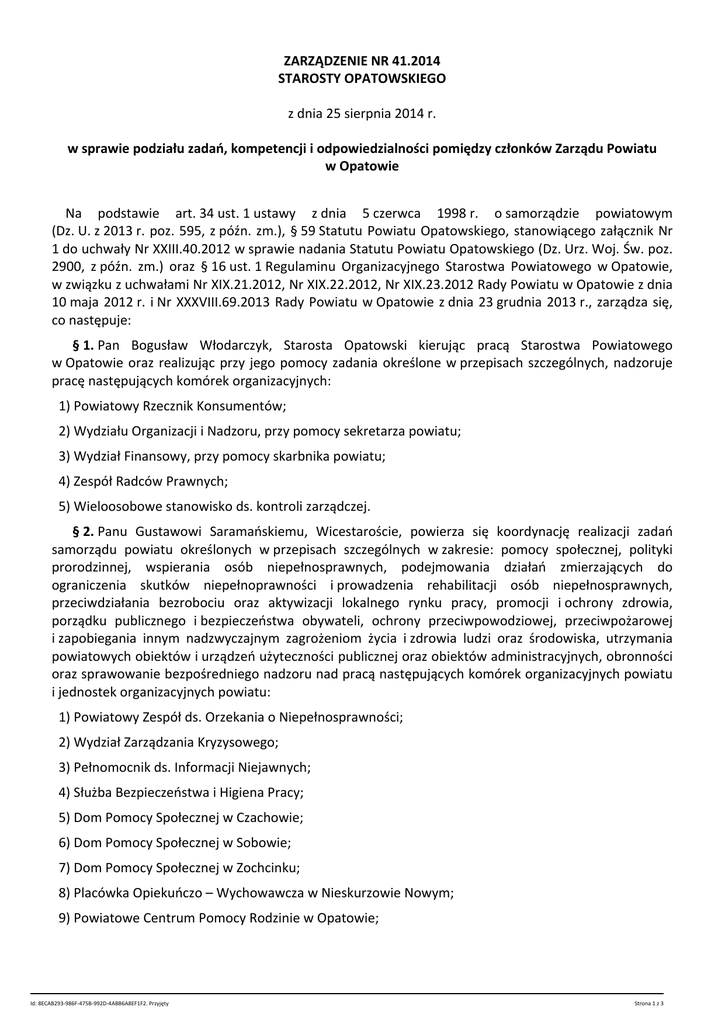 ZARZĄDZENIE NR 41.2014 STAROSTY OPATOWSKIEGO z dnia 25 sierpnia 2014 r. w sprawie podziału zadań, kompetencji i odpowiedzialności pomiędzy członków Zarządu Powiatu w Opatowie Na podstawie art. 34 ust. 1 ustawy z dnia 5 czerwca 1998 r. o samorządzie powiatowym (Dz. U. z 2013 r. poz. 595, z późn. zm.), § 59 Statutu Powiatu Opatowskiego, stanowiącego załącznik Nr 1 do uchwały Nr XXIII.40.2012 w sprawie nadania Statutu Powiatu Opatowskiego (Dz. Urz. Woj. Św. poz. 2900, z późn. zm.) oraz § 16 ust. 1 Regulaminu Organizacyjnego Starostwa Powiatowego w Opatowie, w związku z uchwałami Nr XIX.21.2012, Nr XIX.22.2012, Nr XIX.23.2012 Rady Powiatu w Opatowie z dnia 10 maja 2012 r. i Nr XXXVIII.69.2013 Rady Powiatu w Opatowie z dnia 23 grudnia 2013 r., zarządza się, co następuje: § 1. Pan Bogusław Włodarczyk, Starosta Opatowski kierując pracą Starostwa Powiatowego w Opatowie oraz realizując przy jego pomocy zadania określone w przepisach szczególnych, nadzoruje pracę następujących komórek organizacyjnych: 1) Powiatowy Rzecznik Konsumentów; 2) Wydziału Organizacji i Nadzoru, przy pomocy sekretarza powiatu; 3) Wydział Finansowy, przy pomocy skarbnika powiatu; 4) Zespół Radców Prawnych; 5) Wieloosobowe stanowisko ds. kontroli zarządczej. § 2. Panu Gustawowi Saramańskiemu, Wicestaroście, powierza się koordynację realizacji zadań samorządu powiatu określonych w przepisach szczególnych w zakresie: pomocy społecznej, polityki prorodzinnej, wspierania osób niepełnosprawnych, podejmowania działań zmierzających do ograniczenia skutków niepełnoprawności i prowadzenia rehabilitacji osób niepełnosprawnych, przeciwdziałania bezrobociu oraz aktywizacji lokalnego rynku pracy, promocji i ochrony zdrowia, porządku publicznego i bezpieczeństwa obywateli, ochrony przeciwpowodziowej, przeciwpożarowej i zapobiegania innym nadzwyczajnym zagrożeniom życia i zdrowia ludzi oraz środowiska, utrzymania powiatowych obiektów i urządzeń użyteczności publicznej oraz obiektów administracyjnych, obronności oraz sprawowanie bezpośredniego nadzoru nad pracą następujących komórek organizacyjnych powiatu i jednostek organizacyjnych powiatu: 1) Powiatowy Zespół ds. Orzekania o Niepełnosprawności; 2) Wydział Zarządzania Kryzysowego; 3) Pełnomocnik ds. Informacji Niejawnych; 4) Służba Bezpieczeństwa i Higiena Pracy; 5) Dom Pomocy Społecznej w Czachowie; 6) Dom Pomocy Społecznej w Sobowie; 7) Dom Pomocy Społecznej w Zochcinku; 8) Placówka Opiekuńczo – Wychowawcza w Nieskurzowie Nowym; 9) Powiatowe Centrum Pomocy Rodzinie w Opatowie; Id: 8ECAB293-986F-475B-992D-4ABB6A8EF1F2. Przyjęty Strona 1 z 3 10) Powiatowy Urząd Pracy w Opatowie; 11) TOP MEDICUS Sp. z o.o. § 3. Pani Marii Serwinowskiej, Członkowi Zarządu Powiatu, powierza się koordynację realizacji zadań samorządu powiatu określonych w przepisach szczególnych w zakresie: geodezji, kartografii, katastru, gospodarki nieruchomościami, gospodarki wodnej, ochrony środowiska, przyrody, rolnictwa, leśnictwa i rybactwa śródlądowego oraz sprawowanie bezpośredniego nadzoru nad pracą następujących komórek organizacyjnych powiatu: 1) Wydział Geodezji, Kartografii, Katastru i Gospodarki Mieniem; 2) Wydział Rolnictwa i Ochrony Środowiska. § 4. Pani Wiesławie Słowik, Członkowi Zarządu Powiatu, powierza się koordynację realizacji zadań samorządu powiatu określonych w przepisach szczególnych w zakresie: edukacji publicznej, kultury, ochrony zabytków, opieki nad zabytkami, kultury fizycznej, turystyki oraz sprawowanie bezpośredniego nadzoru nad pracą następujących komórek organizacyjnych powiatu i jednostek organizacyjnych powiatu: 1) Wydział Oświaty, Kultury, Kultury Fizycznej i Turystyki; 2) Zespół Szkół Nr 1 w Opatowie; 3) Zespół Szkół Nr 2 w Opatowie; 4) Zespół Szkół w Ożarowie, im. Marii Skłodowskiej – Curie; 5) Specjalny Ośrodek Szkolno – Wychowawczy w Dębnie; 6) Specjalny Ośrodek Szkolno – Wychowawczy w Jałowęsach; 7) Specjalny Ośrodek Szkolno – Wychowawczy w Niemienicach; 8) Specjalny Ośrodek Szkolno – Wychowawczy w Sulejowie; 9) Poradnia Psychologiczno – Pedagogiczna w Opatowie; 10) Poradnia Psychologiczno – Pedagogiczna w Ożarowie. § 5. Pani Jolancie Magierowskiej, Członkowi Zarządu Powiatu, powierza się koordynację realizacji zadań samorządu powiatu określonych w przepisach szczególnych w zakresie: administracji architektoniczno – budowlanej, komunikacji, transportu zbiorowego, dróg publicznych – powiatowych, promocji powiatu, współpracy i działalności na rzecz organizacji pozarządowych, działalności w zakresie telekomunikacji oraz sprawowanie bezpośredniego nadzoru nad pracą następujących komórek organizacyjnych powiatu i jednostek organizacyjnych powiatu: 1) Wydział Komunikacji, Transportu i Dróg; 2) Wydziału Promocji i Rozwoju Powiatu; 3) Wydział Budownictwa i Architektury; 4) Wydział Inwestycji; 5) Zarząd Dróg Powiatowych w Opatowie. § 6. Wykonanie zarządzenia powierza się: Staroście Opatowskiemu, Wicestaroście, Członkom Zarządu Powiatu oraz Skarbnikowi Powiatu. § 7. Tracą moc zarządzenia Nr 13.2012 z dnia 11 maja 2012 r., Nr 1.2013 z dnia 9 stycznia 2013 r. i Nr 6.2013 z dnia 31 stycznia 2014 r. Id: 8ECAB293-986F-475B-992D-4ABB6A8EF1F2. Przyjęty Strona 2 z 3 § 8. Zarządzenie wchodzi w życie z dniem podpisania. Starosta Opatowski Bogusław Włodarczyk Id: 8ECAB293-986F-475B-992D-4ABB6A8EF1F2. Przyjęty Strona 3 z 3