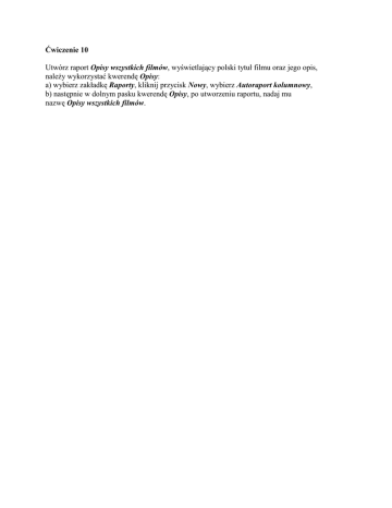 Ćwiczenie 10 Utwórz raport Opisy wszystkich filmów, wyświetlający polski tytuł filmu oraz jego opis, należy wykorzystać kwerendę Opisy: a) wybierz zakładkę Raporty, kliknij przycisk Nowy, wybierz Autoraport kolumnowy, b) następnie w dolnym pasku kwerendę Opisy, po utworzeniu raportu, nadaj mu nazwę Opisy wszystkich filmów.