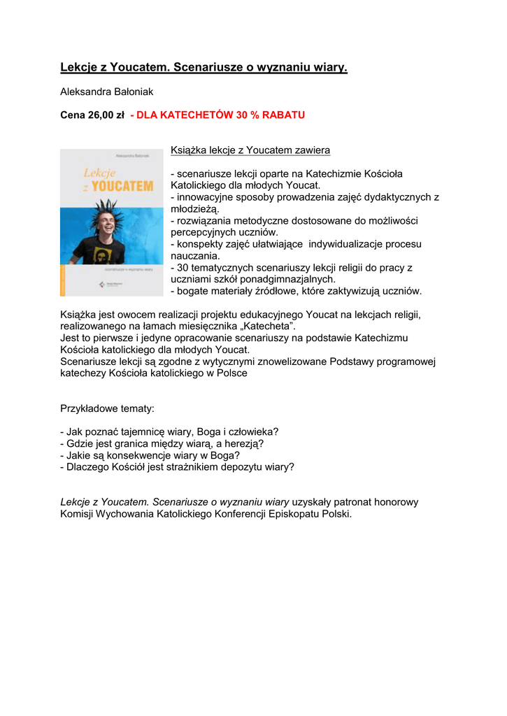 Lekcje z Youcatem. Scenariusze o wyznaniu wiary. Aleksandra Bałoniak Cena 26,00 zł - DLA KATECHETÓW 30 % RABATU Książka lekcje z Youcatem zawiera - scenariusze lekcji oparte na Katechizmie Kościoła Katolickiego dla młodych Youcat. - innowacyjne sposoby prowadzenia zajęć dydaktycznych z młodzieżą. - rozwiązania metodyczne dostosowane do możliwości percepcyjnych uczniów. - konspekty zajęć ułatwiające indywidualizacje procesu nauczania. - 30 tematycznych scenariuszy lekcji religii do pracy z uczniami szkół ponadgimnazjalnych. - bogate materiały źródłowe, które zaktywizują uczniów. Książka jest owocem realizacji projektu edukacyjnego Youcat na lekcjach religii, realizowanego na łamach miesięcznika „Katecheta”. Jest to pierwsze i jedyne opracowanie scenariuszy na podstawie Katechizmu Kościoła katolickiego dla młodych Youcat. Scenariusze lekcji są zgodne z wytycznymi znowelizowane Podstawy programowej katechezy Kościoła katolickiego w Polsce Przykładowe tematy: - Jak poznać tajemnicę wiary, Boga i człowieka? - Gdzie jest granica między wiarą, a herezją? - Jakie są konsekwencje wiary w Boga? - Dlaczego Kościół jest strażnikiem depozytu wiary? Lekcje z Youcatem. Scenariusze o wyznaniu wiary uzyskały patronat honorowy Komisji Wychowania Katolickiego Konferencji Episkopatu Polski. Krzyżówki na lekcje religii. Adwent, Boże Narodzenie, Wielki Post i Wielkanoc. Pod red. Aleksandry Bałoniak Cena 25 zł – DLA KATECHETÓW RABAT 30 % Rozwiązywanie krzyżówek to skuteczna metoda nauczania. Krzyżówka, wykorzystana w toku lekcji religii, poszerza zasób słownictwa religijnego, uczy kreatywnego myślenia, pobudza do rywalizacji w grupie rówieśniczej, stwarza okazję do zdobycia oceny. Rozwiązania krzyżówek – przysłowia i hasła – mogą z powodzeniem posłużyć jako wprowadzenie do lekcji, jej podsumowanie czy powtórka wiadomości. Książka z płytą CD W książce znajdują się szablony krzyżówek i pytania. Na płycie znajdują się szablony krzyżówek, pytania oraz rozwiązania. Katecheta - Grudniowy numer Cena 15 zł -Przełamywanie stereotypów jako metoda pracy katechetycznej - Scenariusze jasełek - Czary mary… Nie mam wiary? Youcat 356-358 - Jak wytłumaczyć długi wiek życia Adama i jego potomków? - Co znaczy, że mamy czuwać? Rozważania biblijne do Ewangelii niedzielnych Zamówienia: tel. 695 37 57 | [email protected] | www.swietywojciech.pl