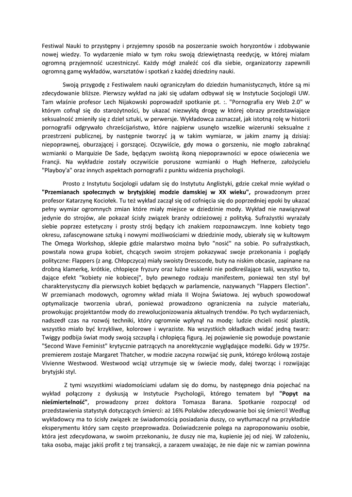 Festiwal Nauki to przystępny i przyjemny sposób na poszerzanie swoich horyzontów i zdobywanie nowej wiedzy. To wydarzenie miało w tym roku swoją dziewiętnastą reedycję, w której miałam ogromną przyjemność uczestniczyć. Każdy mógł znaleźć coś dla siebie, organizatorzy zapewnili ogromną gamę wykładów, warsztatów i spotkań z każdej dziedziny nauki. Swoją przygodę z Festiwalem nauki ograniczyłam do dziedzin humanistycznych, które są mi zdecydowanie bliższe. Pierwszy wykład na jaki się udałam odbywał się w Instytucie Socjologii UW. Tam właśnie profesor Lech Nijakowski poprowadził spotkanie pt. :. "Pornografia ery Web 2.0" w którym cofnął się do starożytności, by ukazać niezwykłą drogę w której obrazy przedstawiające seksualność zmieniły się z dzieł sztuki, w perwersje. Wykładowca zaznaczał, jak istotną rolę w historii pornografii odgrywało chrześcijaństwo, które najpierw usunęło wszelkie wizerunki seksualne z przestrzeni publicznej, by następnie tworzyć ją w takim wymiarze, w jakim znamy ją dzisiaj: niepoprawnej, oburzającej i gorszącej. Oczywiście, gdy mowa o gorszeniu, nie mogło zabraknąć wzmianki o Marquizie De Sade, będącym swoistą ikoną niepoprawności w epoce oświecenia we Francji. Na wykładzie zostały oczywiście poruszone wzmianki o Hugh Hefnerze, założycielu "Playboy'a" oraz innych aspektach pornografii z punktu widzenia psychologii. Prosto z Instytutu Socjologii udałam się do Instytutu Anglistyki, gdzie czekał mnie wykład o "Przemianach społecznych w brytyjskiej modzie damskiej w XX wieku", prowadzonym przez profesor Katarzynę Kociołek. Tu też wykład zaczął się od cofnięcia się do poprzedniej epoki by ukazać pełny wymiar ogromnych zmian które miały miejsce w dziedzinie mody. Wykład nie nawiązywał jedynie do strojów, ale pokazał ścisły związek branży odzieżowej z polityką. Sufrażystki wyrażały siebie poprzez estetyczny i prosty strój będący ich znakiem rozpoznawczym. Inne kobiety tego okresu, zafascynowane sztuką i nowymi możliwościami w dziedzinie mody, ubierały się w kultowym The Omega Workshop, sklepie gdzie malarstwo można było "nosić" na sobie. Po sufrażystkach, powstała nowa grupa kobiet, chcących swoim strojem pokazywać swoje przekonania i poglądy polityczne: Flappers (z ang. Chłopczyca) miały swoisty Dresscode, buty na niskim obcasie, zapinane na drobną klamerkę, krótkie, chłopięce fryzury oraz luźne sukienki nie podkreślające talii, wszystko to, dające efekt "kobiety nie kobiecej", było pewnego rodzaju manifestem, ponieważ ten styl był charakterystyczny dla pierwszych kobiet będących w parlamencie, nazywanych "Flappers Election". W przemianach modowych, ogromny wkład miała II Wojna Światowa. Jej wybuch spowodował optymalizacje tworzenia ubrań, ponieważ prowadzono ograniczenia na zużycie materiału, prowokując projektantów mody do zrewolucjonizowania aktualnych trendów. Po tych wydarzeniach, nadszedł czas na rozwój techniki, który ogromnie wpłynął na modę: ludzie chcieli nosić plastik, wszystko miało być krzykliwe, kolorowe i wyraziste. Na wszystkich okładkach widać jedną twarz: Twiggy podbija świat mody swoją szczupłą i chłopięcą figurą. Jej pojawienie się powoduje powstanie "Second Wave Feminist" krytycznie patrzących na anorektycznie wyglądające modelki. Gdy w 1975r. premierem zostaje Margaret Thatcher, w modzie zaczyna rozwijać się punk, którego królową zostaje Vivienne Westwood. Westwood wciąż utrzymuje się w świecie mody, dalej tworząc i rozwijając brytyjski styl. Z tymi wszystkimi wiadomościami udałam się do domu, by następnego dnia pojechać na wykład połączony z dyskusją w Instytucie Psychologii, którego tematem był "Popyt na nieśmiertelność", prowadzony przez doktora Tomasza Barana. Spotkanie rozpoczął od przedstawienia statystyk dotyczących śmierci: aż 16% Polaków zdecydowanie boi się śmierci! Według wykładowcy ma to ścisły związek ze świadomością posiadania duszy, co wytłumaczył na przykładzie eksperymentu który sam często przeprowadza. Doświadczenie polega na zaproponowaniu osobie, która jest zdecydowana, w swoim przekonaniu, że duszy nie ma, kupienie jej od niej. W założeniu, taka osoba, mając jakiś profit z tej transakcji, a zarazem uważając, że nie daje nic w zamian powinna być zadowolona, ale jak tłumaczy doktor, wszystkie osoby które zgodziły się na taką wymianę, po pewnym czasie, stwierdzały, że czują się nieswojo i chciałyby swoją duszę odkupić. Wykładowca przytoczył też przykład doświadczenia, przeprowadzonego przez psychologów ze Stanów Zjednoczonych, że osoba której wcześniej przypomniało się o śmierci, statystycznie częściej deklaruje, że jest osobą wierzącą i wierzy w nieśmiertelność duszy. Na wykładzie zostały poruszone tematy zdecydowanie kontrowersyjne, a doktor Baran nie bał się wyrażać szokujących stwierdzeń jak "myśl o zbawieniu to akt pychy". Mimo ciągłego krążenia wokół religii, spotkanie było poprowadzone zdecydowanie w sposób naukowy, co jest nie lada sztuką. Wykład został zwieńczony stwierdzeniem, że "ludzie wierzący idą do piekła, nieba, lub do czyśćca, a niewierzące, gdzie chcą". Ze wszystkich spotkań wyszłam bogata w nową wiedzę, spotkania z cyklu Festiwalu Nauki, zdecydowanie były bardziej ambitnym sposobem spędzania weekendu niż siedzenie w domu a zarazem pozwoliły mi na szersze spojrzenie na wiele aspektów z życia codziennego, oraz dały możliwość poznania innych światopoglądów. Każda osoba nie bojąca się nowych doświadczeń i lubiąca odkrywać nowe rzeczy, z pewnością znajdzie coś dla siebie w programie Festiwalu, którego kolejna edycja odbędzie się zapewne już za rok.