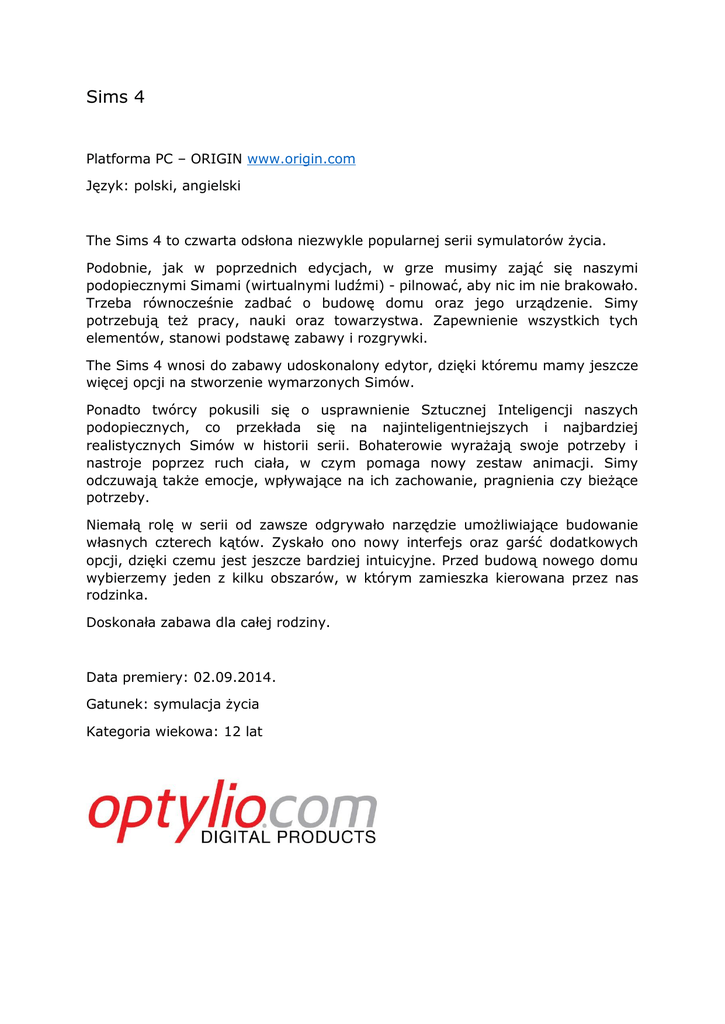 Sims 4 Platforma PC – ORIGIN www.origin.com Język: polski, angielski The Sims 4 to czwarta odsłona niezwykle popularnej serii symulatorów życia. Podobnie, jak w poprzednich edycjach, w grze musimy zająć się naszymi podopiecznymi Simami (wirtualnymi ludźmi) - pilnować, aby nic im nie brakowało. Trzeba równocześnie zadbać o budowę domu oraz jego urządzenie. Simy potrzebują też pracy, nauki oraz towarzystwa. Zapewnienie wszystkich tych elementów, stanowi podstawę zabawy i rozgrywki. The Sims 4 wnosi do zabawy udoskonalony edytor, dzięki któremu mamy jeszcze więcej opcji na stworzenie wymarzonych Simów. Ponadto twórcy pokusili się o usprawnienie Sztucznej Inteligencji naszych podopiecznych, co przekłada się na najinteligentniejszych i najbardziej realistycznych Simów w historii serii. Bohaterowie wyrażają swoje potrzeby i nastroje poprzez ruch ciała, w czym pomaga nowy zestaw animacji. Simy odczuwają także emocje, wpływające na ich zachowanie, pragnienia czy bieżące potrzeby. Niemałą rolę w serii od zawsze odgrywało narzędzie umożliwiające budowanie własnych czterech kątów. Zyskało ono nowy interfejs oraz garść dodatkowych opcji, dzięki czemu jest jeszcze bardziej intuicyjne. Przed budową nowego domu wybierzemy jeden z kilku obszarów, w którym zamieszka kierowana przez nas rodzinka. Doskonała zabawa dla całej rodziny. Data premiery: 02.09.2014. Gatunek: symulacja życia Kategoria wiekowa: 12 lat