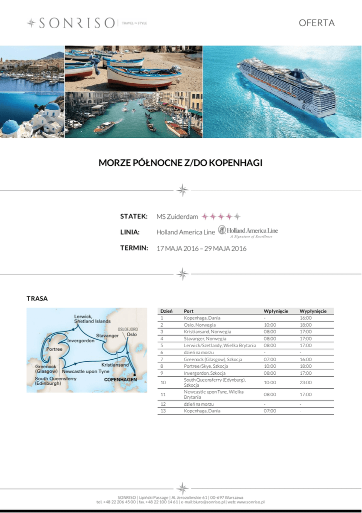 OFERTA MORZE PÓŁNOCNE Z/DO KOPENHAGI STATEK: MS Zuiderdam LINIA: Holland America Line TERMIN: 17 MAJA 2016 – 29 MAJA 2016 TRASA Dzień 1 2 3 4 5 6 7 8 9 10 11 12 13 Port Kopenhaga, Dania Oslo, Norwegia Kristiansand, Norwegia Stavanger, Norwegia Lerwick/Szetlandy, Wielka Brytania dzień na morzu Greenock (Glasgow), Szkocja Portree/Skye, Szkocja Invergordon, Szkocja South Queensferry (Edynburg), Szkocja Newcastle upon Tyne, Wielka Brytania dzień na morzu Kopenhaga, Dania Wpłynięcie 10:00 08:00 08:00 08:00 07:00 10:00 08:00 Wypłynięcie 16:00 18:00 17:00 17:00 17:00 16:00 18:00 17:00 10:00 23:00 08:00 17:00 07:00 - SONRISO | Lipiński Passage | Al. Jero zo limskie 61 | 00-697 Warszawa tel. +48 22 206 45 00 | fax. +48 22 100 14 61 | e-mail: biuro @so nriso .pl | web: www.so nriso .pl OFERTA CENA Typ kabiny Kabina wewnętrzna Cena z osobę od 799 EUR Kabina z oknem od 899 EUR Kabina z balkonem od 999 EUR Superior Verandah Suite od 1 699 EUR CENA ZAWIERA DOTATKOWE OPŁATY zakwaterowanie w 2 - os. kabinie wybranej kategorii pełne wyżywienie: 3 posiłki, przekąski między posiłakmi, bufet o północy napoje do posiłków: woda stołowa, kawa, herbata oraz sok do śniadania serwis bagażowy podczas wejścia i zejścia ze statku 24 godzinny serwis kabinowy korzystanie z urządzeń sportowo - rekreacyjnych dostępnych na pokładzie (baseny, jacuzzi, boiska sportowe, kluby dla dzieci i młodzieży itp.) udział we wszystkich imprezach organizowanych na pokładzie (przedstawienia, pokazy, aukcje, animacje i inne) obowiązkowe opłaty portowe dojazd/przelot do portu rozpoczęcia i zakończenia rejsu transfery (lotnisko - port - lotnisko) ewentulne noclegi przed lub po rejsie wycieczki fakultatywne napoje: bezalkoholowe, alkoholowe, woda mineralna dostępne w restauracjach i barach (istnieje możliwość wykupienia pakietów napojów, o szczegóły zapytaj w biurze) korzystanie z mini baru w kabinie korzystanie z usług typu: SPA, salon piękności, pralnia itp. wydatki osobiste tj. zakupy w butikach, internet, kasyno itp. obowiązkowa opłata serwisowa (napiwki dla obsługi statku ok. 12,50 USD/os. dorosła/dzień, dzieci poniżej 3 lat nie płacą) obowiązkowe ubezpieczenie turystyczne koszt wymaganych wiz Na życzenie świadczymy dodatkowo usługi: rezerwacje hotelowe na całym świecie rezerwacje biletów lotniczych, trasferów oraz parkingu w porcie rezerwacje wycieczek fakultatywnych i innych atrakcji SONRISO | Lipiński Passage | Al. Jero zo limskie 61 | 00-697 Warszawa tel. +48 22 206 45 00 | fax. +48 22 100 14 61 | e-mail: biuro @so nriso .pl | web: www.so nriso .pl