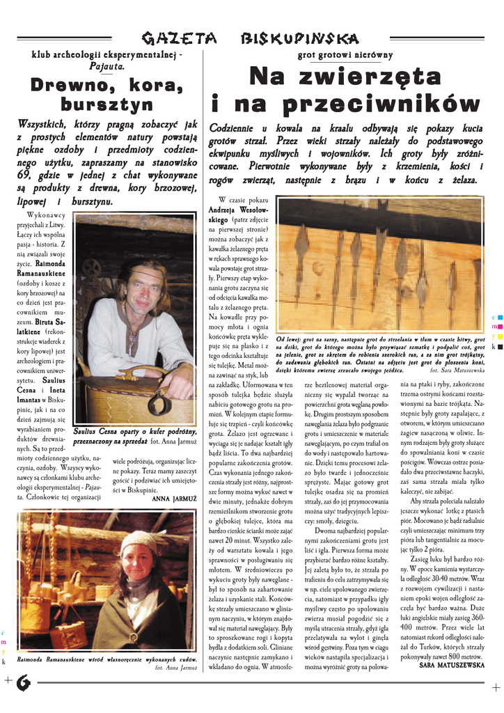 klub archeologii eksperymentalnej − Pajauta Pajauta.. Drewno, kora, bursztyn Wszystkich, którzy pragną zobaczyć jak prost ostyych element elementóów natur naturyy po pow stają z pr ost wst ają piękne ozdoby i przedmioty codziennego użytku, zapraszamy na stanowisko 69, gdzie w jednej z chat wykonywane oryy br brzzoz ozoowej, produkt oduktyy z dr dreewna, kkor or są pr odukt lipowej i bursztynu. Wykonawcy przyjechali z Litwy. Łączy ich wspólna pasja - historia. Z nią związali swoje życie. Raimonda Ramanauskiene (ozdoby i kosze z kory brzozowej) na co dzień jest pracownikiem muzeum. Biruta Salatkiene (rekonstrukcje wiaderek z kory lipowej) jest archeologiem i pracownikiem uniwersytetu. Saulius Cesna i Ineta Imantas w Biskupinie, jak i na co dzień zajmują się wyrabianiem pro- Saulius Cesna oparty o kufer podróżny, duktów drewnia- przeznaczony na sprzedaż fot. Anna Jarmuż nych. Są to przedmioty codziennego użytku, na- wiele podróżują, organizując liczczynia, ozdoby. Wszyscy wyko- ne pokazy. Teraz mamy zaszczyt nawcy są członkami klubu arche- gościć i podziwiać ich umiejętoologii eksperymentalnej - Pajau- ści w Biskupinie. ta. Członkowie tej organizacji ANNA JARMUŻ c m y k Raimonda Ramanauskiene wśród własnoręcznie wykonanych cudów. fot. Anna Jarmuż grot grotowi nierówny Na zwierzęta i na przeciwników Codziennie u kowala na kraalu odbywają się pokazy kucia grotów strzał. Przez wieki strzały należały do podstawowego ekwipunku myśliwych i wojowników. Ich groty były zróżnicow Pierw wykon onyw ywane krzzemienia, kkoś ości co wane. Pier wotnie wyk on yw ane bbyły yły z kr oś ci i rogów zwierząt, następnie z brązu i w końcu z żelaza. W czasie pokazu esoło wWesoło esołow Andrzze ja W Andr skiego (patrz zdjęcie na pierwszej stronie) można zobaczyć jak z kawałka żelaznego pręta w rękach sprawnego kowala powstaje grot strzały. Pierwszy etap wykonania grotu zaczyna się od odcięcia kawałka metalu z żelaznego pręta. Na kowadle przy pomocy młota i ognia końcówkę pręta wykle- Od lewej: grot na sarny, następnie grot do strzelania w tłum w czasie bitwy, grot puje się na płasko i z na dziki, grot do którego można było przywiązać szmatkę i podpalić coś, grot tego odcinka kształtuje na jelenie, grot ze skrętem do robienia szerokich ran, a za nim grot trójkątny, zadawania głębokich ran. Ostatni na zdjęciu jest grot do płoszenia koni, się tulejkę. Metal moż- do dzięki któremu zwierzę zrzucało swojego jeźdźca. fot. Sara Matuszewska na zawinąć na styk, lub na zakładkę. Uformowana w ten rze beztlenowej materiał orga- nia na ptaki i ryby, zakończone sposób tulejka będzie służyła niczny się wypalał tworząc na trzema ostrymi końcami rozstanabiciu gotowego grotu na pro- powierzchni grota węglaną powło- wionymi na bazie trójkąta. Namień. W kolejnym etapie formu- kę. Drugim prostszym sposobem stępnie były groty zapalające, z łuje się trzpień - czyli końcówkę nawęglania żelaza było podgrzanie otworem, w którym umieszczano grota. Żelazo jest ogrzewane i grotu i umieszczenie w materiale żagiew nasączoną w oliwie. Inwyciąga się je nadając kształt igły nawęglającym, po czym trafiał on nym rodzajem były groty służące bądź liścia. To dwa najbardziej do wody i następowało hartowa- do spowalniania koni w czasie popularne zakończenia grotów. nie. Dzięki temu procesowi żela- pościgów. Wówczas ostrze posiaCzas wykonania jednego zakoń- zo było twarde i jednocześnie dało dwa przeciwstawne haczyki, czenia strzały jest różny, najprost- sprężyste. Mając gotowy grot zaś sama strzała miała tylko sze formy można wykuć nawet w tulejkę osadza się na promień kaleczyć, nie zabijać. Aby strzała poleciała należało dwie minuty, jednakże dobrym strzały, zaś do jej przymocowania rzemieślnikom stworzenie grotu można użyć tradycyjnych lepisz- jeszcze wykonać lotkę z ptasich piór. Mocowano je bądź radialnie o głębokiej tulejce, która ma czy: smoły, dziegciu. bardzo cienkie ścianki może zająć Dwoma najbardziej popular- czyli umieszczając minimum trzy nawet 20 minut. Wszystko zale- nymi zakończeniami grotu jest pióra lub tangentialnie za mocuży od warsztatu kowala i jego liść i igła. Pierwsza forma może jąc tylko 2 pióra. Zasięg łuku był bardzo różsprawności w posługiwaniu się przybierać bardzo różne kształty. ny. W epoce kamienia wystarczymłotem. W średniowieczu po Jej zaletą było to, że strzała po wykuciu groty były nawęglane - trafieniu do celu zatrzymywała się ła odległość 30-40 metrów. Wraz był to sposób na zahartowanie w np. ciele upolowanego zwierzę- z rozwojem cywilizacji i nastażelaza i uzyskanie stali. Końców- cia, natomiast w przypadku igły niem epoki wojen odległość zakę strzały umieszczano w glinia- myśliwy często po upolowaniu częła być bardzo ważna. Duże nym naczyniu, w którym znajdo- zwierza musiał pogodzić się z łuki angielskie miały zasięg 360wał się materiał nawęglający. Były myślą utracenia strzały, gdyż igła 400 metrów. Przez wiele lat to sproszkowane rogi i kopyta przelatywała na wylot i ginęła natomiast rekord odległości nalebydła z dodatkiem soli. Gliniane wśród gęstwiny. Poza tym w ciągu żał do Turków, których strzały naczynie następnie zamykano i wieków nastąpiła specjalizacja i pokonywały nawet 800 metrów. SARA MATUSZEWSKA wkładano do ognia. W atmosfe- można wyróżnić groty na polowa- c m m y k
