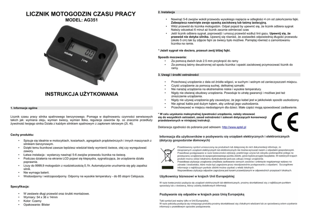 LICZNIK MOTOGODZIN CZASU PRACY 2. Instalacja MODEL: AG351 • • • Nawinąć 5-6 zwojów wokół przewodu wysokiego napięcia w odległości 4 cm od zakończenia fajki. Zabezpiecz nawinięte zwoje opaską zaciskową lub taśmą izolacyjną. Włóż przewód do licznika motogodzin. Odpal pojazd by upewnić się, że licznik odbiera sygnał. Należy odczekać 6 minut aż licznik zacznie odmierzać czas Jeśli licznik odbiera sygnał, poprowadź i umocuj przewód wzdłuż linii gazu. Upewnij się, że przewód nie dotyka silnika. Upewnij się również, że zostawiłeś odpowiednią długość przewodu (około 5 cm) tak by zdjęcie fajni ze świecy było możliwe. Pamiętaj również o zamontowaniu licznika na ramie. * Jeżeli sygnał nie dociera, przesuń zwój bliżej fajki. Sposób mocowania: • Za pomocą dwóch śrub 2.5 mm przykręcić do ramy • Za pomocą taśmy dwustronnej od spodu licznika i opaski zaciskowej przymocować licznik do ramy. 3. Uwagi i środki ostrożności INSTRUKCJA UŻYTKOWANIA 1. Informacje ogólne Licznik czasu pracy silnika spalinowego benzynowego. Pomaga w dopilnowaniu czynności serwisowych takich jak: wymiana oleju, wymian świecy, wymian tłoka, regulacja zaworów itp. co znacznie przedłuży żywotność twojego sinika Działa z każdym silnikiem spalinowym z zapłonem iskrowym (2t, 4t). • • • • • • • Przechowuj urządzenie z dala od źródła wilgoci, w suchym i wolnym od zanieczyszczeń miejscu. Czyść urządzenie za pomocą suchej, delikatnej szmatki. Nie narażaj urządzenia na ekstremalnie niskie i wysokie temperatury. Nigdy nie otwieraj obudowy urządzenia. Powoduje to utratę gwarancji i możliwe jest też zniszczenie urządzenia. Nigdy nie używaj urządzenia gdy zauważysz, że jego kabel jest w jakikolwiek sposób uszkodzony. Nie zginać kabla pod dużym kątem, aby uniknąć jego uszkodzenia. Przechowywać w miejscu niedostępnym dla dzieci. Małe części mogą spowodować zadławienie. * W celu uzyskania maksymalnej żywotności urządzenia, należy stosować się do wszystkich ostrzeżeń, zasad ostrożności i zaleceń dotyczących konserwacji przedstawionych w niniejszej instrukcji. Deklaracja zgodności do pobrania pod adresem: http://www.aptel.pl Cechy produktu: • • • • • • • Spisuje się idealnie w motocyklach, kosiarkach, agregatach prądotwórczych i innych maszynach z silnikiem benzynowym. Dzięki temu licznikowi zawsze będziesz wiedział kiedy wymienić świece, olej czy wyregulować zawory. Łatwa instalacja : wystarczy nawinąć 5-6 zwojów przewodu licznika na świecę. Podczas działania na ekranie LCD pojawi się klepsydra, sygnalizująca, że urządzenie działa poprawnie. Liczy do 9999,9 motogodzin z rozdzielczością 0,1h. Automatycznie uruchamia się gdy zapalisz silnik. Nie wymaga baterii. Wodoodporny i wstrząsoodporny. Odporny na wysokie temperatury - do 85 stopni Celsjusza. Specyfikacja: • • • • W zestawie długi przewód oraz śrubki montażowe. Wymiary: 54 x 36 x 14mm Kolor: Czarny Opakowanie: Blister