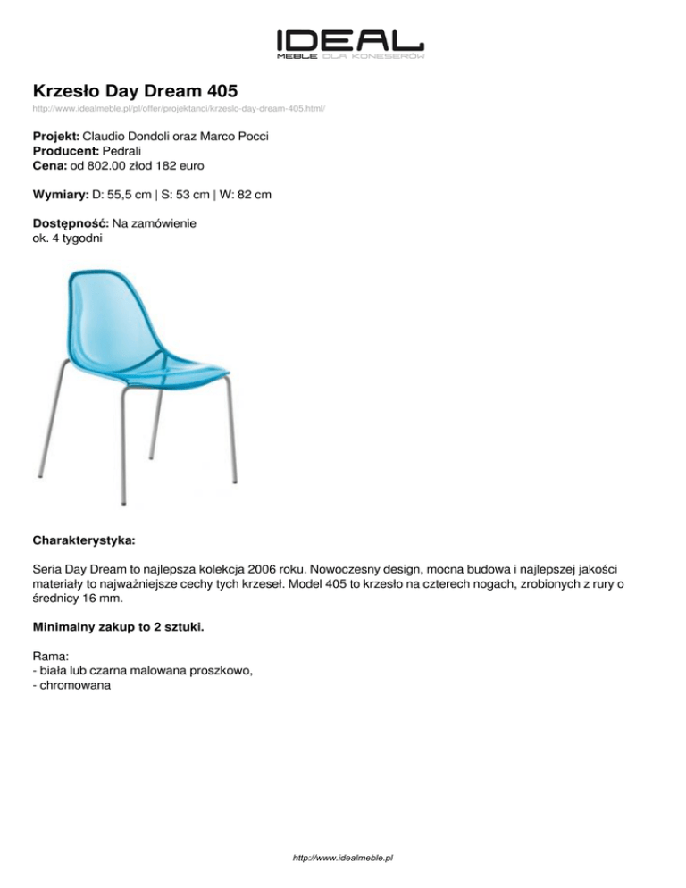 Krzesło Day Dream 405 http://www.idealmeble.pl/pl/offer/projektanci/krzeslo-day-dream-405.html/ Projekt: Claudio Dondoli oraz Marco Pocci Producent: Pedrali Cena: od 802.00 złod 182 euro Wymiary: D: 55,5 cm | S: 53 cm | W: 82 cm Dostępność: Na zamówienie ok. 4 tygodni Charakterystyka: Seria Day Dream to najlepsza kolekcja 2006 roku. Nowoczesny design, mocna budowa i najlepszej jakości materiały to najważniejsze cechy tych krzeseł. Model 405 to krzesło na czterech nogach, zrobionych z rury o średnicy 16 mm. Minimalny zakup to 2 sztuki. Rama: - biała lub czarna malowana proszkowo, - chromowana http://www.idealmeble.pl Dostępne wersje produktu: nazwa produktu Krzesło Day Dream 405 warianty kolor transparentny bezbarwny (TR) cena 802.00zł dostępne Na zamówienie Krzesło Day Dream 405 kolor transparentny czerwony (RT) 802.00zł Na zamówienie Krzesło Day Dream 405 kolor transparentny błękitny (BT) 802.00zł Na zamówienie Krzesło Day Dream 405 kolor kryjący biały (BI) 802.00zł Na zamówienie Krzesło Day Dream 405 kolor kryjący czarny (NE) Na zamówienie 802.00zł http://www.idealmeble.pl Zdjęcia produktu: http://www.idealmeble.pl Powered by TCPDF (www.tcpdf.org)