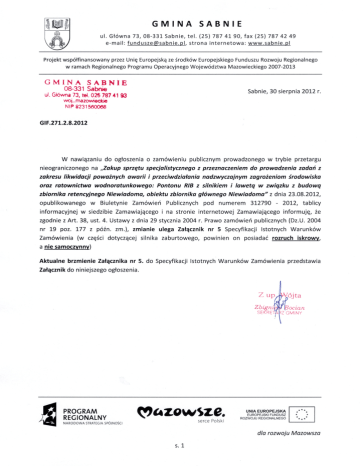 GMINA SABNIE ul. Główna 73, 08-331 Sabnie, tel. (25) 787 41 90, fax (25) 787 42 49 e-mail: [email protected], strona internetowa: www.sabnie.pl Projekt współfinansowany przez Unię Europejską ze środków Europejskiego Funduszu Rozwoju Regionalnego w ramach Regionalnego Programu Operacyjnego Województwa Mazowieckiego 2007-2013 Specyfikacja Istotnych Warunków Zamówienia na zadanie p.n. „ZAKUP SPRZĘTU SPECJALISTYCZNEGO Z PRZEZNACZENIEM DO PROWADZENIA ZADAŃ Z ZAKRESU LIKWIDACJI POWAŻNYCH AWARII I PRZECIWDZIAŁANIA NADZWYCZAJNYM ZAGROŻENIOM ŚRODOWISKA ORAZ RATOWNICTWA WODNORATUNKOWEGO: PONTONU RIB Z SILNIKIEM I LAWETĄ W ZWIĄZKU Z BUDOWĄ ZBIORNIKA RETENCYJNEGO NIEWIADOMA, OBIEKTU ZBIORNIKA GŁÓWNEGO NIEWIADOMA” GIF.271.2.8.2012 Załącznik nr 5 do SIWZ OPIS MINIMALNYCH PARAMETRÓW TECHNICZNO -UŻYTKOWYCH A. ŁÓDŹ RATOWNICZA TYPU RIB: Propozycja Wykonawcy 1.1 1.2 1.3 1.4 Długość całkowita Długość wewnętrzna Szerokość całkowita Szerokość wewnętrzna 5,60m - 6,00 m ≥ 4,40 m 2,20 - 2,50 m ≥ 1,30 m 1.5 1.6 Waga łodzi bez silnika, bez paliwa, bez wyposażenia Ładowność łodzi Zdolna do przewozu min. 7 osób Pokład ≤ 430 kg ≥ 1200 kg 2.1 wykonany z materiału antypoślizgowego dla rozwoju Mazowsza s. 1 GMINA SABNIE ul. Główna 73, 08-331 Sabnie, tel. (25) 787 41 90, fax (25) 787 42 49 e-mail: [email protected], strona internetowa: www.sabnie.pl Projekt współfinansowany przez Unię Europejską ze środków Europejskiego Funduszu Rozwoju Regionalnego w ramach Regionalnego Programu Operacyjnego Województwa Mazowieckiego 2007-2013 Specyfikacja Istotnych Warunków Zamówienia na zadanie p.n. „ZAKUP SPRZĘTU SPECJALISTYCZNEGO Z PRZEZNACZENIEM DO PROWADZENIA ZADAŃ Z ZAKRESU LIKWIDACJI POWAŻNYCH AWARII I PRZECIWDZIAŁANIA NADZWYCZAJNYM ZAGROŻENIOM ŚRODOWISKA ORAZ RATOWNICTWA WODNORATUNKOWEGO: PONTONU RIB Z SILNIKIEM I LAWETĄ W ZWIĄZKU Z BUDOWĄ ZBIORNIKA RETENCYJNEGO NIEWIADOMA, OBIEKTU ZBIORNIKA GŁÓWNEGO NIEWIADOMA” GIF.271.2.8.2012 2.2 2.3 2.4 2.5 2.6 3.1 3.2 3.3 Kołnierze pneumatyczne Odbojnice gumowe Kolor: – kołnierze – dno – napisy i oznaczenia Kołnierz: pneumatyczny z Hypalonu 1670 dtex lub równoważny: a) średnica b) ilość komór Kadłub łodzi Lina burtowa zewnętrzna Lina burtowa wewnętrzna Uchwyty burtowe Zawory napełniająco/upustowe oraz nadmiarowe Na rufie zamontowana drabina zejściowa dla nurka i rama / rączka asekuracyjna / wyposażone w antypoślizgowe maty na burtach i dziobie na całej długości czerwone czerwone białe ≥ 0,45 m ≥5 wykonany z laminatu poliestrowo-szklanego lub równoważny 1 szt. 1 szt. min. po 2 szt. po każdej stronie do każdej komory 1 kpl. dla rozwoju Mazowsza s. 2 GMINA SABNIE ul. Główna 73, 08-331 Sabnie, tel. (25) 787 41 90, fax (25) 787 42 49 e-mail: [email protected], strona internetowa: www.sabnie.pl Projekt współfinansowany przez Unię Europejską ze środków Europejskiego Funduszu Rozwoju Regionalnego w ramach Regionalnego Programu Operacyjnego Województwa Mazowieckiego 2007-2013 Specyfikacja Istotnych Warunków Zamówienia na zadanie p.n. „ZAKUP SPRZĘTU SPECJALISTYCZNEGO Z PRZEZNACZENIEM DO PROWADZENIA ZADAŃ Z ZAKRESU LIKWIDACJI POWAŻNYCH AWARII I PRZECIWDZIAŁANIA NADZWYCZAJNYM ZAGROŻENIOM ŚRODOWISKA ORAZ RATOWNICTWA WODNORATUNKOWEGO: PONTONU RIB Z SILNIKIEM I LAWETĄ W ZWIĄZKU Z BUDOWĄ ZBIORNIKA RETENCYJNEGO NIEWIADOMA, OBIEKTU ZBIORNIKA GŁÓWNEGO NIEWIADOMA” GIF.271.2.8.2012 3.4 Rama - reling rufowy w kształcie odwróconej litery U 3.5 Otwory wylotowe do wyciekania wody z pokładu łodzi oraz pompka 2 kpl. korków zenzowa elektryczna samoczynnie załączająca się - do wybierania wody z pod pokładu łodzi. Korki do wszystkich otworów wylotowych. Na dziobie i rufie knagi cumownicze 3 szt. Na dziobie i rufie ucho do holowania łodzi 2 szt. Podest dziobowy z rolką kotwiczną 1 kpl. 3.6 3.7 3.8 3.9 4.1 Komora bagażowa: - pokładowa - dziobowa Konsola Jockey 1 osobowa z owiewką i oparciem , siedzenie pokryte materiałem łatwo zmywalnym, odpornym na rozdarcia i ścieranie. W konsoli zmontowane wszystkie wymagane wskaźniki ( obrotomierz, prędkościomierz, wskaźnik poziomu paliwa, wskaźnik trymu, lampka kontroli ciśnienia oleju silnika ) oraz gniazdo zapalniczki 12 V Łódź powinna być przystosowana do napędu silnikiem zaburtowym wykonana ze stali nierdzewnej co najmniej1 szt. co najmniej1 szt. dla rozwoju Mazowsza s. 3 GMINA SABNIE ul. Główna 73, 08-331 Sabnie, tel. (25) 787 41 90, fax (25) 787 42 49 e-mail: [email protected], strona internetowa: www.sabnie.pl Projekt współfinansowany przez Unię Europejską ze środków Europejskiego Funduszu Rozwoju Regionalnego w ramach Regionalnego Programu Operacyjnego Województwa Mazowieckiego 2007-2013 Specyfikacja Istotnych Warunków Zamówienia na zadanie p.n. „ZAKUP SPRZĘTU SPECJALISTYCZNEGO Z PRZEZNACZENIEM DO PROWADZENIA ZADAŃ Z ZAKRESU LIKWIDACJI POWAŻNYCH AWARII I PRZECIWDZIAŁANIA NADZWYCZAJNYM ZAGROŻENIOM ŚRODOWISKA ORAZ RATOWNICTWA WODNORATUNKOWEGO: PONTONU RIB Z SILNIKIEM I LAWETĄ W ZWIĄZKU Z BUDOWĄ ZBIORNIKA RETENCYJNEGO NIEWIADOMA, OBIEKTU ZBIORNIKA GŁÓWNEGO NIEWIADOMA” GIF.271.2.8.2012 ( śrubowym ) wyposażona w płytę pod silnik o odpowiednich parametrach do mocy zamontowanego silnika 4.2 4.3 4.4 Zbiornik na paliwo stacjonarny ze stali nierdzewnej lub tworzywa sztucznego z zaworem odcinającym (możliwość zamknięcia z pokładu) umiejscowiony pod pokładem łodzi, wyposażony we wlew paliwa zamykany na klucz. Łódź wyposażona we wskaźnik poziomu paliwa. Kompletny układ kierowniczy umożliwiający kierowanie łodzią przy pomocy kierownicy z Jockeya , odpowiedni do wielkości łodzi i mocy zamontowanego silnika. Instalacja elektryczna odpowiednia do obsługi urządzeń pokładowych przy pełnym obciążeniu a) akumulator bezobsługowy b) główny wyłącznik – umiejscowiony na zewnątrz c) moc alternatora i pojemność akumulatorów zapewniająca pełne zapotr
