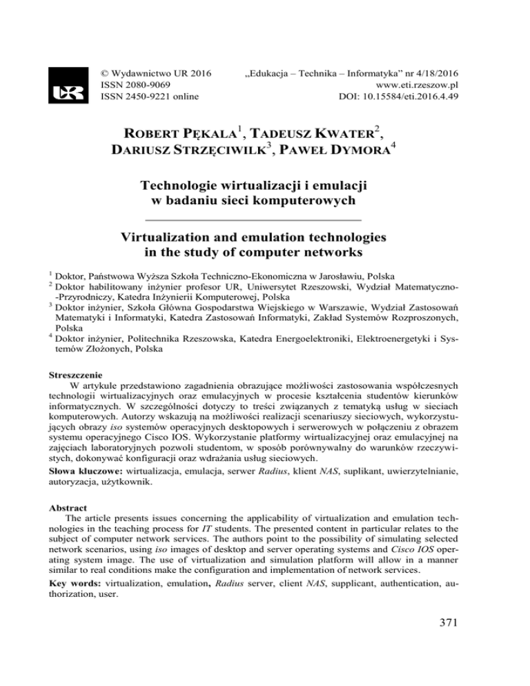 © Wydawnictwo UR 2016 ISSN 2080-9069 ISSN 2450-9221 online „Edukacja – Technika – Informatyka” nr 4/18/2016 www.eti.rzeszow.pl DOI: 10.15584/eti.2016.4.49 ROBERT PĘKALA1, TADEUSZ KWATER2, DARIUSZ STRZĘCIWILK3, PAWEŁ DYMORA4 Technologie wirtualizacji i emulacji w badaniu sieci komputerowych Virtualization and emulation technologies in the study of computer networks 1 Doktor, Państwowa Wyższa Szkoła Techniczno-Ekonomiczna w Jarosławiu, Polska Doktor habilitowany inżynier profesor UR, Uniwersytet Rzeszowski, Wydział Matematyczno-Przyrodniczy, Katedra Inżynierii Komputerowej, Polska 3 Doktor inżynier, Szkoła Główna Gospodarstwa Wiejskiego w Warszawie, Wydział Zastosowań Matematyki i Informatyki, Katedra Zastosowań Informatyki, Zakład Systemów Rozproszonych, Polska 4 Doktor inżynier, Politechnika Rzeszowska, Katedra Energoelektroniki, Elektroenergetyki i Systemów Złożonych, Polska 2 Streszczenie W artykule przedstawiono zagadnienia obrazujące możliwości zastosowania współczesnych technologii wirtualizacyjnych oraz emulacyjnych w procesie kształcenia studentów kierunków informatycznych. W szczególności dotyczy to treści związanych z tematyką usług w sieciach komputerowych. Autorzy wskazują na możliwości realizacji scenariuszy sieciowych, wykorzystujących obrazy iso systemów operacyjnych desktopowych i serwerowych w połączeniu z obrazem systemu operacyjnego Cisco IOS. Wykorzystanie platformy wirtualizacyjnej oraz emulacyjnej na zajęciach laboratoryjnych pozwoli studentom, w sposób porównywalny do warunków rzeczywistych, dokonywać konfiguracji oraz wdrażania usług sieciowych. Słowa kluczowe: wirtualizacja, emulacja, serwer Radius, klient NAS, suplikant, uwierzytelnianie, autoryzacja, użytkownik. Abstract The article presents issues concerning the applicability of virtualization and emulation technologies in the teaching process for IT students. The presented content in particular relates to the subject of computer network services. The authors point to the possibility of simulating selected network scenarios, using iso images of desktop and server operating systems and Cisco IOS operating system image. The use of virtualization and simulation platform will allow in a manner similar to real conditions make the configuration and implementation of network services. Key words: virtualization, emulation, Radius server, client NAS, supplicant, authentication, authorization, user. 371 Wstęp Rozwój technologii informatycznych doprowadził do pojawienia się w słownikach stosunkowo nowego pojęcia – przetwarzanie w chmurze (z ang. cloud computing). W rzeczywistości dotyczy ono pewnego modelu dostarczania różnego rodzaju usług IT, których różnorodność staje się coraz bogatsza. Do niedawna usługi te były kojarzone głównie z udostępnianiem przestrzeni dyskowej, jednak obecnie ich oferta obejmuje m.in. pocztę elektroniczną, serwisy WWW, sklepy internetowe, a nawet takie ambitne rozwiązania, jak np. księgowość internetowa dla firm [„Computerworld” 2016; „Networld Trendy” 2013]. Wydaje się zatem, iż nie trzeba nikogo przekonywać, jak ważne jest to zagadnienie, szczególnie dla studentów kierunków informatycznych. Z technicznego punktu widzenia, przetwarzanie w chmurze oparte jest przede wszystkim na technologii wirtualizacji. Pozwala ona m.in. na uruchamianie różnych systemów operacyjnych, a tym samym usług, w tzw. maszynach (komputerach) wirtualnych, funkcjonujących w ramach zasobów komputera fizycznego. Na jednej fizycznej maszynie teoretycznie może pracować wiele maszyn wirtualnych, przy czym zawsze należy zachować pewien umiar co do ich liczby, tak aby zachować odpowiednią wydajność przetwarzania. Współczesne oprogramowanie wirtualizacyjne daje ogromne możliwości parametryzacji maszyn wirtualnych pod kątem dostępu do fizycznych zasobów komputera w postaci pamięci RAM, dysku bądź macierzy dyskowej, interfejsów I/O, a nawet liczby rdzeni procesora/procesorów. Należy jednocześnie mieć na uwadze pewne wady technologii, związane np. z wysokimi wymaganiami co do parametrów sprzętu fizycznego (wysokie koszty), czy też zwiększonym problemem bezpieczeństwa i kontroli dostępu do danych zwirtualizowanych. Pozytywne cechy oprogramowania mogą być nieocenione w funkcjonowaniu systemów komputerowych na uczelniach. Wystarczy wskazać tutaj chociażby na możliwość względnie łatwej reinstalacji systemu wirtualnego, co w warunkach funkcjonowania laboratoriów z dużą liczbą studentów znacząco może ułatwić zarządzanie oprogramowaniem stosowanym w dydaktyce. W niniejszym artykule pragniemy wskazać na jeszcze jedną możliwość zastosowania wirtualizacji w kontekście realizacji pewnych treści nauczania w ramach przedmiotów związanych z technologiami sieci komputerowych. Jak wiadomo, realizacja treści z tego zakresu wymaga zwykle wykonywania przez studentów ćwiczeń laboratoryjnych, gdzie wykorzystuje się sprzęt w postaci urządzeń sieciowych. Prezentowane podejście pokazuje, iż alternatywą może być wykorzystanie środowiska wirtualizacyjnego oraz emulatora sieciowego. Dzięki temu studenci mogą realizować pewne scenariusze sieciowe w sposób, który nie odbiega od warunków rzeczywistych, ale bez konieczności używania fizycznego sprzętu. Wypracowane i zbadane w ten sposób konfiguracje mogą być później w tychże urządzeniach fizycznych implementowane. 372 Badanie usługi sieciowej RADIUS w środowisku VirtualBox oraz GNS3 Usługa sieciowa, działająca w oparciu o protokół RADIUS (z ang. Remote Authentication Dial-In User Service), stosowana jest głównie w celu uwierzytelniania i autoryzacji użytkowników sieci LAN, zbudowanej w technologii przewodowej, bezprzewodowej lub hybrydowej. Mówiąc inaczej, zadaniem protokołu jest potwierdzenie tożsamości logującego się w sieci użytkownika oraz upoważnienie go do korzystania z sieci LAN. To upo