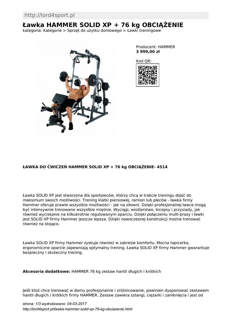 http://lord4sport.pl Ławka HAMMER SOLID XP + 76 kg OBCIĄŻENIE kategoria: Kategorie > Sprzęt do użytku domowego > Ławki treningowe Producent: HAMMER 3 999,00 zł Kod QR: ŁAWKA DO ĆWICZEŃ HAMMER SOLID XP + 76 kg OBCIĄŻENIE- 4514 Ławka SOLID XP jest stworzona dla sportowców, którzy chcą w trakcie treningu dojść do maksimum swoich możliwości. Trening klatki piersiowej, ramion lub pleców - ławka firmy Hammer oferuje prawie wszystkie możliwości - jak na siłowni. Dzięki profesjonalnej ławce mogą być intensywnie trenowane wszystkie mięśnie. Wyciągi, wioślarstwo, bicepsy i przysiady, jak również wyciskanie na kilkukrotnie regulowanym oparciu. Dzięki połączeniu multi-prasy i ławki jest SOLID XP firmy Hammer jeszcze lepsza. Dzięki nowoczesnej konstrukcji można trenować również na stojąco. Ławka SOLID XP firmy Hammer zyskuje również w zakresie komfortu. Mocna tapicerka, ergonomiczne oparcie zapewniają optymalny trening. Ławka SOLID XP firmy Hammer gwarantuje bezpieczny i skuteczny trening. Akcesoria dodatkowe: HAMMER 76 kg zestaw hantli długich i krótkich Jeśli ktoś chce trenować w domu profesjonalnie i zróżnicowanie, powinien dysponować zestawem hantli długich / krótkich firmy HAMMER. Zestaw zawiera sztangi, ciężarki i zamknięcia i jest od strona: 1/3 wydrukowano: 04-03-2017 http://lord4sport.pl/lawka-hammer-solid-xp-76-kg-obciazenie.html razu gotowy do użytku. W sumie 76 kg zapewnia, że wszystkie twoje mięśnie będą aktywne i dzięki temu będziesz miał więcej mocy! Zestaw składa się chromowanych sztang: długiej i dwóch krótkich, którym zawdzięczamy różnorodność ćwiczeń. Uchwyty są lekko chropowate i zapewniają dobry chwyt. Wypełnione cementem ciężary mają powłokę z tworzywa sztucznego, która chroni podłogę i sprawia że trening będzie łagodniejszy. Szczegóły: 1x sztanga długa (średnica 30 mm, długość 180 cm) 2x sztangi krótkie (średnica 30mm, długość 35cm) 6x zamknięcia klip 2x 0,5 kg 2x 1,25 kg 4 x 2,5 kg 2x 5 kg 4 x 10 kg Dane: Profesjonalna ławka z regulacją oparcia na płasko i pod kątem Przystawka do intensywnego treningu przedramion, bicepsów Wygodny dobrze wyprofilowany modlitewnik Wyciąg górny z dwoma prowadnicami Linki do ćwiczenia tricepsów wysokiej jakości Regulacja wysokości położenia sztangi Solidna stalowa konstrukcja o profilu 50 x 50 mm, odporna na zarysowania Wymiary i wagi: Max. obciążenie ławki: 180 kg Max. obciążenie przystawka do nóg : 40 kg Max. obciążenie wyciągu górnego : 60kg Wymiary ławki: 215 x 73 x 100 cm Wymiary bramy: 143 x 158 x 216 cm Wymiar ławki + brama : 240 x 158 x 216 cm Waga zestawu : 88 kg Ławka zawiera obciążenia Ćwiczenia: Motylki Plecy Wyciskanie na klatkę Przystawka na nogi Przystawka na ręce strona: 2/3 wydrukowano: 04-03-2017 http://lord4sport.pl/lawka-hammer-solid-xp-76-kg-obciazenie.html Wiosłowanie Przysiady ze sztangą Triceps Ramiona I wiele innych... Dodatkowe informacje: Gwarancja 36 miesięcy Paragon lub faktura vat Dostawa gratiss UWAGA!!! Klienci, którzy zamierzają odwiedzić nasze salony w celu przetestowania prosimy o to,żeby przed przyjazdem sprawdzić telefonicznie czy dany model znajduje się aktualnie na ekspozycji danego salonu. strona: 3/3 wydrukowano: 04-03-2017 http://lord4sport.pl/lawka-hammer-solid-xp-76-kg-obciazenie.html