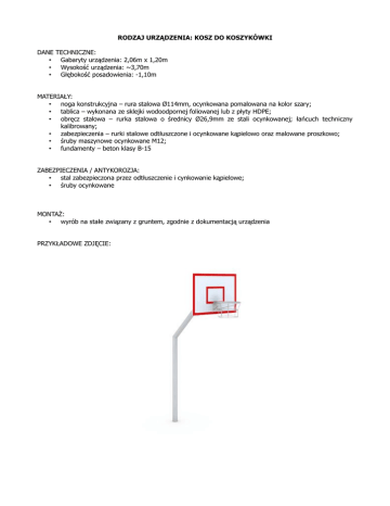 RODZAJ URZĄDZENIA: KOSZ DO KOSZYKÓWKI DANE TECHNICZNE: • Gabaryty urządzenia: 2,06m x 1,20m • Wysokość urządzenia: ~3,70m • Głębokość posadowienia: -1,10m MATERIAŁY: • noga konstrukcyjna – rura stalowa Ø114mm, ocynkowana pomalowana na kolor szary; • tablica – wykonana ze sklejki wodoodpornej foliowanej lub z płyty HDPE; • obręcz stalowa – rurka stalowa o średnicy Ø26,9mm ze stali ocynkowanej; łańcuch techniczny kalibrowany; • zabezpieczenia – rurki stalowe odtłuszczone i ocynkowane kąpielowo oraz malowane proszkowo; • śruby maszynowe ocynkowane M12; • fundamenty – beton klasy B-15 ZABEZPIECZENIA / ANTYKOROZJA: • stal zabezpieczona przez odtłuszczenie i cynkowanie kąpielowe; • śruby ocynkowane MONTAŻ: • wyrób na stałe związany z gruntem, zgodnie z dokumentacją urządzenia PRZYKŁADOWE ZDJĘCIE: