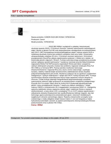 SFT Computers Utworzono: sobota, 27 luty 2016 Foto > aparaty kompaktowe CANON IXUS 285 HS BLK 1076C001AA Nazwa produktu: CANON IXUS 285 HS BLK 1076C001AA Producent: Canon Model produktu: 1076C001AA IXUS 285 HSStyl i wydajność w płaskiej, kieszonkowej obudowie aparatu IXUS z 12-krotnym zoomem. Łatwość wykonywania zadziwiających zdjęć i filmów w jakości Full HD oraz bezproblemowe udostępnianie za pośrednictwem sieci Wi-Fi i NFC.Kompaktowa konstrukcjaWyjątkowo płaski i stylowy aparat IXUS w metalowej obudowie można bez problemu wszędzie nosić przy sobie. Uniwersalny, ultraszerokokątny obiektyw 25 mm z 12-krotnym zoomem optycznym i 24-krotnym powiększeniem ZoomPlus ułatwia rejestrowanie wydarzeń, z bliska lub z daleka, na doskonałej jakości zdjęciach i filmach. Funkcja automatycznego powiększenia pozwala wybrać najlepszy sposób kadrowania ? wystarczy nacisnąć przycisk.Natychmiastowe nagrywanie filmów Full HDTworzenie wspaniałych filmów jest łatwe i przyjemne. Jednym dotknięciem przycisku możesz bez problemu nagrywać atrakcyjne filmy Full HD (1080 p) w formacie MP4. Poznaj szerokie możliwości twórczego eksperymentowania i nagrywaj filmy przy użyciu zoomu optycznego, uzyskując wyraźny, stabilny materiał dzięki dynamicznemu stabilizatorowi obrazu.Szybkie połączeniaUdostępnianie jest proste. Wystarczy połączyć się ze zgodnym urządzeniem inteligentnym ? jednym dotknięciem ? dzięki sieci Wi-Fi i funkcji Dynamic NFC. Funkcja synchronizacji obrazów automatycznie tworzy kopie zapasowe nowych obrazów w chmurze. Z kolei funkcja zdalnego fotografowania bezprzewodowego umożliwia wykonywanie udanych zdjęć grupowych za pośrednictwem urządzenia inteligentnego. Przycisk Wi-Fi to szybki i łatwy skrót do funkcji Wi-Fi.Doskonała jakośćDoskonała jakość i duża szczegółowość obrazów ? nawet przy słabym oświetleniu ? dzięki matrycy CMOS o rozdzielczości 20,2 megapiksela i procesorowi DIGIC 4+. Inteligentny optyczny stabilizator obrazu zapewnia ostrość zdjęć i stabilność filmów w każdych okolicznościach, a duży ekran LCD o przekątnej 7,5 cm (3,0?) ułatwia rejestrowanie i odtwarzanie obrazów.Kreatywność bez wysiłkuWystarczy dotknąć migawki, aby tryb twórczego ujęcia automatycznie przeanalizował ujęcie i utworzył 5 dodatkowych, wyjątkowych obrazów pierwotnego zdjęcia. Rejestruj niesamowite szczegóły życia codziennego z małej odległości dzięki trybowi makro (1 cm) lub fotografuj w trybie hybrydowej automatyki i pozwól, by aparat automatycznie utworzył atrakcyjne filmowe podsumowanie dnia w jakości HD (720p). Cena: 859zł Dostępność: Ten produkt został dodany do sklepu w dniu piątek, 26 luty 2016 http://sft.net.pl | [email protected] | | Strona 1/1