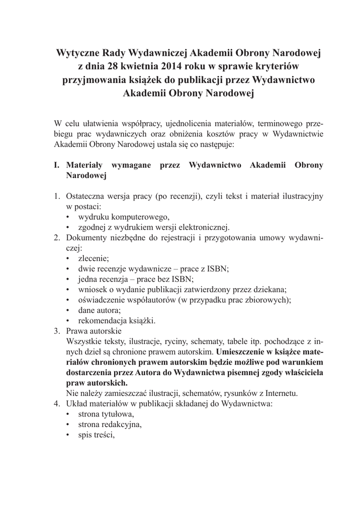 Wytyczne Rady Wydawniczej Akademii Obrony Narodowej z dnia 28 kwietnia 2014 roku w sprawie kryteriów przyjmowania książek do publikacji przez Wydawnictwo Akademii Obrony Narodowej W celu ułatwienia współpracy, ujednolicenia materiałów, terminowego przebiegu prac wydawniczych oraz obniżenia kosztów pracy w Wydawnictwie Akademii Obrony Narodowej ustala się co następuje: I. Materiały wymagane Narodowej przez Wydawnictwo Akademii Obrony 1. Ostateczna wersja pracy (po recenzji), czyli tekst i materiał ilustracyjny w postaci: • wydruku komputerowego, • zgodnej z wydrukiem wersji elektronicznej. 2. Dokumenty niezbędne do rejestracji i przygotowania umowy wydawniczej: • zlecenie; • dwie recenzje wydawnicze – prace z ISBN; • jedna recenzja – prace bez ISBN; • wniosek o wydanie publikacji zatwierdzony przez dziekana; • oświadczenie współautorów (w przypadku prac zbiorowych); • dane autora; • rekomendacja książki. 3. Prawa autorskie Wszystkie teksty, ilustracje, ryciny, schematy, tabele itp. pochodzące z innych dzieł są chronione prawem autorskim. Umieszczenie w książce materiałów chronionych prawem autorskim będzie możliwe pod warunkiem dostarczenia przez Autora do Wydawnictwa pisemnej zgody właściciela praw autorskich. Nie należy zamieszczać ilustracji, schematów, rysunków z Internetu. 4. Układ materiałów w publikacji składanej do Wydawnictwa: • strona tytułowa, • strona redakcyjna, • spis treści, • wykazy skrótów i oznaczeń • wstęp/przedmowa, • tekst główny z przypisami, • załączniki, • bibliografia, • słowniki terminów, • indeksy, • wykazy rysunków, tabel itp., • streszczenia obcojęzyczne. 5. Rekomendacja książki Prosimy Autorów o przygotowanie i dostarczenie (razem z komputeropisem) informacji do internetowego katalogu wydawniczego (objętość do 700 znaków ze spacjami), przedstawiającej tematykę pracy, układ treści, atuty książki wyróżniające ją spośród innych (nowatorstwo, aktualność merytoryczna itp.) wraz ze wskazaniem kategorii, do której książka ma zostać włączona (zob. druk rekomendacji, wykaz kategorii na stronie www.ksiegarnia.aon.edu.pl w zakładce: kategorie książek lub załącznik 2 do niniejszej instrukcji). II. Wskazówki techniczne dotyczące przygotowania materiałów dla Wydawnictwa Tekst • • • • • • • • jednostronny wydruk komputerowy na papierze formatu A4; plik tekstowy w formacie *rtf lub *doc (Word 97 lub wyższy); czcionka 12 punktów Times New Roman (TNR); interlinia 1,5 wiersza; wszystkie marginesy po 2,5 cm; nie należy stosować automatycznych stylów; wielkość wcięć akapitowych 0,6 cm; przypisy tekstowe i bibliograficzne –TNR 10 pt, interlinia pojedyncza, wcięcie akapitowe 0,6 cm, z odnośnikami w indeksie górnym; • ujednolicona i ciągła numeracja stron (paginacja); • wyliczenia – nie więcej niż dwa różne rodzaje punktorów – dla zaznaczenia hierarchii (np. liczby arabskie z nawiasem lub kropką oraz myślniki), nie zaleca się wyliczeń obszerniejszych niż dwustopniowe; • parametry tabel: tekst w tabeli – TNR 10 pt, interlinia pojedyncza; nagłówek tabeli – TNR 10 pt, bold, wyśrodkowane, interlinia pojedyncza; źródło – TNR 9 pt, interlinia pojedyncza; • parametry rysunków: źródło – TNR 9 pt, interlinia pojedyncza; podpis rysunku – TNR 10 pt, bold, wyśrodkowane, interlinia pojedyncza; • w pracach zbiorowych artykuły o ujednoliconym zapisie tytułów, przypisów, bibliografii, cytatów, jednolitej numeracji rysunków i tabel oraz jednolitej skali rysunków. Ilustracje • ryciny przeznaczone do publikacji muszą mieć dobrą jakość, ujednoliconą formę i opisy, dotyczy to szczególnie wielostronicowych wklejek o bardzo różnorodnym materiale ilustracyjnym, do którego wglądówki są podstawą redakcji technicznej i przyspieszają prace nad książką; • każda ilustracja powinna być dostarczona w postaci odrębnego pliku z podaniem jego nazwy (wszystkie pliki zebrane w jednym folderze) i wydruku w tekście lub na osobnej stronie; • fotografie – pliki *tif, *jpg, *pdf o rozdzielczości nie mniejszej niż 300 dpi przy wymaganych wymiarach; • wykresy – wykonane w Corel Draw, Adobe Ilustrator (ewentualnie wyeksportowane jako pliki *pdf) lub Microsoft Excel (jeśli muszą być w trakcie prac poddawane edycji); • rysunki – w postaci plików *cdr, *ai, *jpg, *tiff lub *pdf; • czarno-białe (zapisane w skali szarości), o szerokości nie większej niż 13 cm, rozdzielczości 120 DPI. Dostarczone do drukarni pliki powinny być zgodne z założeniami przyjętymi w piśmie zamawiającym. 1. Pliki można dostarczyć: • na nośnikach danych, • e-mail. 2. Komplet materiałów dostarczonych do drukarni powinien zawierać: • plik PDF, • wydruk jednostronny będący dla drukarni podstawą do opracowania pracy do druku. 3. Grafika wektorowa (logo, godła, flagi, herby, wykresy, schematy, mapy, plany itp.) daje możliwość nieograniczonego powiększania oraz zmniejszania bez utraty ich jakości. Zaleca się dostarczać w formatach plików: PDF, EPS, CDR, AI. 4. Zdjęcia (bitmapy, obraz rastrowy) Zaleca się dostarczać w formatach plików: PDF, TIFF, JPEG z rozdzielczością 300 dpi (pliki otwarte z możliwością naniesienia poprawek). Należy unikać przekazywania do drukarni zdjęć ściągniętych z internetu, gdyż mają one rozdzielczość ekranową 72 dpi. Taka rozdzielczość jest zbyt niska do druku i może niekorzystnie wpłynąć na jakość drukowanych obiektów. 5. Kolorystyka Przekazywane pliki powinny być zapisane w trybie CMYK. Nie powinno stosować się kolorów RGB. W przypadku dostarczenia pracy zawierającej kolory RGB końcowy wydruk może być niezgodny z oczekiwaniami autora. Wydrukowane materiały nie zawsze będą wyglądały jak na monitorze komputera. Wynika to z odmiennej kalibracji samego monitora, jak i z odrębnych trybów kolorystycz