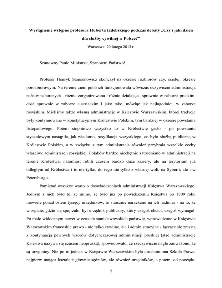 Wystąpienie wstępne profesora Huberta Izdebskiego podczas debaty „Czy i jaki dzień dla służby cywilnej w Polsce?” Warszawa, 20 lutego 2013 r. Szanowny Panie Ministrze, Szanowni Państwo! Profesor Henryk Samsonowicz skończył na okresie rozbiorów czy, ściślej, okresie porozbiorowym. Na terenie ziem polskich funkcjonowała wówczas oczywiście administracja państw zaborczych - różnie zorganizowana i różnie działająca, sprawnie w zaborze pruskim, dość sprawnie w zaborze austriackim i jako tako, mówiąc jak najłagodniej, w zaborze rosyjskim. Mieliśmy także własną administrację w Księstwie Warszawskim, której tradycje były kontynuowane w konstytucyjnym Królestwie Polskim, tym bardziej w okresie powstania listopadowego. Potem stopniowo wszystko to w Królestwie gasło - po powstaniu styczniowym nastąpiła, jak wiadomo, rusyfikacja wszystkiego, co było służbą publiczną w Królestwie Polskim, a w związku z tym administracja również przybrała wszelkie cechy właściwe administracji rosyjskiej. Polaków bardzo niechętnie zatrudniano w administracji na terenie Królestwa, natomiast robili czasem bardzo duże kariery, ale na terytorium już odległym od Królestwa i to nie tylko, do tego nie tylko z własnej woli, na Syberii, ale i w Petersburgu. Pamiętać wszakże warto o doświadczeniach administracji Księstwa Warszawskiego. Jednym z nich było to, że mimo, że było już po powiększeniu Księstwa po 1809 roku niewiele ponad osiem tysięcy urzędników, to strasznie narzekano na ich nadmiar - na to, że wszędzie, gdzie się spojrzało, był urzędnik publiczny, który czegoś chciał, czegoś wymagał. Po mało widocznym nawet w czasach stanisławowskich państwie, wprowadzone w Księstwie Warszawskim francuskie prawo - nie tylko cywilne, ale i administracyjne - łączące się zresztą z kontynuacją pewnych wzorów dotychczasowej administracji pruskiej (stąd administrację Księstwa nazywa się czasem neopruską), spowodowało, że rzeczywiście nagle zauważono, że są urzędnicy. Nie po to jednak w Księstwie Warszawskim była uruchomiona Szkoła Prawa, najpierw mająca kształcić głównie sędziów, ale również urzędników, a potem, od początku 1 połączona ze Szkołą Prawa, Szkoła Nauk Administracyjnych (dająca zresztą początek Wydziałowi Prawa i Administracji utworzonego już w konstytucyjnym Królestwie Polskim Uniwersytetu Warszawskiego), żeby nie kształcić kandydatów na wykwalifikowanych urzędników państwowych. I rzeczywiście, taka kadra była już w latach dwudziestych, trzydziestych XIX w. – i to wykształcona jak na owe czasy bardzo nowocześnie. Szkoła Prawa i Nauk Administracyjnych, a potem Wydział Prawa i Administracji reprezentowały w zakresie nauk administracyjnych poziom odpowiadający temu, co występowało w innych krajach kontynentu europejskiego. Pomijając kwestie państw zaborczych i ich administracji w XIX w., choć właśnie wtedy kształtowały się rozwiązania administracyjne dotąd właściwe dla naszej części Europy, można obecnie przejść do Państwa Polskiego odrodzonego po 123 latach zaborów, dla którego szybko przyjęto nazwę Rzeczpospolita Polska. Dość szybko doszło zatem do uchwalenia ustawy o państwowej służbie cywilnej - ustawy z 17 lutego 1922 roku. W moim przekonaniu, są wszelkie podstawy, żeby właśnie 17 lutego uznać obecnie za dzień Święta Służby Cywilnej. Co więcej, w pewnym sensie jest już wypróbowana prawna możliwość tego jak można wprowadzić coś ważnego bez nadmiernego formalizowania - mianowicie można to uczynić dokładnie na tej samej zasadzie, na jakiej Józef Piłsudski został marszałkiem Polski. W imieniny Józefa przyszli do niego oficerowie i złożyli mu życzenia jako pierwszemu Marszałkowi Rzeczypospolitej, a on te życzenia, już jako Marszałek Rzeczypospolitej, przyjął. Nie miał kto mu nadać stopnia marszałka, dlatego, że on sam był przecież Naczelnikiem Państwa i w związku z tym zadecydował vox populi, a w każdym razie vox militari. Pewnie więc i służba cywilna też może - gratulując swojemu Szefowi z okazji Święta Służby Cywilnej - w ten właśnie sposób wprowadzić swoje święto. To była dygresja, warto natomiast więcej powiedzieć o przedwojennej ustawie o służbie cywilnej. Z jednej strony, był to bardzo porządny akt prawny, obowiązujący - po najróżniejszych zmianach, największych wprowadzonych w 1948 roku - do wejścia w życie Kodeksu pracy, czyli do 1975 roku. Odpowiadał on temu, co w administracji państw uznawanych za dobrze zorganizowane (i to nie tylko pod tym względem) miało wówczas miejsce, przy czym ten model klasycznej, można powiedzieć weberowskiej administracji, 2 opartej na korpusie neutralnych politycznie, profesjonalnych, pełniących swoje funkcje przez wystarczająco długi okres urzędników i niższych funkcjonariuszy (podział ten był wyraźnie zarysowany) oparty był na wzorach austriackich i wzorach pruskich. Trudno zresztą było oczekiwać czerpania z wielu innych wzorów. Kadry administracji odrodzonego Państwa Polskiego mogły szerzej przybyć tylko i wyłącznie - nawet nie przybyć, bo były już na miejscu, chyba że przenosiły się do Warszawy – z zaboru austriackiego, gdyż tam w wyniku repolonizacji administracji, sądownictwa, innych służb publicznych od lat siedemdziesiątych XIX wieku administracja była po prostu polska i absolwenci polskich uniwersytetów we Lwowie i w Krakowie oraz innych coraz bardziej się rozwijających szkół wyższych mieli możliwość znalezienia na miejscu zatrudnienia. Niezależnie od tego, tak jak polscy politycy odgrywali dużą rolę w polityce państwa austriackiego i Austro-Węgier, tak polscy urzędnicy mieli wiele do powiedzenia w ramach instytucji wiedeńskich, by po odzyskaniu niepodległości działać już na rzecz odrodzonego Państwa Polskiego. Dopiero z biegiem czasu zaczęło się pojawiać poko