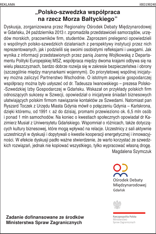 REKLAMA i003190240 „Polsko-szwedzka współpraca na rzecz Morza Bałtyckiego” Dyskusja, zorganizowana przez Regionalny Ośrodek Debaty Międzynarodowej w Gdańsku, 24 października 2013 r. zgromadziła przedstawicieli samorządów, urzędów morskich, pracowników firm, studentów. Zaproszeni prelegenci opowiedzieli o wspólnych polsko-szwedzkich działaniach z perspektywy instytucji przez nich reprezentowanych, jak i podzielili się swoimi osobistymi refleksjami i uwagami. Jak wynika z informacji przedstawionych przez panią Joannę Wojtkowską z Departamentu Polityki Europejskiej MSZ, współpraca między dwoma krajami odbywa się na wielu płaszczyznach, bardzo dobrze rozwija się w zakresie bezpieczeństwa i obrony (szczególnie między marynarkami wojennymi). Do priorytetowej wspólnej inicjatywy można zaliczyć Partnerstwo Wschodnie. O istotnym aspekcie gospodarczej współpracy można było usłyszeć od dr. Tadeusza Iwanowskiego – prezesa Polsko-Szwedzkiej Izby Gospodarczej w Gdańsku. Wskazał on przykłady polskich firm odnoszących sukcesy w Szwecji, opowiedział o inicjatywie śniadań biznesowych ułatwiających polskim firmom nawiązanie kontaktów ze Szwedami. Natomiast pan Ryszard Toczek z Urzędu Miasta Gdynia mówił o połączeniu Gdynia – Karlskrona, dzięki któremu, od 1991 r. aż do dzisiaj, promami przewieziono ok. 6,5 mln osób i ponad 1 mln samochodów. Na koniec o kwestiach społecznych opowiadał dr Kazimierz Musiał z Uniwersytetu Gdańskiego. Wspomniał o różnicach, także dotyczących kultury biznesowej, które mogą wpływać na relacje. Uczestnicy z sali aktywnie uczestniczyli w dyskusji i dopytywali o kwestie kooperacji energetycznej i innowacyjności. W efekcie dyskusji padło ważne stwierdzenie, że warto korzystać ze szwedzkich rozwiązań, jednak nie kopiować wszystkiego, tylko wypracować własną drogę. Magdalena Szymczuk Zadanie dofinansowane ze środków Ministerstwa Spraw Zagranicznych