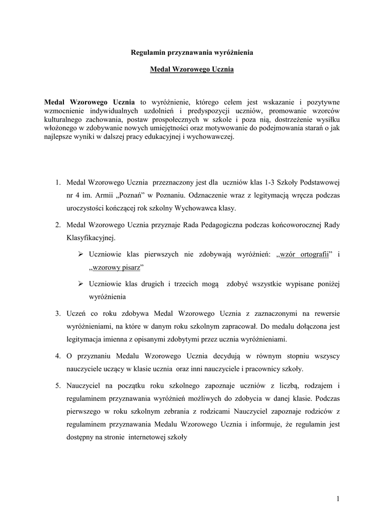 Regulamin przyznawania wyróżnienia Medal Wzorowego Ucznia Medal Wzorowego Ucznia to wyróżnienie, którego celem jest wskazanie i pozytywne wzmocnienie indywidualnych uzdolnień i predyspozycji uczniów, promowanie wzorców kulturalnego zachowania, postaw prospołecznych w szkole i poza nią, dostrzeżenie wysiłku włożonego w zdobywanie nowych umiejętności oraz motywowanie do podejmowania starań o jak najlepsze wyniki w dalszej pracy edukacyjnej i wychowawczej. 1. Medal Wzorowego Ucznia przeznaczony jest dla uczniów klas 1-3 Szkoły Podstawowej nr 4 im. Armii „Poznań” w Poznaniu. Odznaczenie wraz z legitymacją wręcza podczas uroczystości kończącej rok szkolny Wychowawca klasy. 2. Medal Wzorowego Ucznia przyznaje Rada Pedagogiczna podczas końcoworocznej Rady Klasyfikacyjnej. Uczniowie klas pierwszych nie zdobywają wyróżnień: ,,wzór ortografii” i ,,wzorowy pisarz” Uczniowie klas drugich i trzecich mogą zdobyć wszystkie wypisane poniżej wyróżnienia 3. Uczeń co roku zdobywa Medal Wzorowego Ucznia z zaznaczonymi na rewersie wyróżnieniami, na które w danym roku szkolnym zapracował. Do medalu dołączona jest legitymacja imienna z opisanymi zdobytymi przez ucznia wyróżnieniami. 4. O przyznaniu Medalu Wzorowego Ucznia decydują w równym stopniu wszyscy nauczyciele uczący w klasie ucznia oraz inni nauczyciele i pracownicy szkoły. 5. Nauczyciel na początku roku szkolnego zapoznaje uczniów z liczbą, rodzajem i regulaminem przyznawania wyróżnień możliwych do zdobycia w danej klasie. Podczas pierwszego w roku szkolnym zebrania z rodzicami Nauczyciel zapoznaje rodziców z regulaminem przyznawania Medalu Wzorowego Ucznia i informuje, że regulamin jest dostępny na stronie internetowej szkoły 1 6. Wychowawca klasy jest zobowiązany do systematycznego monitorowania za pomocą tabeli postępów i osiągnięć dziecka. Rodzic ma możliwość wglądu w tabelę podczas każdego zebrania z rodzicami. 7. Medal Wzorowego Ucznia, jako szczególne wyróżnienie, przyznawany jest zgodnie z Regulaminem przez Radę Pedagogiczną z rozwagą i należytą powagą i nie może być traktowana jako nagroda za jednorazowe, sporadyczne lub wybiórcze zachowanie, czy osiągnięcie ucznia. Na przyznane i zaznaczone na Medalu Wzorowego Ucznia wyróżnienie uczeń pracuje systematycznie w ciągu całego roku szkolnego. Decyzja Rady Pedagogicznej o przyznaniu lub odrzuceniu wyróżnienia jest nieodwołalna. Regulamin przyznawania nagrody Tarcza Wzorowego Ucznia w roku szkolnym 2016/2017 Tarcza Wzorowego Ucznia to odznaka, której celem jest nagrodzenie uczniów zdobywających najlepsze wyniki w zakresie edukacji i zachowania. 1. Tarcza Wzorowego Ucznia przyznawana jest uczniom klas trzecich Szkoły Podstawowej nr 4 im. Armii „Poznań” w Poznaniu. Odznaczenie wraz z legitymacją wręcza podczas uroczystości kończącej rok szkolny Dyrektor szkoły. 2. Informacja o zdobyciu przez ucznia Tarczy Wzorowego Ucznia zamieszczana jest na świadectwie szkolnym jako szczególne osiągnięcie. 3. Brązową, Srebrną i Złotą Tarczę Wzorowego Ucznia przyznaje Rada Pedagogiczna podczas końcoworocznej rady klasyfikacyjnej. Brązową Tarczę Wzorowego Ucznia zdobywa absolwent klasy trzeciej, który: 1. jeden raz, w trzyletnim cyklu edukacyjnym, został laureatem szkolnego konkursu (zajął pierwsze, drugie lub trzecie miejsce), 2. zdobył od 25 do 28 wyróżnień w ciągu trzech lat edukacji 3. wzorowo wywiązuje się z obowiązków szkolnych, osiąga wysokie wyniki w nauce, zawsze odrabia zadania domowe i przygotowuje się do zajęć. 4. wyróżnia się w szkole i poza nią wysoką kulturą osobistą, 2 5. wyróżnia się systematycznością i punktualnością 6. nie ma żadnych godzin nieusprawiedliwionych, żadnych spóźnień, a nieobecności są uzasadnione, Srebrną Tarczę Wzorowego Ucznia zdobywa absolwent klasy trzeciej, który: 1. 3 razy, w trzyletnim cyklu edukacyjnym, został laureatem szkolnego konkursu (zajął pierwsze, drugie lub trzecie miejsce), 2. zdobył od 28 do 31 wyróżnień, w ciągu trzech lat edukacji 3. wzorowo wywiązuje się z obowiązków szkolnych, osiąga wysokie wyniki w nauce, zawsze odrabia zadania domowe i przygotowuje się do zajęć. 4. w szkole i poza nią odznacza się wysoką kulturą osobistą, 5. wyróżnia się systematycznością i punktualnością 6. nie ma żadnych godzin nieusprawiedliwionych, żadnych spóźnień, a nieobecności są uzasadnione, Złotą Tarczę Wzorowego Ucznia zdobywa absolwent klasy trzeciej, który: 1. jeden raz, w trzyletnim cyklu edukacyjnym, został laureatem międzyszkolnego konkursu (zajął pierwsze, drugie lub trzecie miejsce), 2. trzy razy został laureatem szkolnego konkursu (zajął pierwsze, drugie lub trzecie miejsce), 3. zdobył od 32 do 34wyróżnień 4. wzorowo wywiązuje się z obowiązków szkolnych, osiąga wysokie wyniki w nauce, zawsze odrabia zadania domowe i przygotowuje się do zajęć. 5. wyróżnia się w szkole i poza nią wysoką kulturą osobistą, 6. wyróżnia się systematycznością i punktualnością 7. nie ma żadnych godzin nieusprawiedliwionych, żadnych spóźnień, a nieobecności są uzasadnione 8. O wyróżnieniu decydują w równym stopniu wszyscy nauczyciele uczący w klasie ucznia oraz inni nauczyciele i pracownicy szkoły. Wychowawca typuje kandydatów do 3 wyróżnienia i swoją propozycję przedkłada Radzie Pedagogicznej. Rada Pedagogiczna aprobuje lub odrzuca wskazane kandydatury. Regulamin przyznawania nagrody szczególnej Prymusik Szkoły Podstawowej nr 4 im. Armii ,,Poznań” Prymusik Szkoły Podstawowej nr 4 im. Armii ,,Poznań” w Poznaniu jest szczególnym wyróżnieniem przyznawanym przez Dyrektora szkoły uczniowi kończącemu pierwszy etap nauki. Jest to forma zwieńczenia jego osiągnięć i zasług w dziedzinie edukacji i wzorowego zachowania na poziomie edukacji wczesnoszkolnej. Jej celem jest promowanie uczniów szczególnie uzdolnionych i wyróżniaj