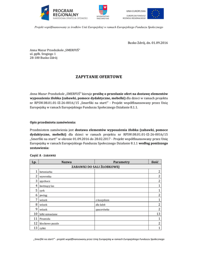 Projekt współfinansowany ze środków Unii Europejskiej w ramach Europejskiego Funduszu Społecznego Busko Zdrój, dn. 01.09.2016 Anna Mazur Przedszkole „SMERFUŚ” ul. ppłk. Srogiego 1 28-100 Busko-Zdrój ZAPYTANIE OFERTOWE Anna Mazur Przedszkole „SMERFUŚ” kieruje prośbę o przesłanie ofert na dostawę elementów wyposażenia żłobka (zabawki, pomoce dydaktyczne, mebelki) dla dzieci w ramach projektu nr RPSW.08.01.01-IZ-26-0016/15 „Smerfiki na start!” - Projekt współfinansowany przez Unię Europejską w ramach Europejskiego Funduszu Społecznego Działanie 8.1.1. Opis przedmiotu zamówienia: Przedmiotem zamówienia jest dostawa elementów wyposażenia żłobka (zabawki, pomoce dydaktyczne, mebelki) dla dzieci w ramach projektu nr RPSW.08.01.01-IZ-26-0016/15 „Smerfiki na start!” w okresie 01.09.2016 do 28.02.2017 - Projekt współfinansowany przez Unię Europejską w ramach Europejskiego Funduszu Społecznego Działanie 8.1.1 według poniższego zestawienia: Część A - ZABAWKI Lp. 1 2 3 4 5 6 7 8 9 10 11 12 13 Nazwa Parametry ZABAWKI DO SALI ŻŁOBKOWEJ betoniarka wywrotka spychacz kwitnący las cyrk pociąg wózek z koszykiem wózek dla lalek wózek spacerówka lalki szmaciane Piramida klockowe puzzle rybki ilość 2 2 2 1 1 2 1 2 2 13 1 2 1 „Smerfiki na start!” - projekt współfinansowany przez Unię Europejską w ramach Europejskiego Funduszu Społecznego Projekt współfinansowany ze środków Unii Europejskiej w ramach Europejskiego Funduszu Społecznego 2 2 2 1 1 14 15 16 17 18 klocki twini 1 2 3 4 5 6 7 8 9 10 11 zestaw do budowania zamków 1 zestaw z ciężarówką wózek z zabawkami do piaski 1 1 wywrotka z akcesoriami 2 przyczepa z kompletem 2 zestaw z taczkami 2 wywrotka 1 big koparka 2 Zestaw – lody 2 zestaw łódki 2 zestaw do piachu haba 1 klocki kostka lustrzanka taca zestaw obiadowy dla lalek 12 elementów stanowisko kierowcy ZABAWKI DO PIASKOWNICY Część B - MEBELKI l.p. Wyszczególnienie Parametry 1 krzesełko 2 wielofunkcyjne krzesełko do karmienia dostosowane dla dzieci w wieku żłobkowym krzesełko ze stolikiem, dostosowane dla dzieci w wieku żłobkowym 6 – kątny, dostosowane dla dzieci w wieku żłobkowym 3 4 5 6 7 8 9 10 11 12 13 14 15 16 17 18 19 20 21 stolik Ilość 15 7 1 stolik dostosowane dla dzieci w wieku żłobkowym 1 stolik dostosowane dla dzieci w wieku żłobkowym 1 łóżeczko dostosowane dla dzieci w wieku żłobkowym przybornik do łóżeczka leżak komplet pościeli 7 15 55x150x11 pościel, prześcieradło, ochraniacz 8 15 wkład do pościeli 15 wózek na leżaki 1 przewijak 1 szafka pod przewijak 1 szafka pościelowa 1 regał szatniowy 1 apteczka 1 szafka ubraniowa 1 Szafka RTV 1 bujaczki 5 materac do łóżeczek 15 zestaw mebli dostosowane dla dzieci w wieku żłobkowym 1 Część C - POMOCE DYDAKTYCZNE „Smerfiki na start!” - projekt współfinansowany przez Unię Europejską w ramach Europejskiego Funduszu Społecznego Projekt współfinansowany ze środków Unii Europejskiej w ramach Europejskiego Funduszu Społecznego l.p. 1 2 3 4 5 6 7 8 9 10 11 12 13 14 Wyszczególnienie marchewka jeż wieża jeździk manipulacyjny labirynty manipulacyjne labirynty manipulacyjne labirynty manipulacyjne nakładanka z uchwytem puzzle piramidki klaun panel kształty manipulacyjny pociąg drewniane puzzle Parametry MAŁA MOTORYKA 80x40 zabawne przygody galimatias express Ilość 2 2 2 2 2 2 1 4 10 1 2 1 1 3 DUŻA MOTORYKA 1 materace narożne żółty, turkus, niebieski, róż 2 kolorowy płotek Komplet 6 szt. 3 wirująca kryjówka 4 woreczki żabki Komplet 6 szt. 5 woreczki żabki komplet misie/żabka 6 piłki fakturowe Komplet 6 szt. 7 wózek do piłki 8 mega tarcza 9 piłki elastyczne 10 rozgwiazdy 11 kolorowa rzeka 12 wyspa do rzeki 1 zestaw pędzli w.1 zestaw pędzli w.2 kubeczki do farb farba kredki woskowe kredki woskowe kredki woskowe kredki woskowe nożyczki z tworzywa zestaw kreatywny zestaw kreatywny zestaw kreatywny papier wytłaczany samoprzylepne oczy samoprzylepne oczy samoprzylepne oczy karbowana suszarka do prac wyprawka kreatywna zestaw stolikowy kredek bambino kredki bambino wkład z kolorowego papieru filc kolorowy klej do filcu masa do modelowania papier ksero 4 2 3 2 2 2 2 2 5 2 2 1 ROZWÓJ ARTYSTYCZNY 2 3 4 5 6 7 8 9 10 11 12 13 14 15 16 17 18 19 20 21 22 23 24 25 3 Komplet 6 szt. Komplet 1 Komplet 2 Komplet 3 Komplet 4 twórczy wiosenny Boże Narodzenie metaliczny małe czarne 1200szt. kolorowe 1000szt. ekonomiczny zestaw 3 3 3 2 2 2 3 15 2 2 2 3 1 1 1 3 2 2 1 2 10 10 3 1 „Smerfiki na start!” - projekt współfinansowany przez Unię Europejską w ramach Europejskiego Funduszu Społecznego Projekt współfinansowany ze środków Unii Europejskiej w ramach Europejskiego Funduszu Społecznego 26 koszulki A4 2 ROZWÓJ ARTYSTYCZNY 1 2 3 4 5 6 7 8 9 10 11 12 13 kolorowe zwierzątka memory Zabawki - zestaw do rozw. artystycznego kolory- zestaw do rozw. artystycznego domino zabawa w chowanego Nakładanka - 1 rodzaj Nakładanka - 2 rodzaj zwierzątka kolorowa wieża palety zwierząt nakładanka tęczowa kostka safari kostka wiejska zagroda zestaw 200 szt. 240 szt. 1 1 1 1 1 1 1 4 1 2 3 2 3 ROZWÓJ SENSORYCZNY 1 2 3 4 5 6 zestaw piłeczek dyski z fakturami wałki sensoryczne klocki magiczny sześcian dotykowa zgadywanka 20 szt. 3 szt. 16 szt 1 1 1 1 1 2 1. Zamawiający przewiduje zamówienia uzupełniające stanowiące nie więcej niż 50 % wartości zamówienia podstawowego. 2. Dopuszcza się możliwość składania ofert częściowych na poszczególne części A-C. 3. Zamawiający dopuszcza składanie ofert równoważnych, gdy w opisie przedmiotu zamówienia użyto nazwy wskazującej na producenta danego towaru, rozumie się przez to produkt przykładowy a Zamawiający dopuszcza złożenie oferty równoważnej (produkt równoważny) o innej nazwie pod warunkiem, że posiadać one będą te właściwości, co produkty podane przykładowo. 4. Wszystkie artykuły przeznaczone są dla dzieci w wieku 0-3 l