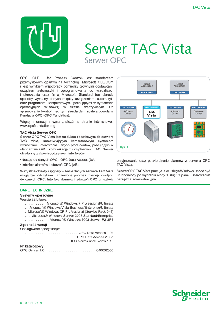 TAC Vista Serwer TAC Vista Serwer OPC OPC (OLE for Process Control) jest standardem przemysłowym opartym na technologii Microsoft OLE/COM i jest wynikiem współpracy pomiędzy głównymi dostawcami urządzeń automatyki i oprogramowania do wizualizacji i sterowania oraz firmą Microsoft. Standard ten określa sposoby wymiany danych między urządzeniami automatyki oraz programami komputerowymi (pracującymi w systemach operacyjnych Windows) w czasie rzeczywistym. Do sprawowania kontroli nad tym standardem została powołana Fundacja OPC (OPC Fundation). Trend Application Report Application OPC Client OPC Client OPC Server OPC Server OPC Server OPC Server Software Driver TAC Vista Software Driver Software Driver Więcej informacji można znaleźć na stronie internetowej: www.opcfoundation.org. TAC Vista Serwer OPC Serwer OPC TAC Vista jest modułem dodatkowym do serwera TAC Vista, umożliwiającym komputerowym systemom wizualizacji i sterowania innych producentów, pracującym w standardzie OPC, komunikację z urządzeniami TAC. Serwer składa się z dwóch oddzielnych interfejsów: • dostęp do danych OPC - OPC Data Access (DA) • interfejs alarmów i zdarzeń OPC (AE) Rys. 1 przyjmowanie oraz potwierdzenie alarmów z serwera OPC TAC Vista. Wszystkie obiekty i sygnały w bazie danych serwera TAC Vista Serwer OPC TAC Vista pracuje jako usługa Windows i może być mogą być odczytane i zmienione poprzez interfejs dostępu uruchomiony po wybraniu ikony ‘Usługi’ z panelu sterowania/ do danych OPC. Interfejs alarmów i zdarzeń OPC umożliwia narzędzia administracyjne. DANE TECHNICZNE Systemy operacyjne Wersje 32-bitowe: . . . . . . . . . . . . Microsoft® Windows 7 Professional/Ultimate . . . Microsoft® Windows Vista Business/Enterprise/Ultimate . . Microsoft® Windows XP Professional (Service Pack 2–3) . . . . Microsoft® Windows Serwer 2008 Standard/Enterprise . . . . . . . . . . . . . . Microsoft® Windows 2003 Serwer R2 SP2 Zgodność wersji Obsługiwane specyfikacje: . . . . . . . . . . . . . . . . . . . . . . . . . . . . . OPC Data Access 1.0a . . . . . . . . . . . . . . . . . . . . . . . . . . . . OPC Data Access 2.05a . . . . . . . . . . . . . . . . . . . . . . . . OPC Alarms and Events 1.10 Nr katalogowy OPC Server 1.6 . . . . . . . . . . . . . . . . . . . . . . . . . . . . 000882550 03-00061-05-pl Prawa autorskie © 2008-2010, Schneider Electric Wszystkie wymienione w dokumencie marki, znaki towarowe i zarejestrowane znaki towarowe są własnością odpowiednich firm i instytucji. Informacje zawarte w tym dokumencie mogą ulec zmianie bez uprzedniego powiadomienia. Wszelkie prawa zastrzeżone. 03-00061-05-pl 2010.03 Więcej informacji na www.schneider-electric.com/buildings