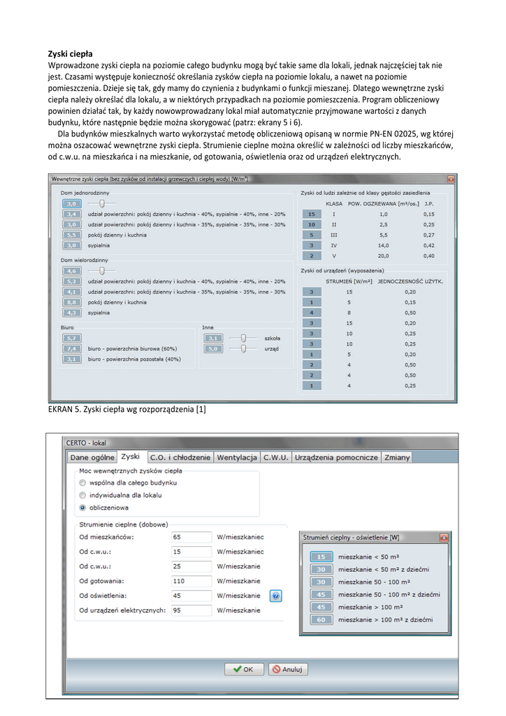 Zyski ciepła Wprowadzone zyski ciepła na poziomie całego budynku mogą być takie same dla lokali, jednak najczęściej tak nie jest. Czasami występuje konieczność określania zysków ciepła na poziomie lokalu, a nawet na poziomie pomieszczenia. Dzieje się tak, gdy mamy do czynienia z budynkami o funkcji mieszanej. Dlatego wewnętrzne zyski ciepła należy określać dla lokalu, a w niektórych przypadkach na poziomie pomieszczenia. Program obliczeniowy powinien działać tak, by każdy nowowprowadzany lokal miał automatycznie przyjmowane wartości z danych budynku, które następnie będzie można skorygować (patrz: ekrany 5 i 6). Dla budynków mieszkalnych warto wykorzystać metodę obliczeniową opisaną w normie PN-EN 02025, wg której można oszacować wewnętrzne zyski ciepła. Strumienie cieplne można określić w zależności od liczby mieszkańców, od c.w.u. na mieszkańca i na mieszkanie, od gotowania, oświetlenia oraz od urządzeń elektrycznych. EKRAN 5. Zyski ciepła wg rozporządzenia [1] EKRAN 6. Zyski ciepła wg PN-EN 02025 Trzeba jednak pamiętać, że dla dużych lokali mieszkalnych powinna być możliwość korekty ww. wartości na poziomie pomieszczenia. Trudno przecież przyjąć np. zyski od gotowania dla pokoi poddasza, na którym nie ma kuchni. Dla lokali niemieszkalnych dochodzi jeszcze jedna możliwość kształtowania strumieni zysków ciepła, które określa się na poziomie pomieszczenia. Następnie należy określić parametry instalacji: c.o., chłodzenia, wentylacji, ciepłej wody oraz oświetlenia na poziomie lokalu. Ogrzewanie, wentylacja i chłodzenie. Przy określaniu wskaźnika nieodnawialnej energii pierwotnej EP = QP/Af należy obliczyć energię pierwotną: QP = QP,H + QP,W + QP,C [kWh/a] gdzie: QP,H = wH · QK,H + wel · Eel,pom,H [kWh/a], QP,W = wW · QK,W + wel · Eel,pom,W [kWh/a], QP,W = wC · QK,C + wel · Eel,pom,C [kWh/a]. TABELA 3. Współczynniki do obliczenia energii pierwotnej QP,H roczne zapotrzebowanie energii pierwotnej przez system grzewczy i wentylacyjny kWh/a do ogrzewania i wentylacji QP,W roczne zapotrzebowanie energii pierwotnej przez system do podgrzania ciepłej wody kWh/a QK,H roczne zapotrzebowanie energii końcowej przez system grzewczy i wentylacyjny do ogrzewania i wentylacji kWh/a QK,W roczne zapotrzebowanie energii końcowej przez system do podgrzania ciepłej wody kWh/a Eel,pom,H roczne zapotrzebowanie energii elektrycznej końcowej do napędu urządzeń kWh/a pomocniczych systemu ogrzewania i wentylacji Eel,pom,W roczne zapotrzebowanie energii elektrycznej końcowej do napędu urządzeń kWh/a pomocniczych systemu ciepłej wody Wi współczynnik nakładu nieodnawialnej energii pierwotnej na wytworzenie i dostarczenie nośnika energii (lub energii) końcowej do ocenianego budynku (wel, wH, wW), który określa dostawca energii lub nośnika energii; (wel – dotyczy energii elektrycznej, wH – dotyczy ciepła dla ogrzewania, wW – dotyczy ciepła do przygotowania ciepłej wody użytkowej) Wskaźnik nieodnawialnej energii pierwotnej Olej opałowy Gaz ziemny Propan - butan Paliwa Węgiel kamienny Węgiel brunatny biomasa energia słoneczne energia nieodnawialna ciepło scentralizowane z kogeneracji energia odnawialna energia z węgla Ciepło scentralizowane z ciepłowni energia z gazu lub oleju wi 1,1 1,1 1,1 1,1 1,1 0,2 0 0,8 0,15 1,3 1,2 Energia elektryczna system PV Energia elektryczna* Ogniwa fotowoltaniczna 0,7 3 Opis użytych we wzorach współczynników podano w tabeli 3. Współczynniki nakładu nieodnawialnej energii pierwotnej wi na wytworzenie i dostarczenie nośnika energii lub energii do budynku – podano w tabeli 4. Sprawność na c.o. i wentylację. Sprawność systemu grzewczego składa się ze sprawności składowych: η = η H,g * η H,d * η H,s * η H,e, η H,g - sprawność wytwarzania, η H,d - sprawność przesyłania (transportu) ciepła, η H,s - sprawność akumulacji ciepła (magazynowania) grzewczego, η H,e - sprawność wykorzystania i regulacji ciepła przyjmowana. Sprawności te można przyjmować z tabel zawartych w rozporządzeniu [1] lub na podstawie danych producentów urządzeń grzewczych. Należy jednak pamiętać, że wartości podawane przez producentów w DTR-kach oznaczają sprawność znormalizowaną, podawaną przy optymalnym obciążeniu kotła. Sprawność ta jest jednak zmienna w okresie grzewczym i zależy od wielu czynników (patrz rys. 1 i 2). RYS. 1. Obciążenie kotła w przykładowym sezonie grzewczym RYS. 2. Znormalizowana sprawność różnych kotłów w zależności od obciążenia Sprawność znormalizowana jest zazwyczaj o około 10-15% wyższa od średniorocznej sprawności wytwarzania, jaką należy wprowadzić do obliczeń. Jeżeli producent podaje sprawność wytwarzania 109%, to należy liczyć się z tym, że sprawność średnioroczna będzie niższa o co najmniej 10% i wyniesie 99%. W celu określenia sprawności instalacji grzewczej można wartość taką obliczyć według metodologii określonej w rozporządzeniu ws. metodologii [1] lub przyjąć ją zgodnie z tabelami zamieszczonymi w tym samym rozporządzeniu (patrz ekrany 7-10 oraz proponowany do zestawiania potrzebnych danych formularz 2). EKRAN 7. Średnioroczna sprawność wytwarzania η H,g, zgodnie z rozporządzeniem [1] EKRAN 8. Sprawność przesyłania (transportu) ciepła – ηH,d [1] EKRAN 9. Sprawność akumulacji ciepła (magazynowania) grzewczego – ηH,s EKRAN 10. Sprawność wykorzystania i regulacji ciepła przyjmowana – ηH,e FORMULARZ 2. WYMAGANE DANE DO CHRAKTERYSTYKI: 1 2 rodzaj paliwa współczynnik nieodnawialnej energii pierwotnej udział procentowy paliwa typ kotła η H,g - sprawność wytwarzania η H,d - sprawność przesyłania 3 4 η H,s - sprawność akumulacji η H,e - sprawność wykorzystania i regulacji Dla nowych budynków w większości przypadków można przyjąć, że sprawności instalacji c.o. wynoszą : η H,d - sprawność przesyłania (tr