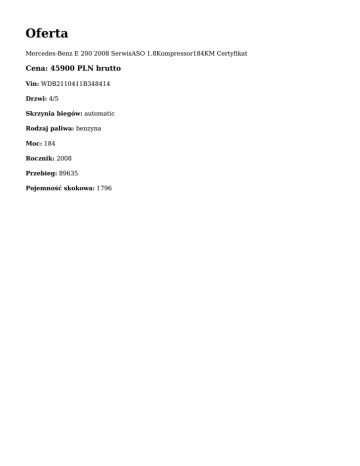 Oferta Mercedes-Benz E 200 2008 SerwisASO 1.8Kompressor184KM Certyfikat Cena: 45900 PLN brutto Vin: WDB2110411B348414 Drzwi: 4/5 Skrzynia biegów: automatic Rodzaj paliwa: benzyna Moc: 184 Rocznik: 2008 Przebieg: 89635 Pojemność skokowa: 1796 Opis: Auto-Handel-Centrum Krotoski-Cichy Autoryzowany Dealer VW Audi Seat Skoda Opel GWARANCJA POCHODZENIA MOŻLIWOŚĆ SPRAWDZENIA POJAZDU W STACJI OBSŁUGI. MOŻLIWOŚĆ POZOSTAWIENIA SWOJEGO SAMOCHODU UŻYWANEGO W ROZLICZENIU -----------------------------------------------------------------------------------------------------------------------------------------------------Uwaga: Miejsce ekspozycji pojazdu - Grupa Krotoski-Cichy Salon Pojazdów Używanych Wysogotowo, ul. Skórzewska 8 Osoba kontaktowa tel: Maximilian Gera - 609 790 272 Łukasz Grześkowiak - 601 383 710 Mariusz Kowalewski - 609 795 053 Możliwa jazda próbna po wcześniejszym uzgodnieniu terminu -----------------------------------------------------------------------------------------------------------------------------------------------------Mercedes E200 1.8 Kompressor Przebieg: 89 635 km Automatyczna skrzynia biegów Pojazd posiada pełną dokumentację serwisową potwierdzającą przebieg Regularnie serwisowany w ASO Mercedes-Benz - książki serwisowe Pojazd posiada certyfikat oceny stanu technicznego Wyposażenie: ABS Czujnik deszczu Immobiliser Komputer pokładowy Poduszki powietrzne System nawigacji Wspomaganie układu kierowniczego Czujniki parkowania przednie i tylne Elektryczne lusterka Kierownica wielofunkcyjna Fabryczne radio CD Światła przeciwmgłowe Elektryczne sterowanie szyb Tempomat Alufelgi Centralny zamek Klimatyzacja ESP - elektroniczny układ stabilizacji toru jazdy Podgrzewane fotele przednie z trzystopniową regulacją Podłokietnik przedni oraz tylny Lakier metaliczny i inne -----------------------------------------------------------------------------------------------------------------------------------------------------Oferujemy kompleksową obsługę sprzedaży ratalnej na bardzo dogodnych warunkach - w celu bliższego zapoznania się z aktualną ofertą finansowania prosimy o kontakt : Łukasz Grześkowiak - 601 383 710 Katarzyna Świątkiewicz - 609 562 980 Oferujemy ubezpieczenia samochodowe z wiodących na rynku ubezpieczalni - możliwość zakupu pakietu ubezpieczeniowego na miejscu. Oferujemy możliwość jazdy próbnej przed zakupem oraz usługę inspekcji pojazdu. Przyjmujemy również w rozliczeniu każdy pojazd. -----------------------------------------------------------------------------------------------------------------------------------------------------Ogłoszenie ma charakter informacyjny i stanowi zaproszenie do zawarcia umowy (art. 71 Kodeksu cywilnego); nie stanowi natomiast oferty handlowej w rozumieniu art. 66 § 1 Kodeksu cywilnego. W celu sprawdzenia zgodności oferty oraz uzyskania wszelkich informacji prosimy kontaktować się z handlowcem d.s. samochodów używanych Auto możesz zobaczyć: